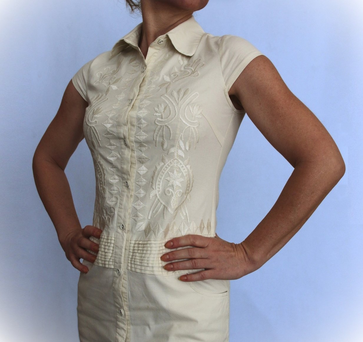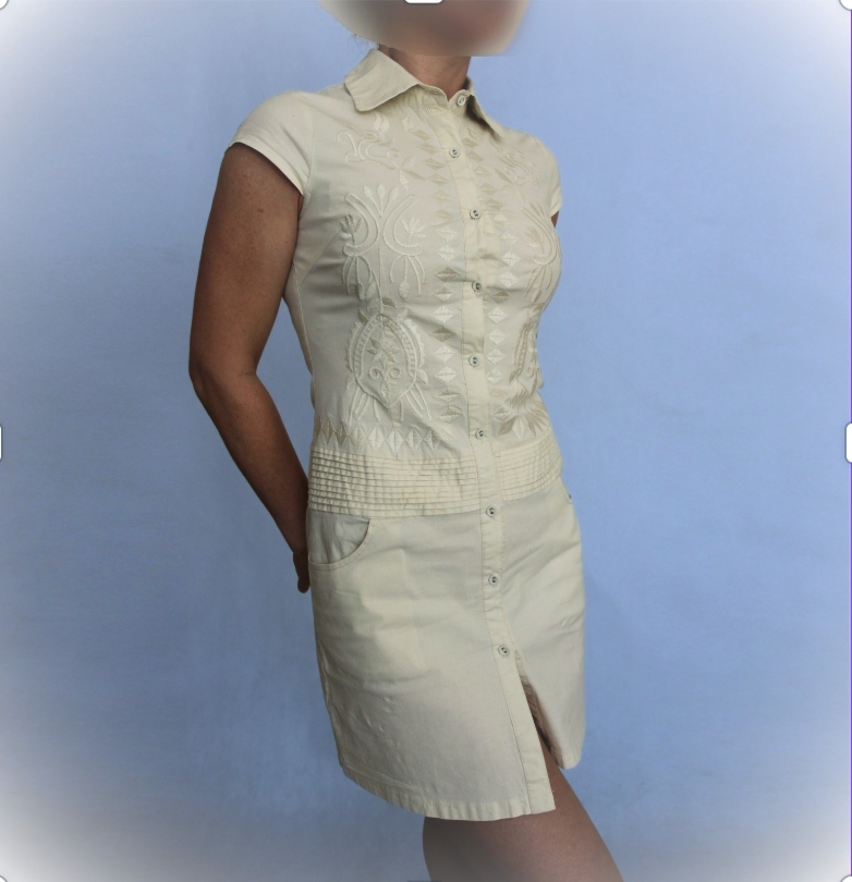 Letné priliehavé prepínacie minišaty v svetložltej až krémovej - vanilkovej farbe. Materiál je pružná tkanina, 97% bavlna, 3% elastan. Má zaujímavé, starostlivo vypracované detaily - rady sámikov niže pása, vrecká, predné diely sú bohato vyšívané. Veľkosť je označená S/M. Podľa môjho názoru je to skôr XS-S, pretože na postavu 38 už sú príliš malé. Rozmery bez natiahnutia: dĺžka 84 cm, obvod hrudníka 82 cm, obvod pása 74 cm, obvod bokov 90-92 cm. Šaty sú v perfektnom stave, nosené pár kr8t. Pošlem ich poštou, Bal9koboxom alebo Packetou, cenu poštovného vám oznámim vopred.