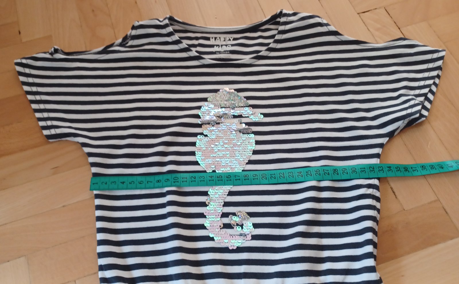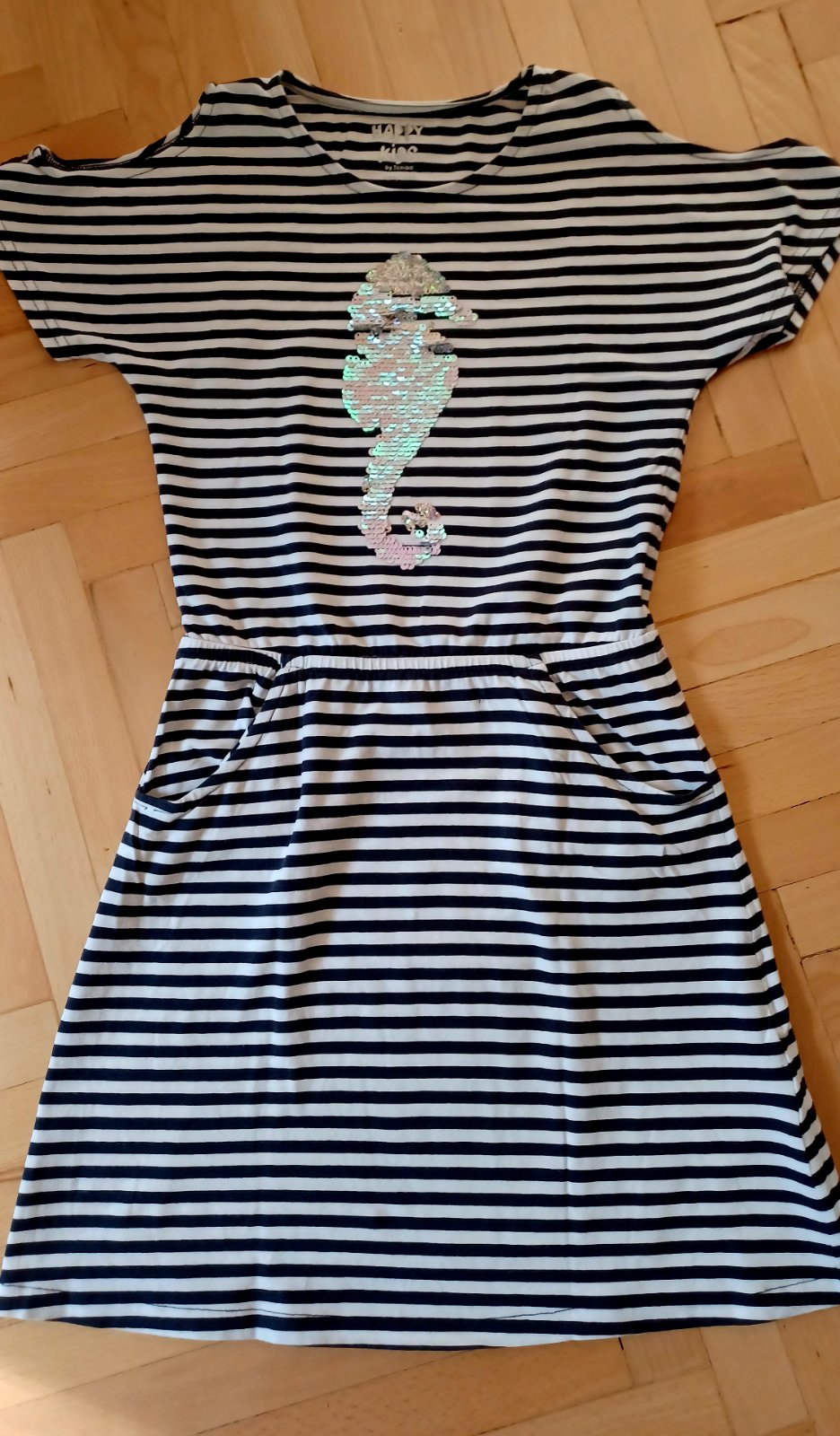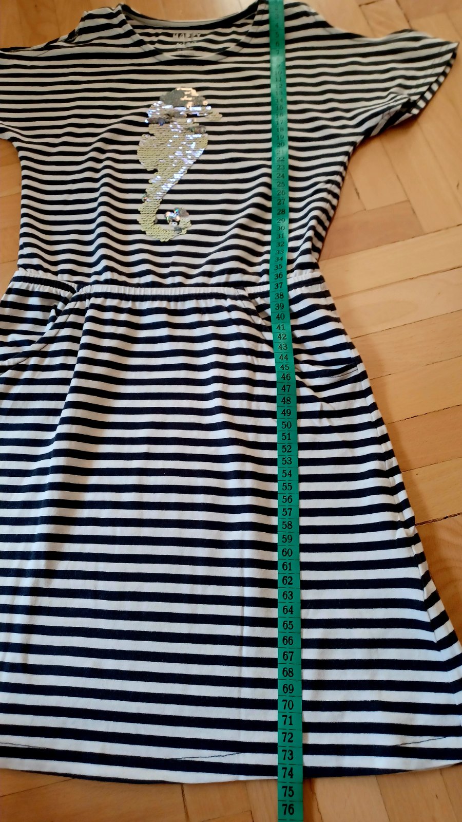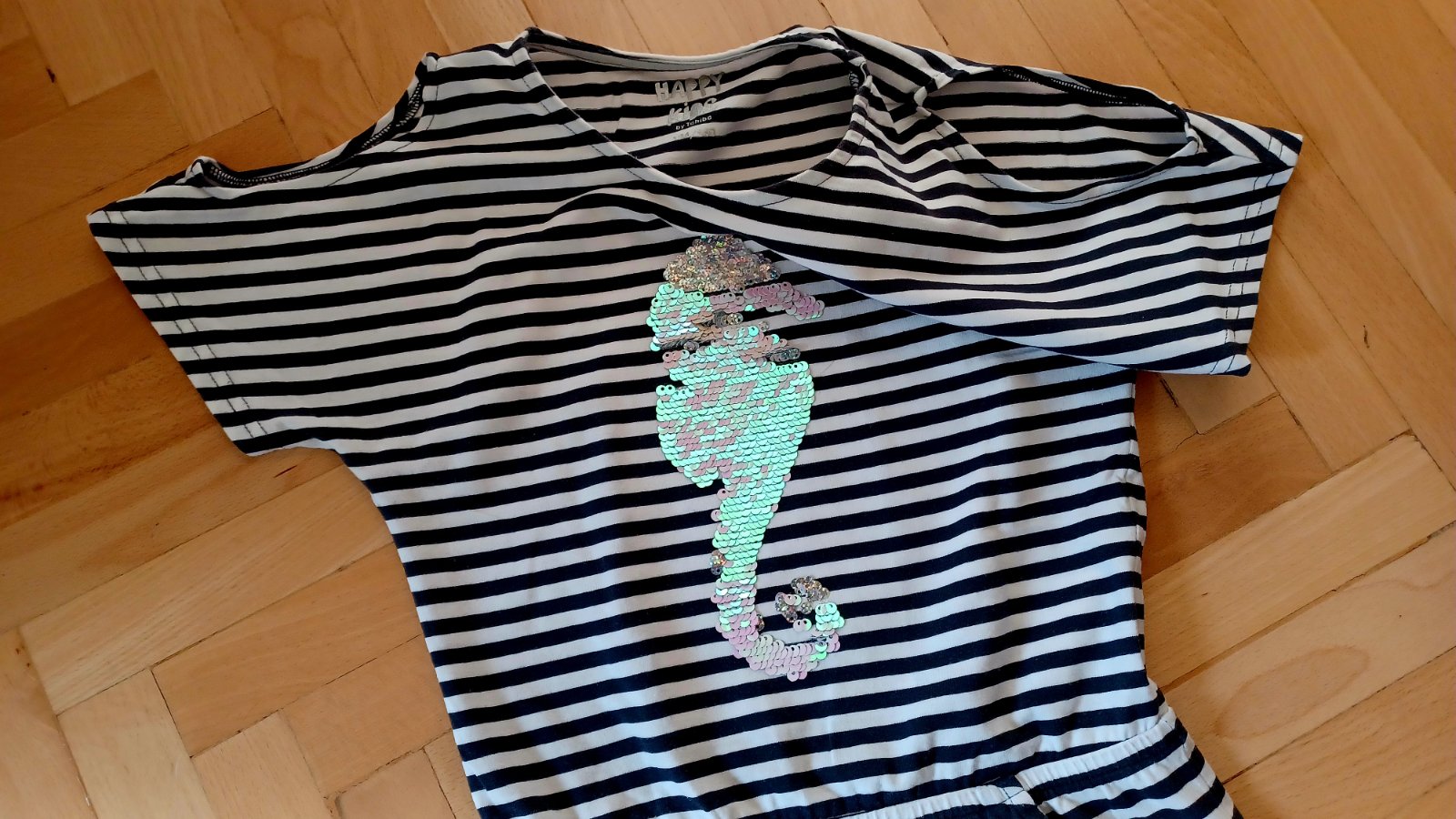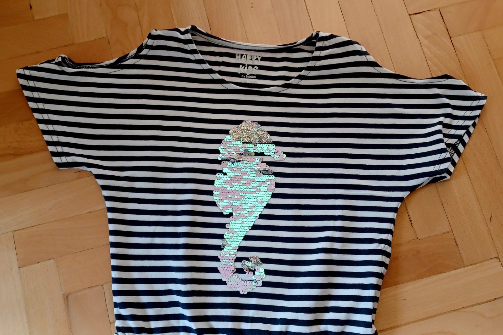 Pohodlné, bavlnené šaty Tchibo, 134/140. Kvalitné, krásne, s premieňacím flitrovým obrázkom. Rozmery na fotkách.