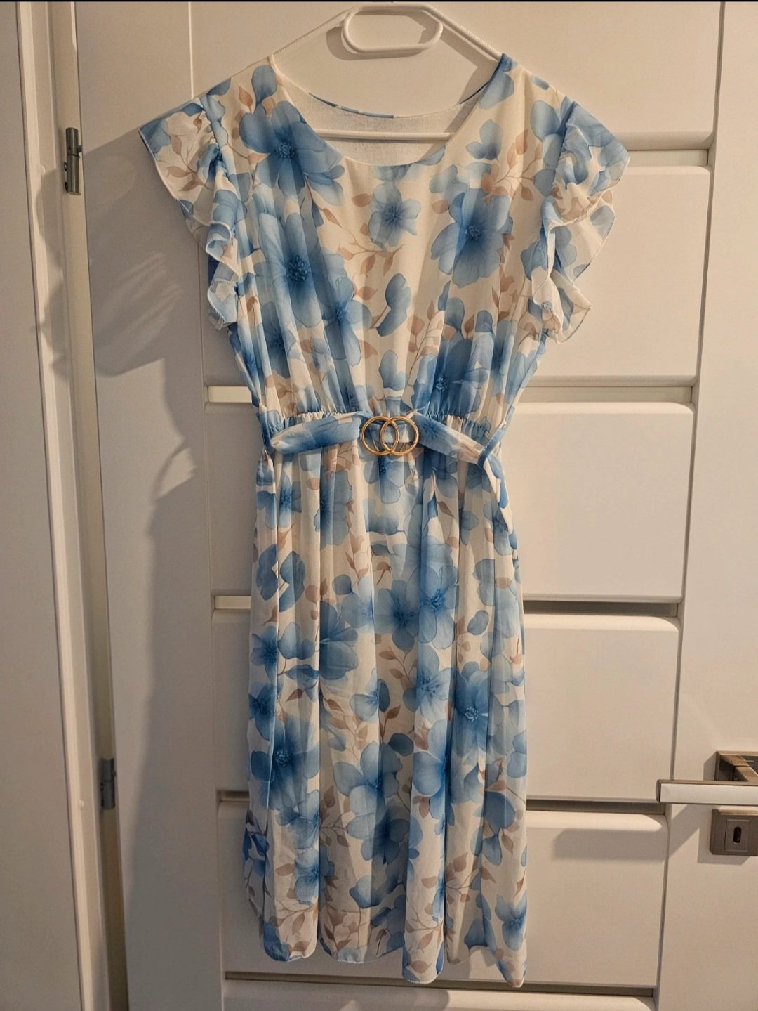 Ľahučký vzdušný materiál sú podšité. Rukáv má jemný volán. V páse je gumička, takže sa šaty prispôsobia. Majú opasok so zlatou ozdobou.