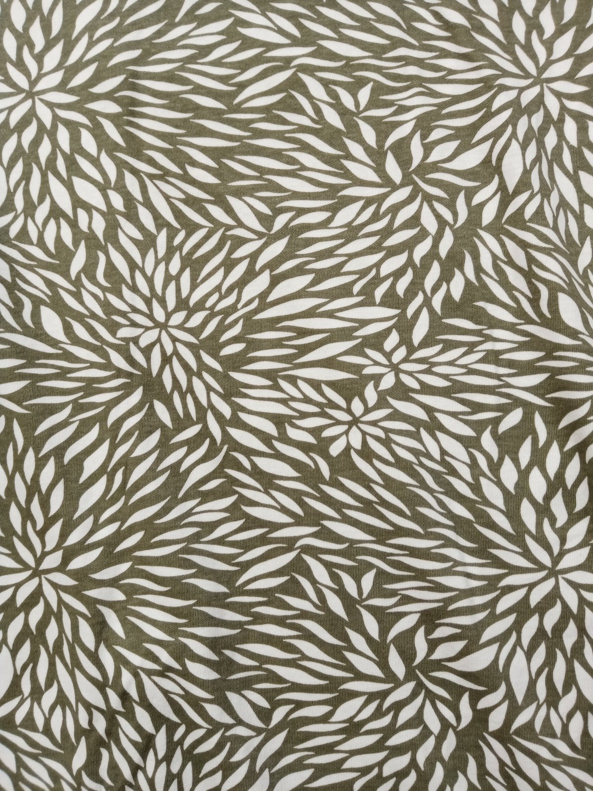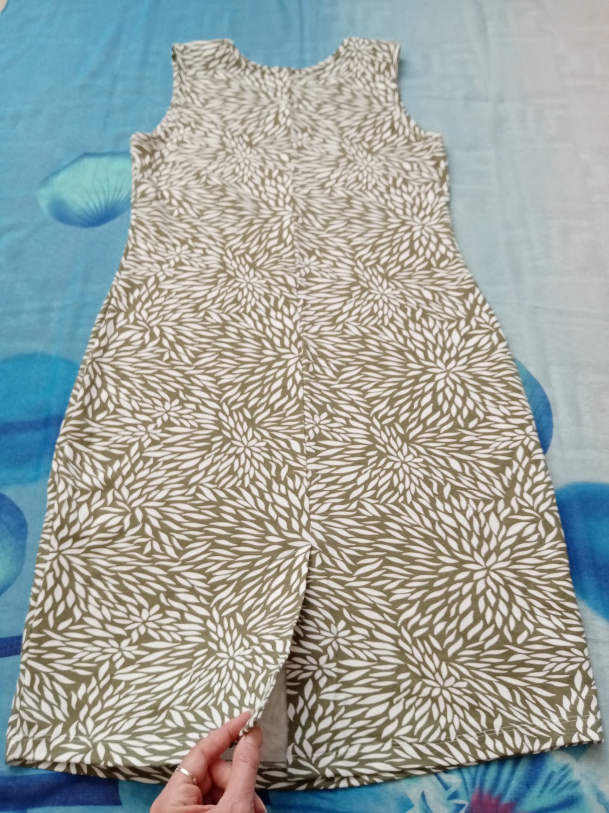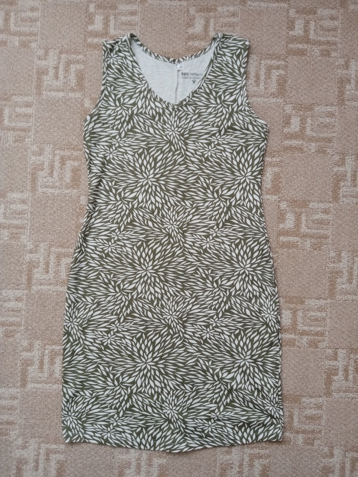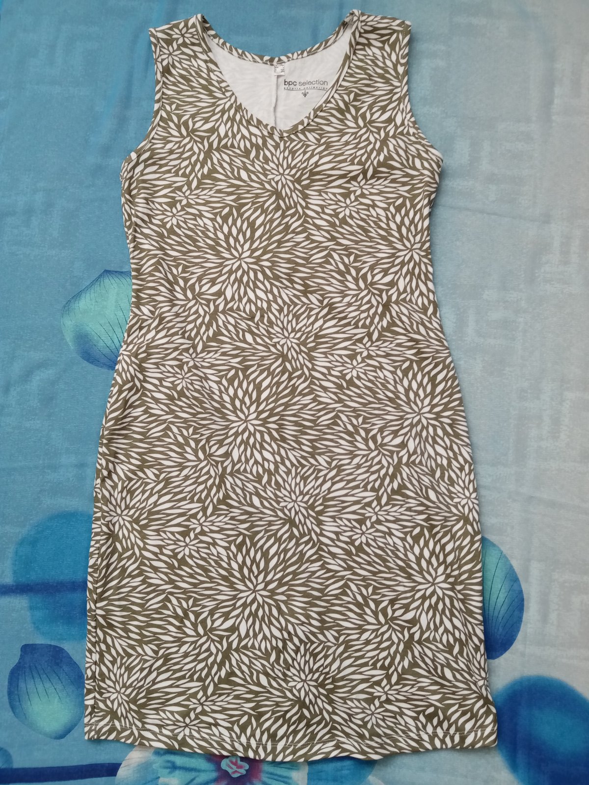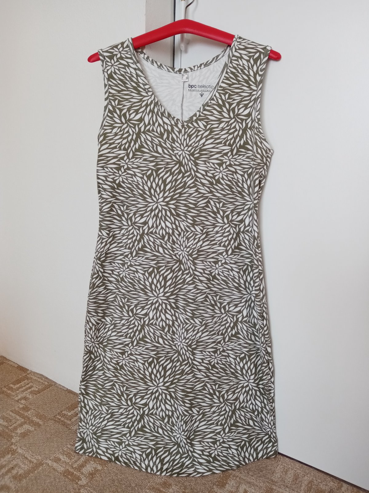 Vzorované šaty v olivovej a bielej farbe, s krátkym rozparkom v zadnej časti. Mierne elastické. Značka Bonprix. Veľkosť 40/42. Dĺžka 97 cm, šírka pod pazuchami 45 cm.