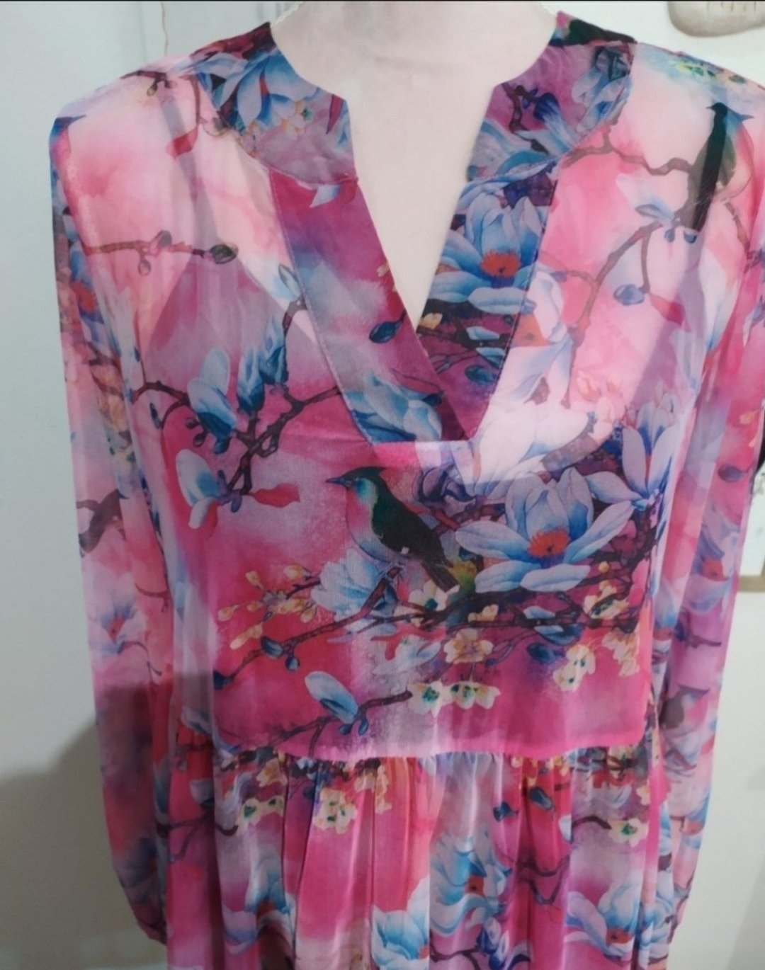 Výborný stav, materiál príjemný 96% viskóza, 4% elastan. Dĺžka od krku 93 cm, šírka pod pazuchami 42x2 cm, dĺzka rukáva od krku 52 cm. Veľ. uvedená 36/38.