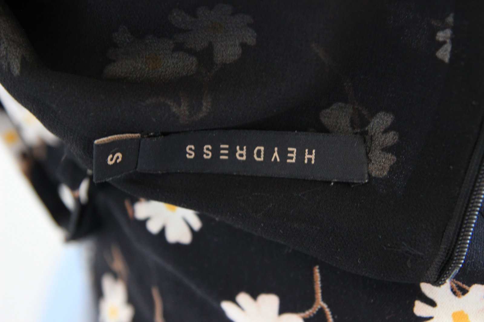 Čierne elegantnejšie šaty s kvetmi a volánmi od značky Heydress, top stav, veľkosť je S, na chrbte sa zapína na zips.