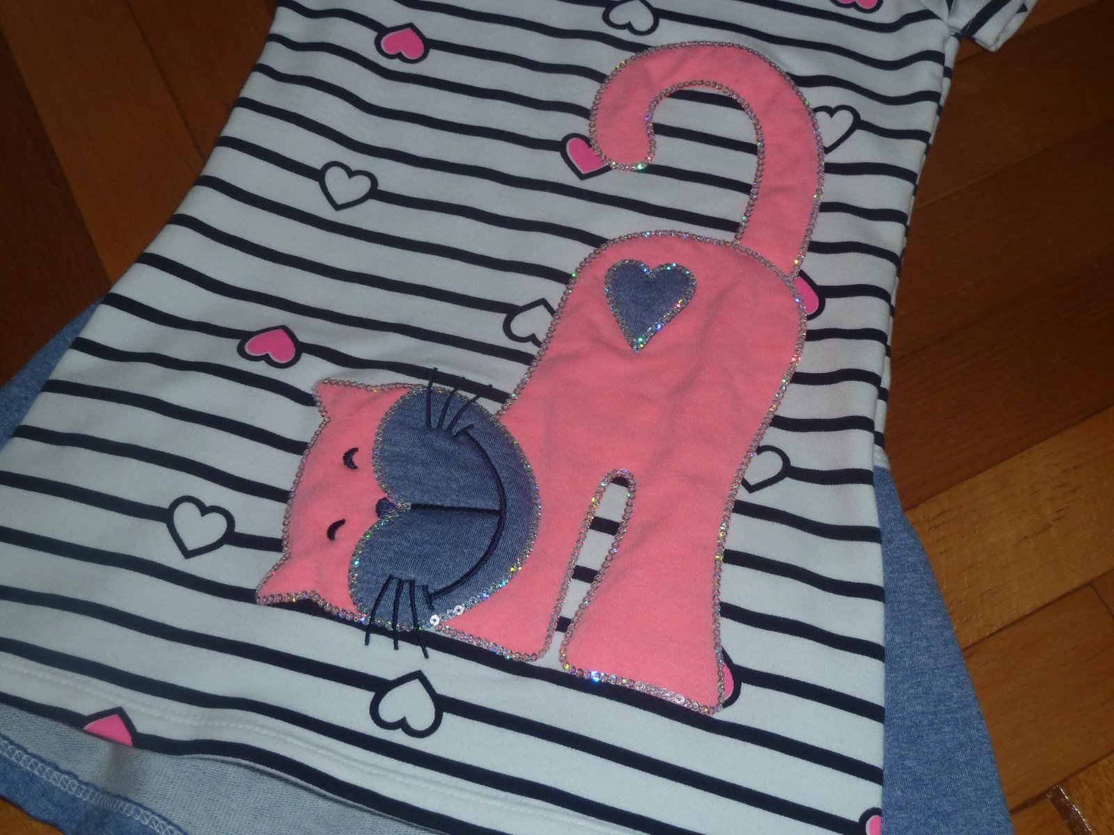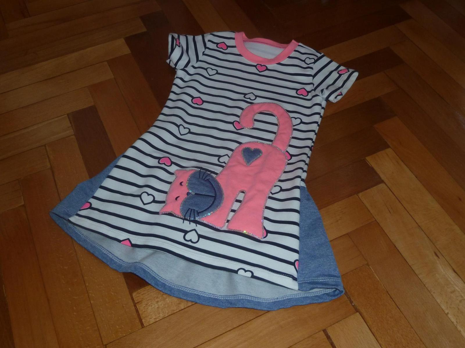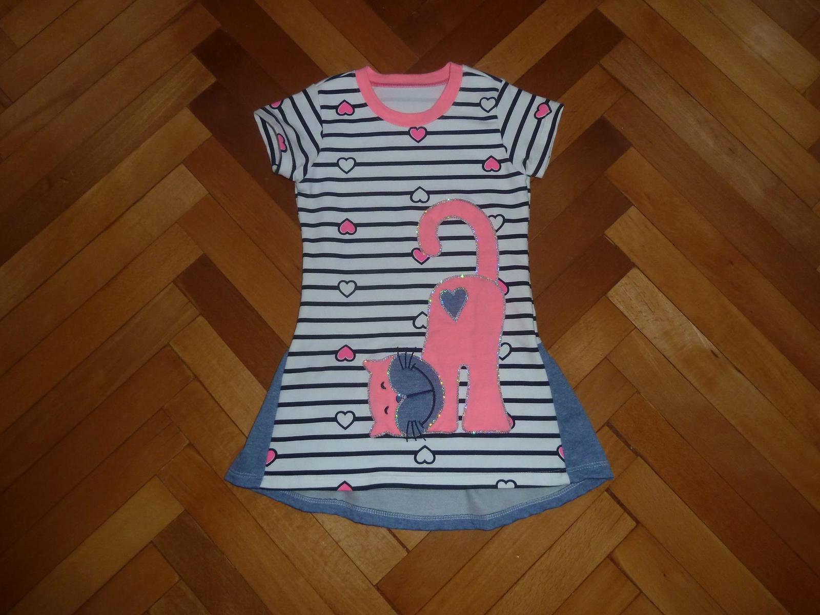 Saty alebo tunika v top stave, bez poskodeni, oblecene asi 3x, kupovane nove v detskom kamennom obchode, vzadu suknicka nariasena, vpredu motiv macicky. Elasticky material (nie je to uplne tenky material).