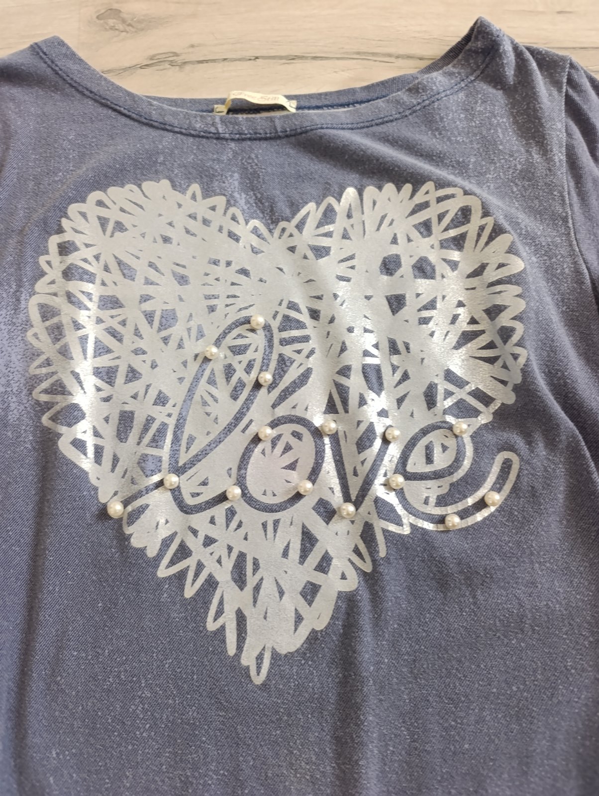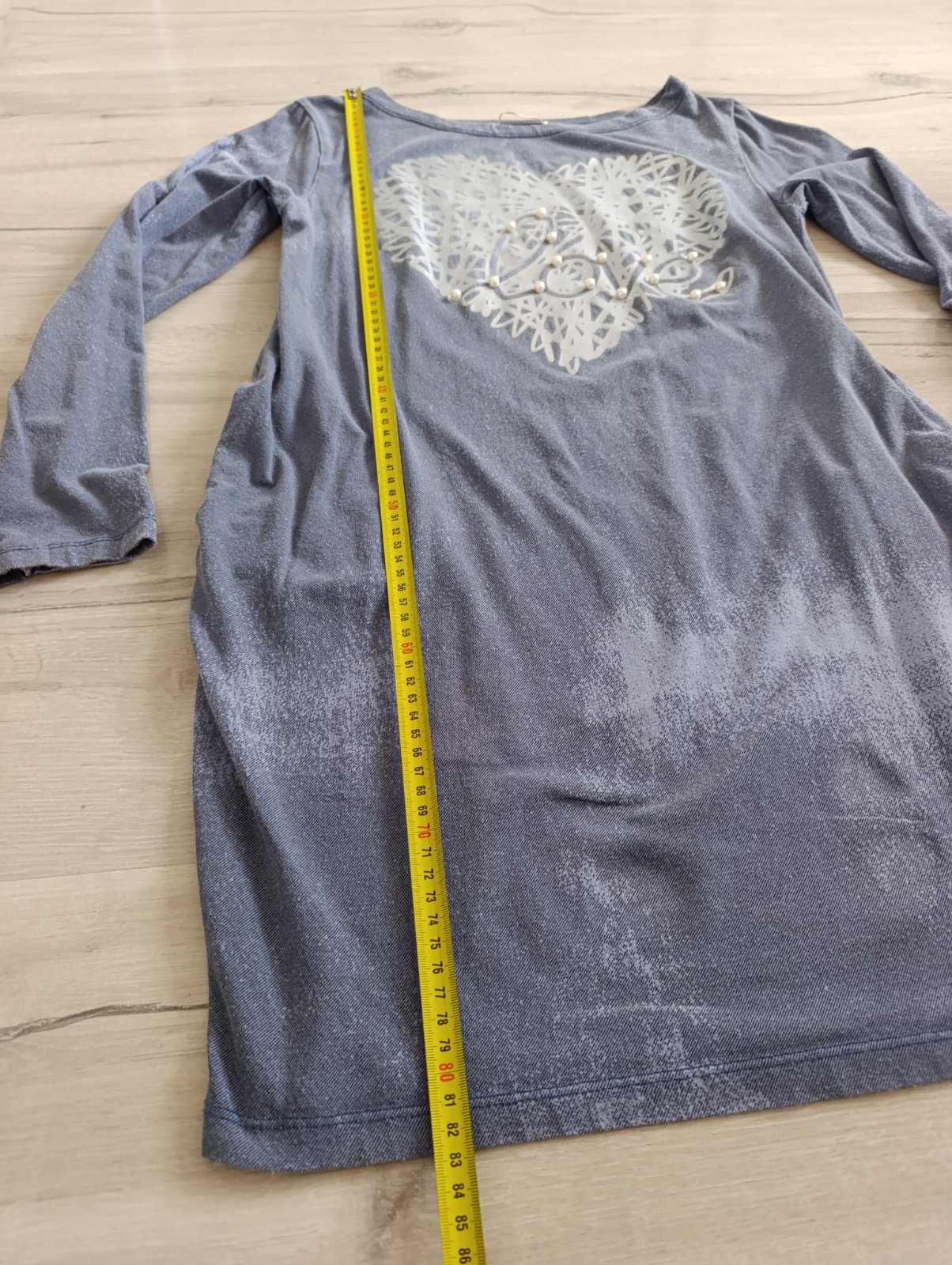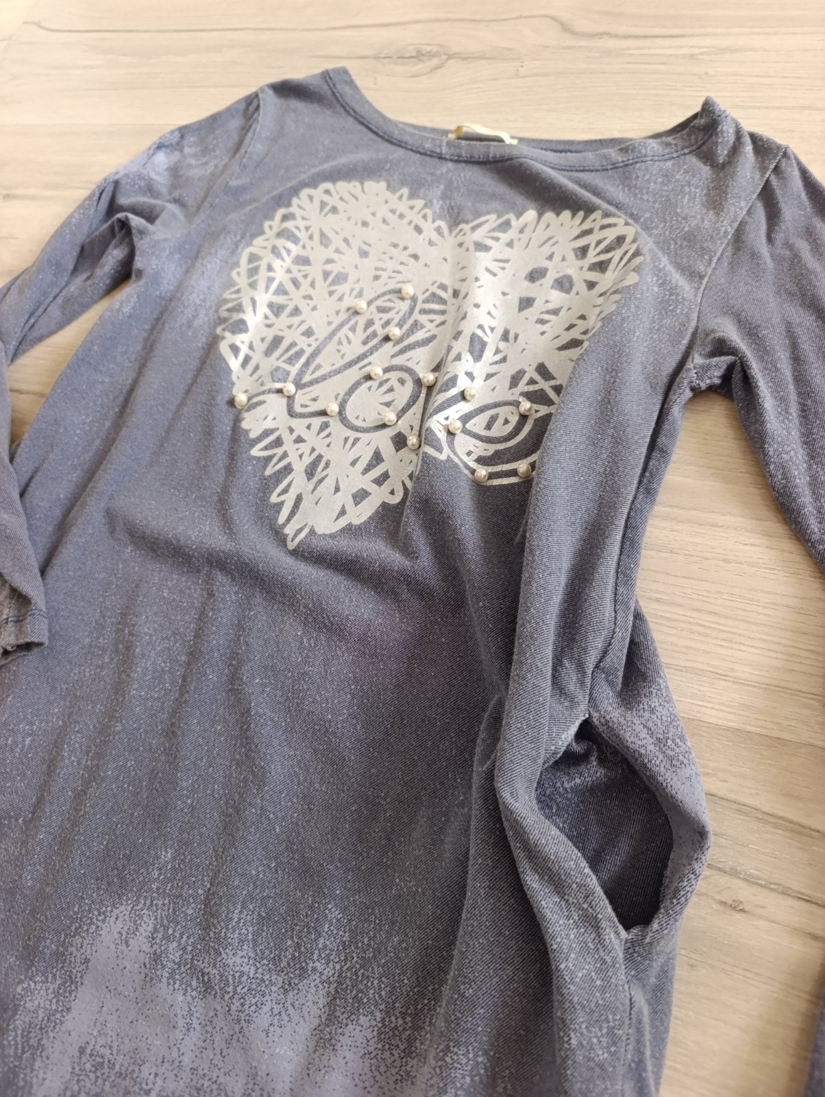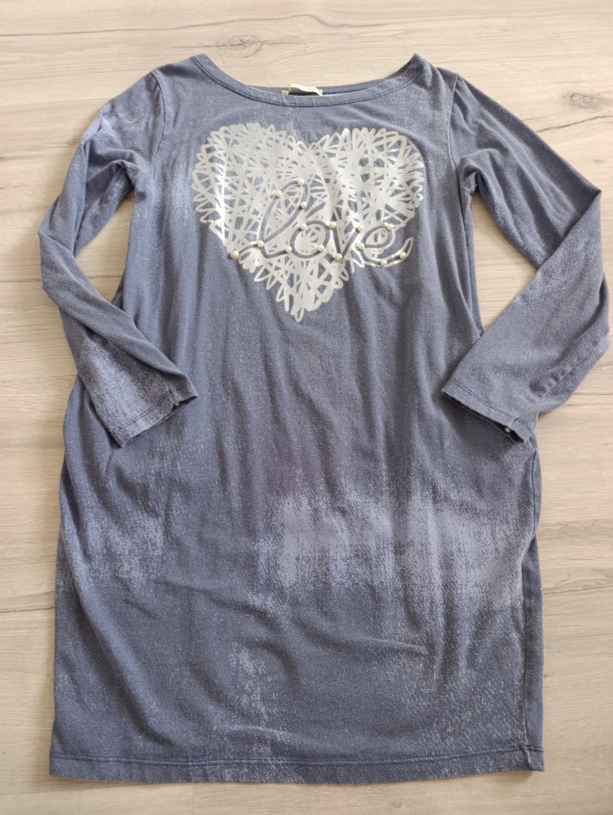 Pekné ležérne šaty, vpredu majú aplikáciu srdca s nápisom a perličkami, po bokoch vrecká, vzhľad rifloviny. Dobrý nosený stav. Pri výmene 7€
