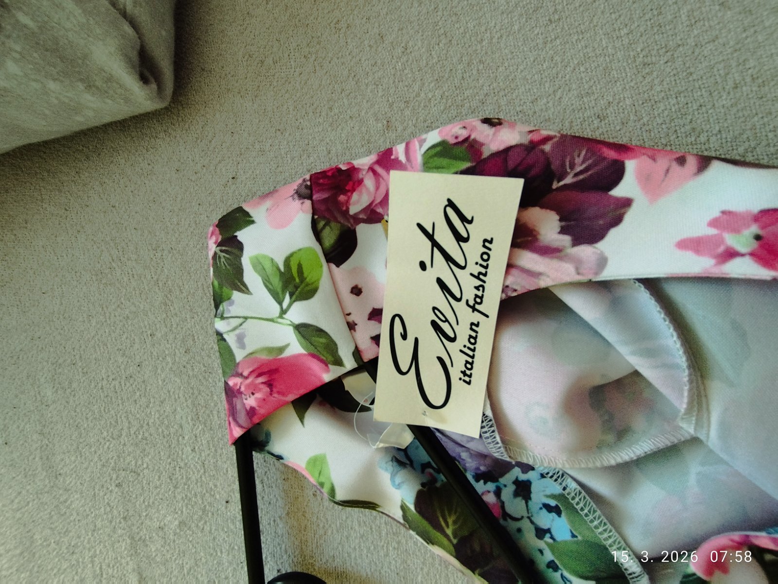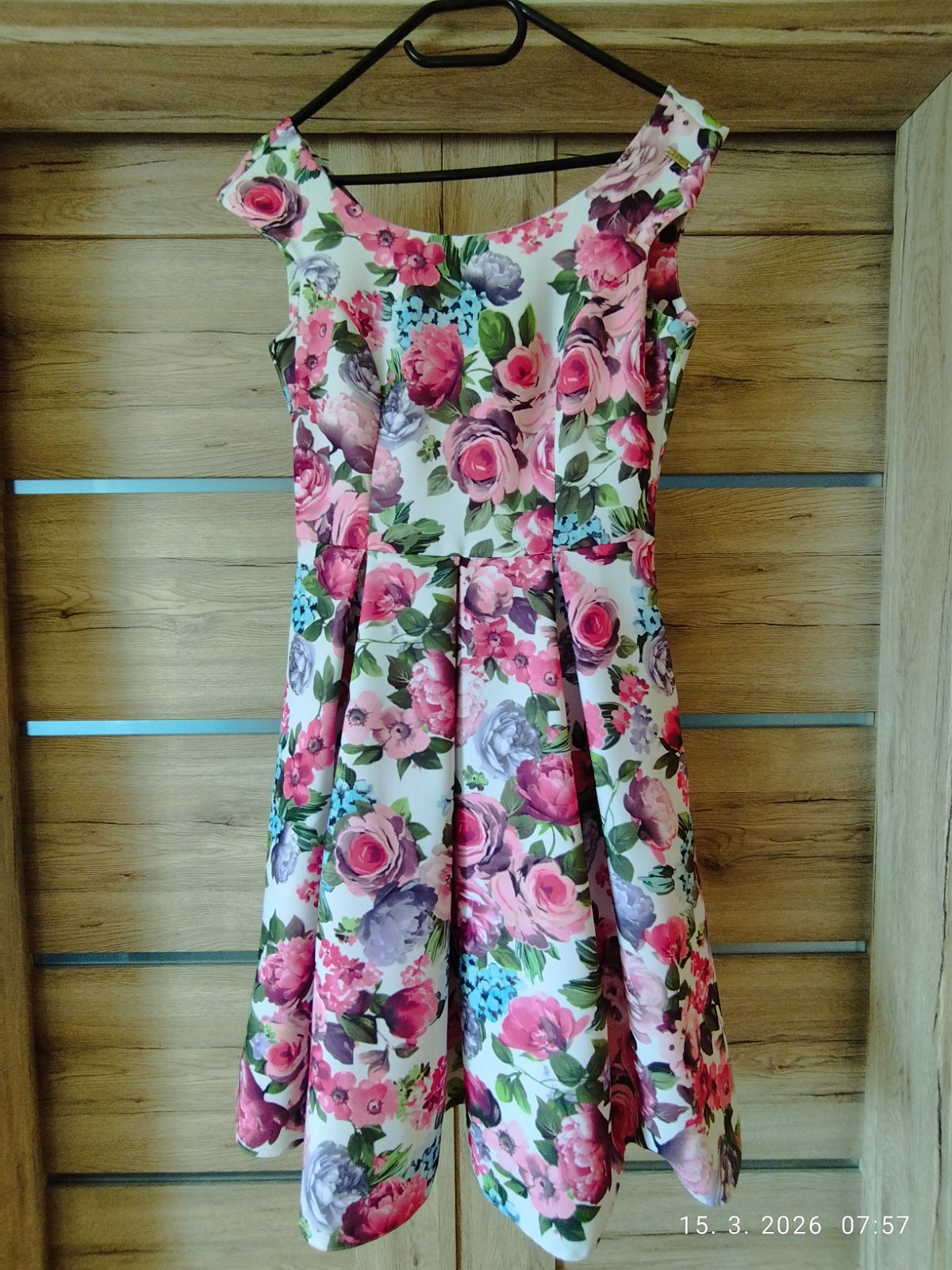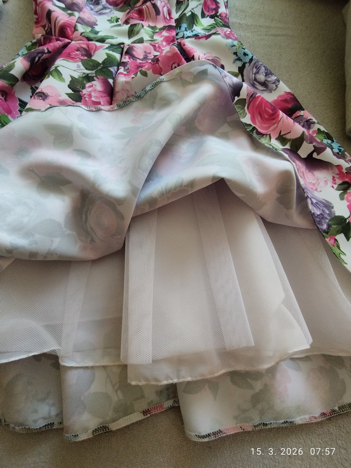 Šaty sú krásne kvetinové, vhodné na oslavu i svadbu. Nevhodný darček. Šírka cez prsia 42 CM, dĺžka od ramien 92 cm.Pod šatami sú ešte 2 spodnice.