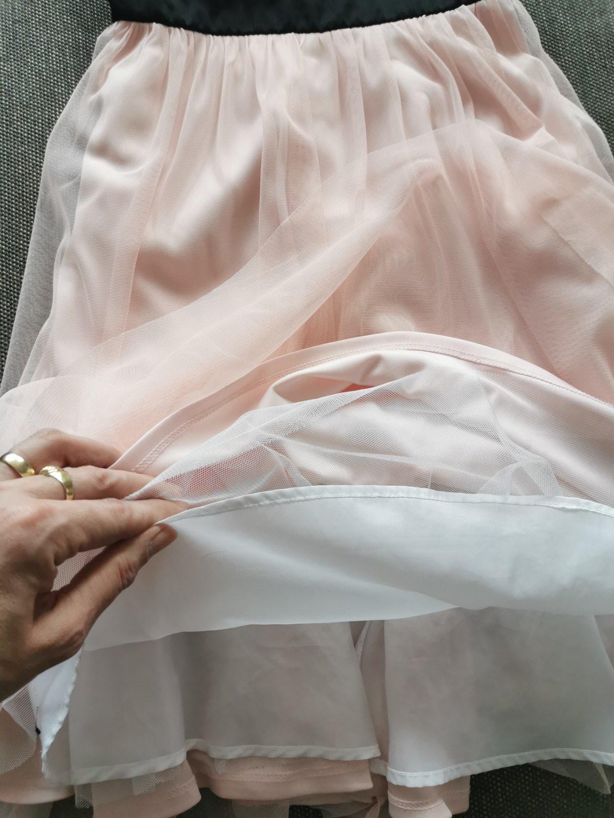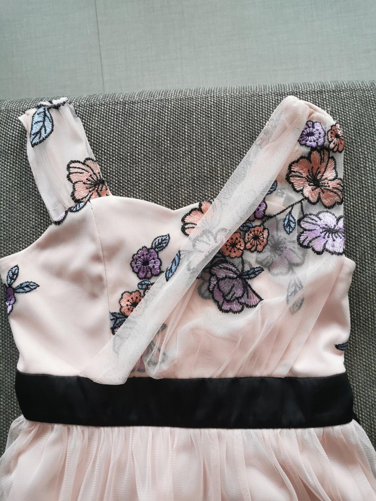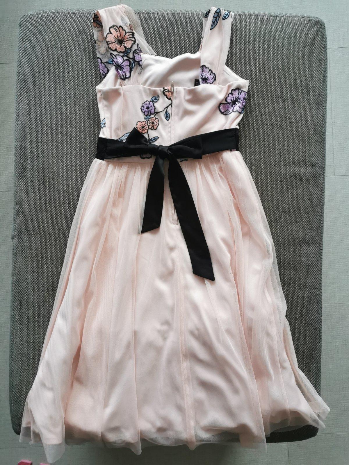 Krásne šaty vo výbornom stave, vzadu na zips. Veľkosť písaná na 10 rokov, treba sa riadiť rozmermi. Dĺžka je 58cm, hrudník 2x36cm (aj viac 2-3cm), pás 2x31cm.