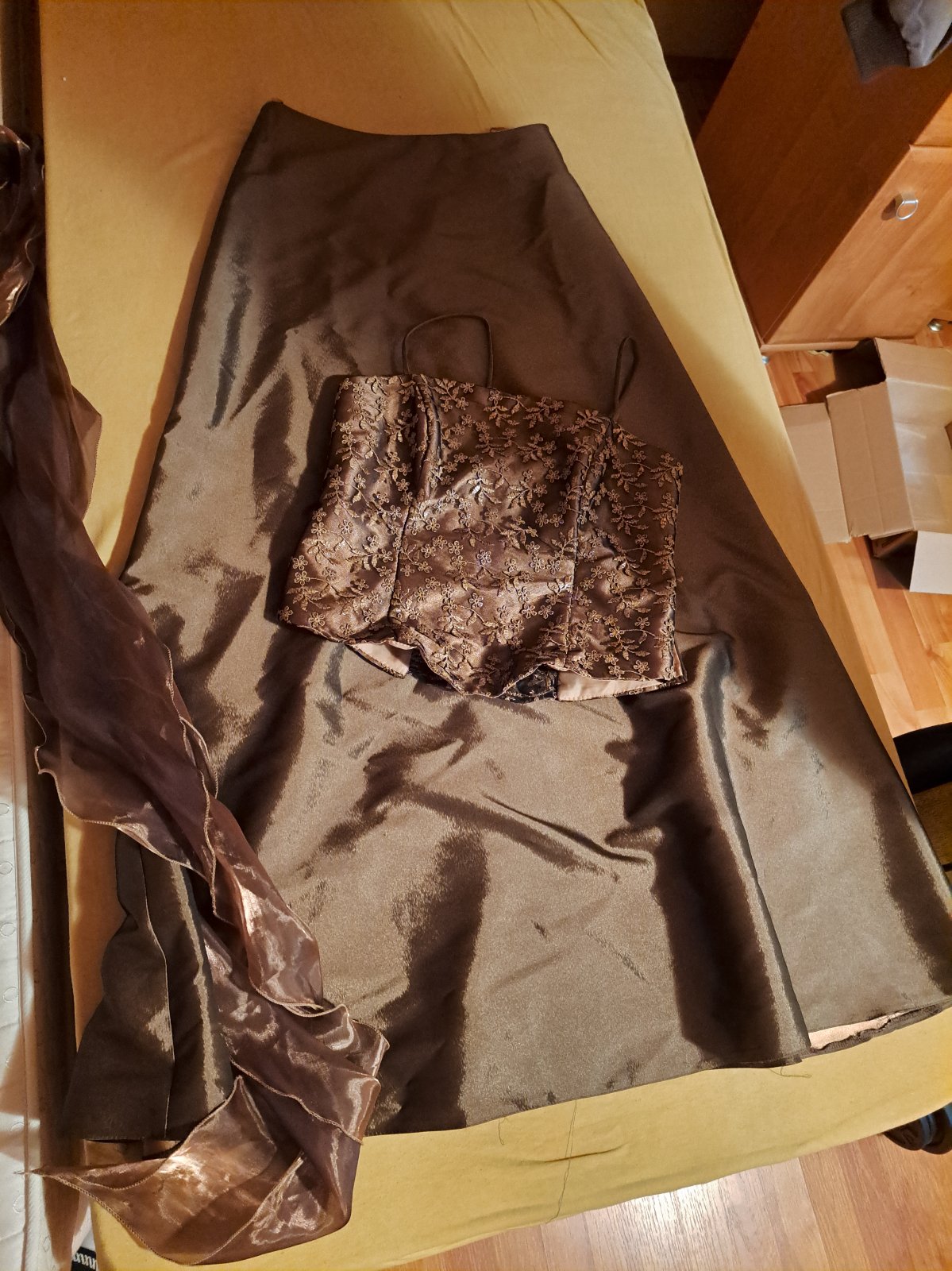 Spoločenské šaty mahagonovo hnedej farby veľkosť 40 v zadu sťahujúci korzet na šnúrky takže sú prispôsobivé na veľkosť od 38-42 ,20 cm na sťahovanie,od ramienok po spodok 142 cm veľmi pekne sadnú ...