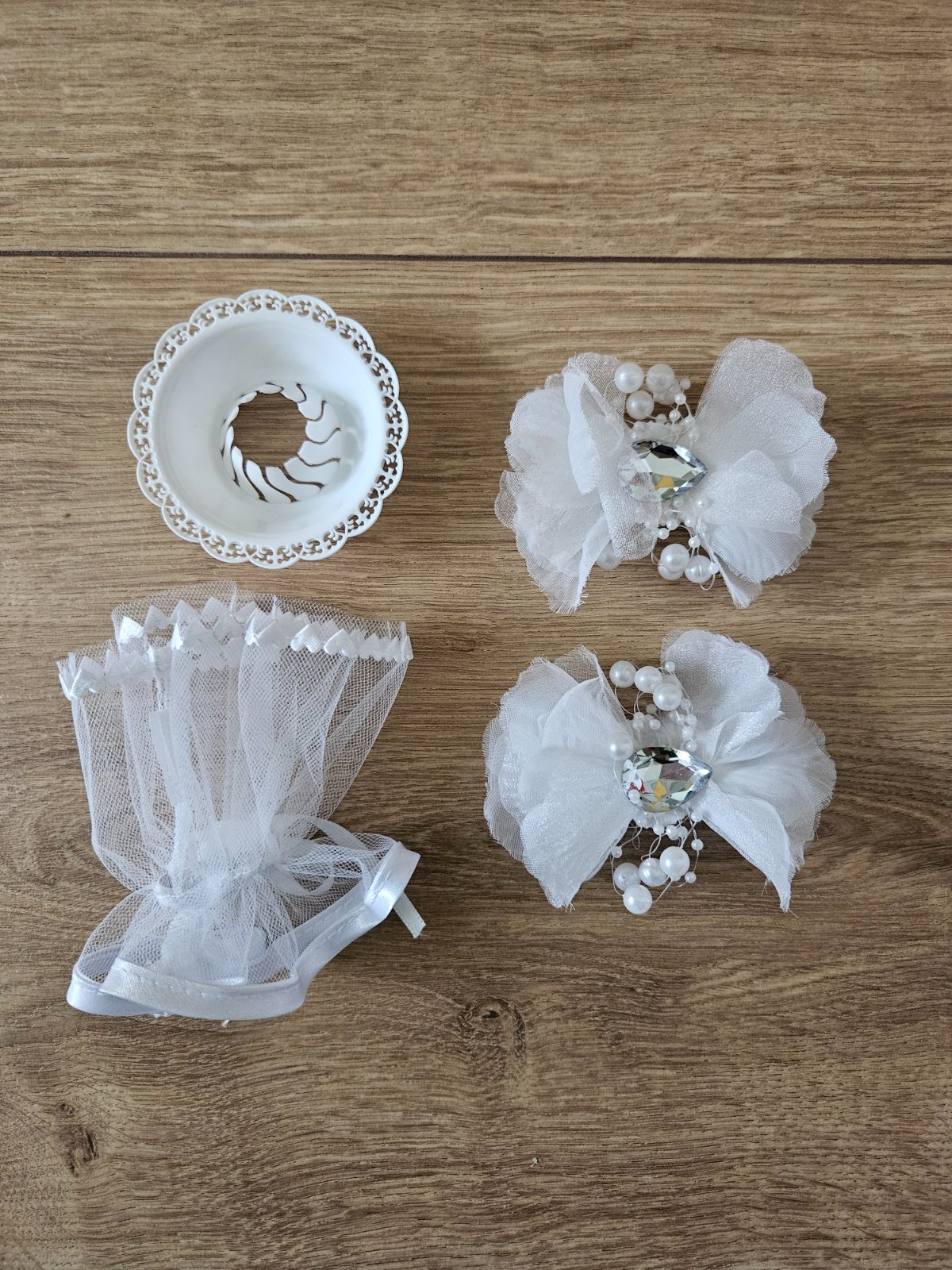 K šatám darujem čipkované bolerko, ozdobné sponky do vlasov a držiak pod sviečku.