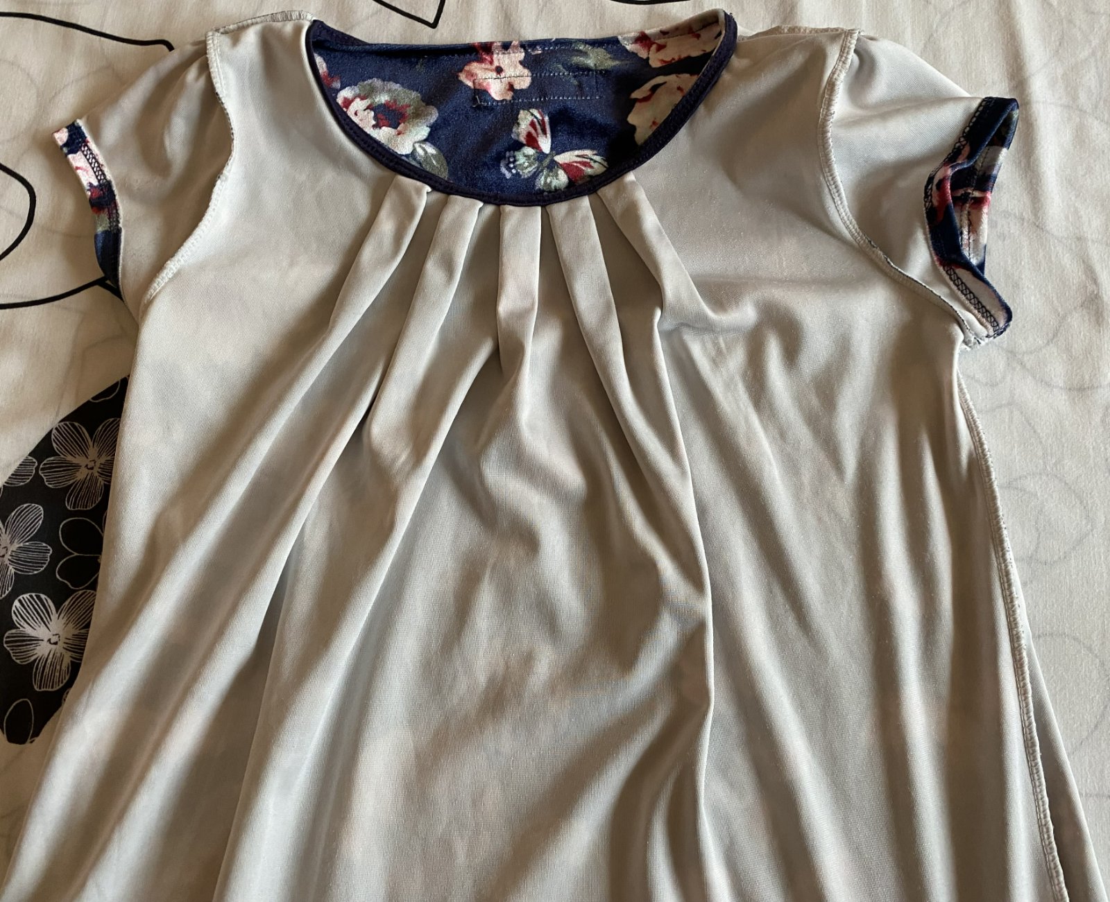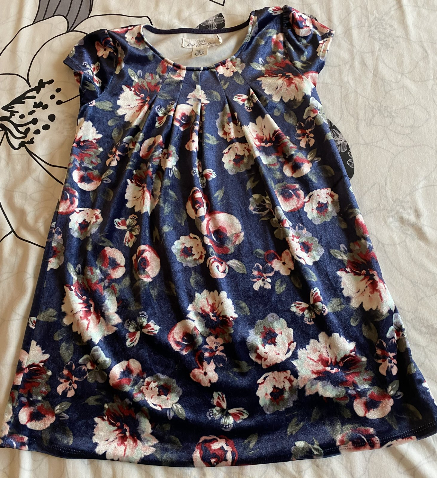 Šaty H&M L.O.G.G. s potlačou kvietkov a motýľov v. 122/128 - 7.-8. rokov, materiál 95% polyester, 5%elastan - niečo ako jemný zamat - padavý - nekrčivý, veľmi pekné nevypraté farby, málo nosené na striedačku s inými. Miery: dĺžka od krku dolu: 64cm, v prednej hornej časti záševky - sámiky - rozšírenie do spodnej časti, šírka spodná časť: cca 53cmx2.