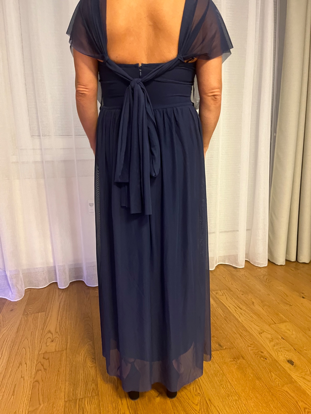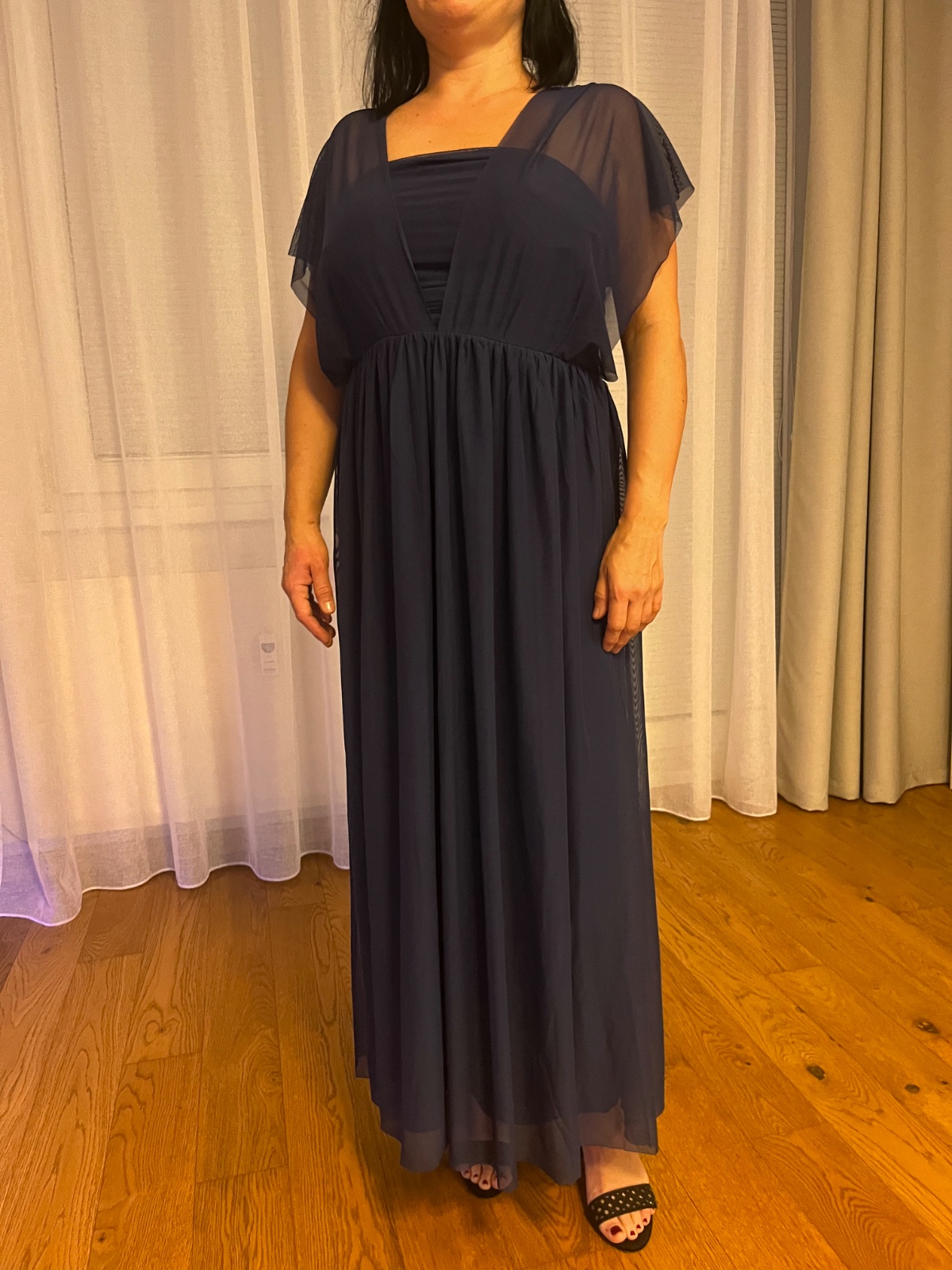Šaty oblečene 1x na plese, tmavo modre s aplikaciou. Vzadu zips.