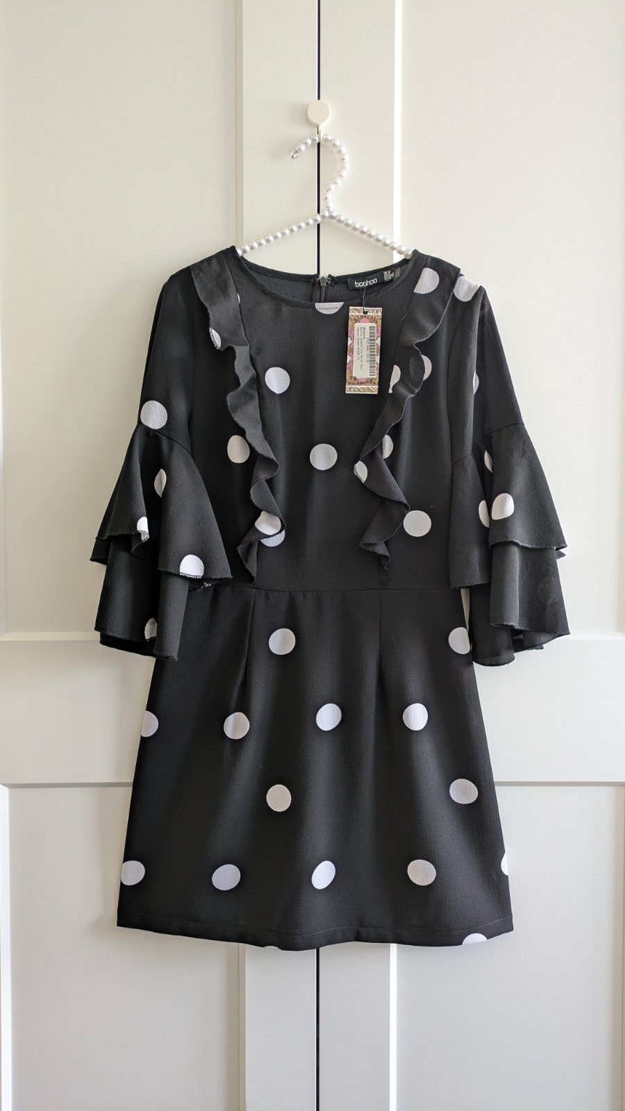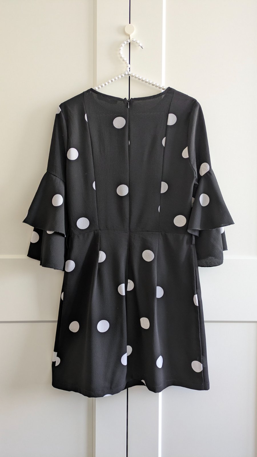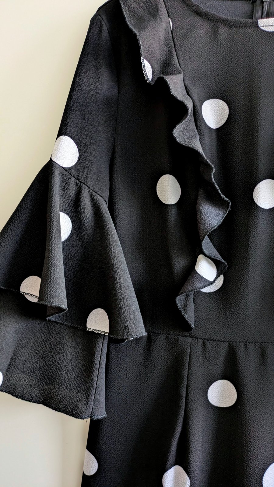 ⚜️ Čierne šaty s bielymi bodkami s volánovými rukávmi. Kvalitné prevedenie, pekný ženský strih.