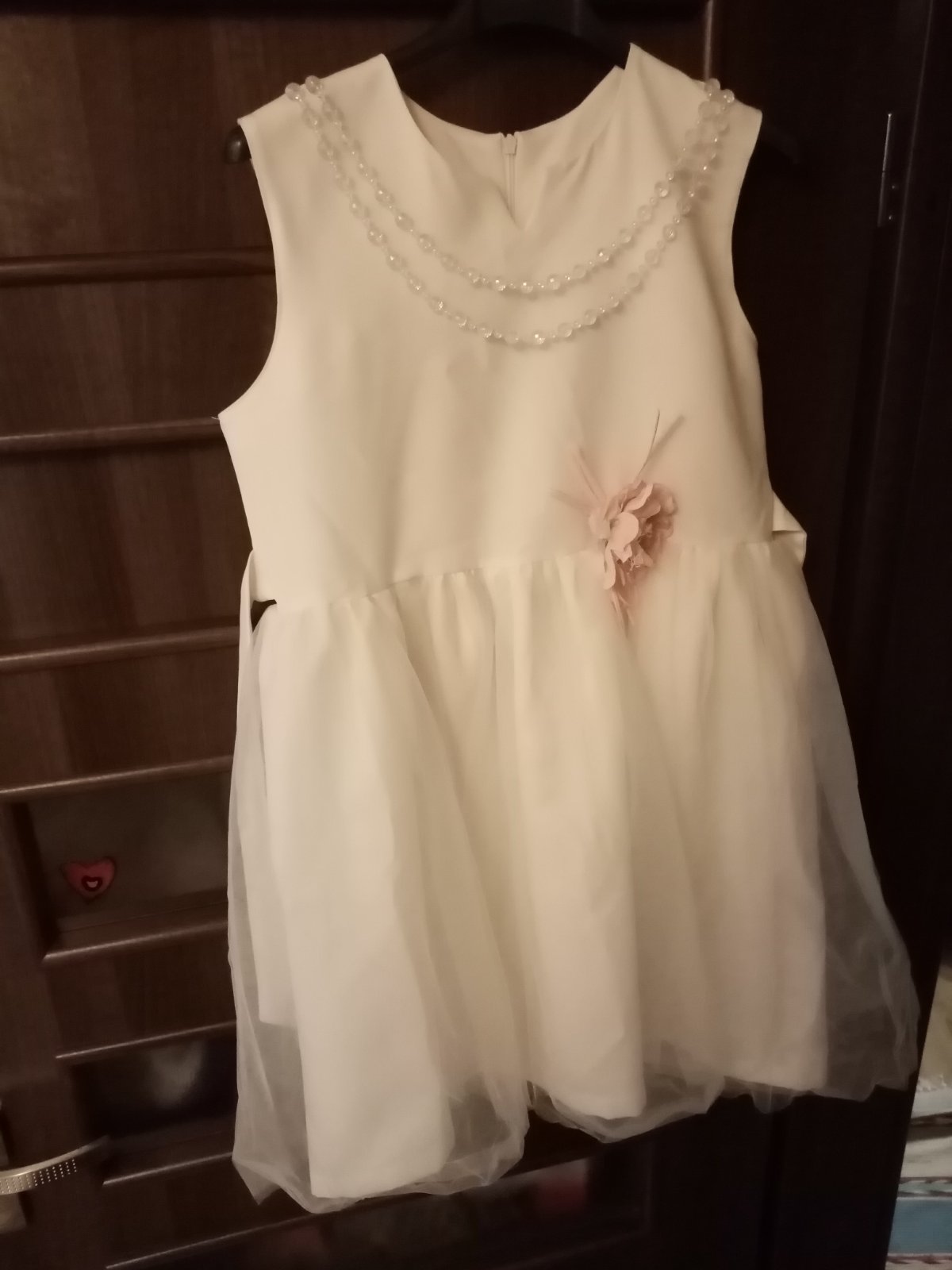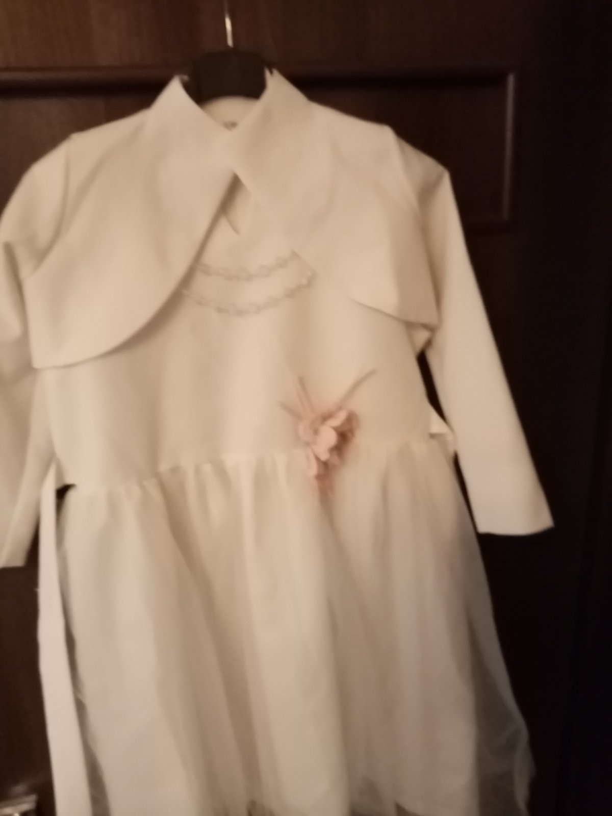 Dobrý deň ponúkam šaty na príležitosť akou je prvé sväté prijímanie, oslava. Šaty sú po kolená, s peknymi goralkami na hrudi, sukňa ma navrchu našitý tyl, ktorý do tvorí pekný tvar šiat, na boku v páse šiat je pripnúť kvietok, ktorý sa dá odopnut