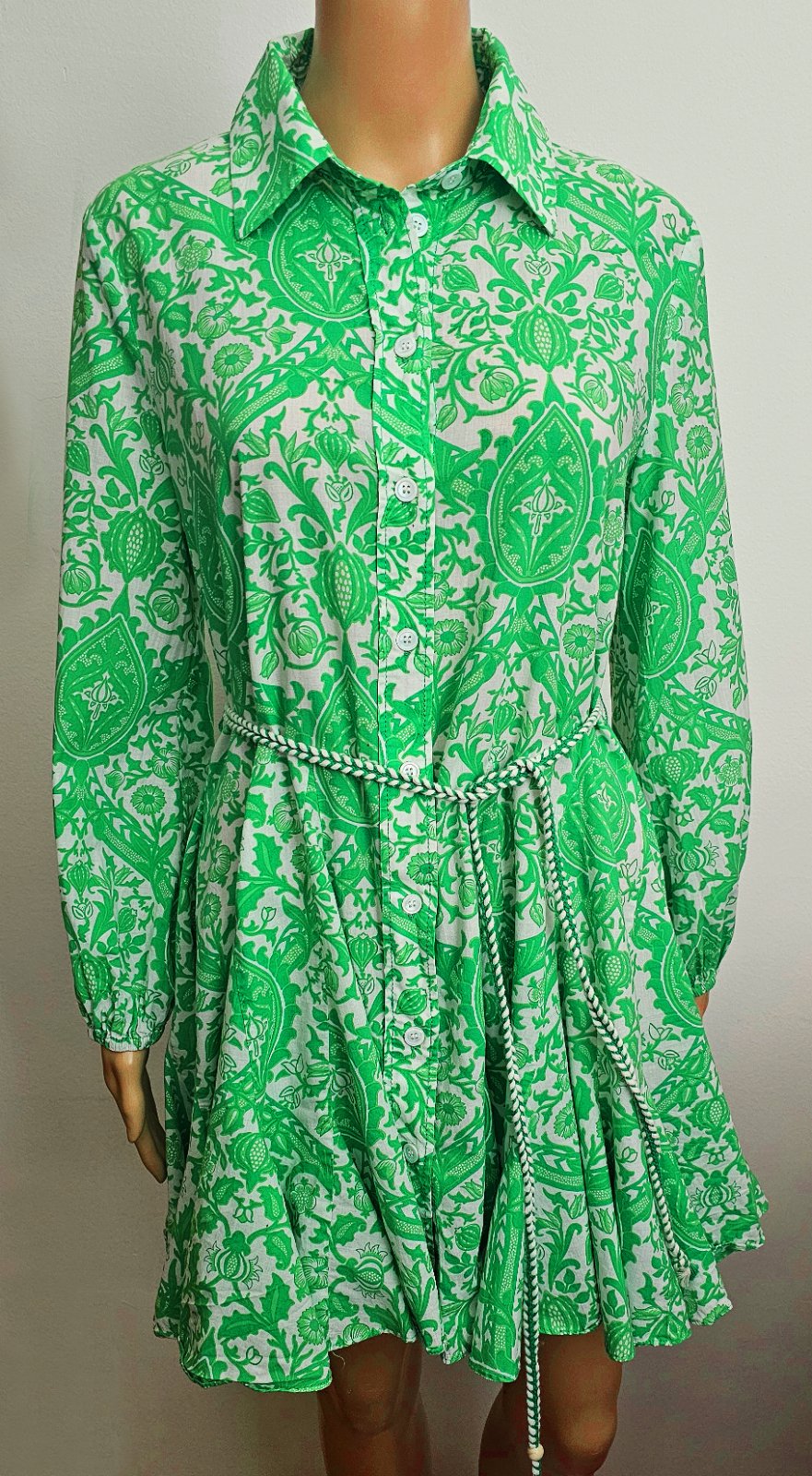 Takmer nové, výborný stav. Dĺžka 85 cm, dĺžka rukáva od krku 69 cm ukončený gumičkou, šírka v hrudníku 55 x 2 cm. Príjemný vzdušný materiál. 100% bavlna. Krásna výrazná farba.