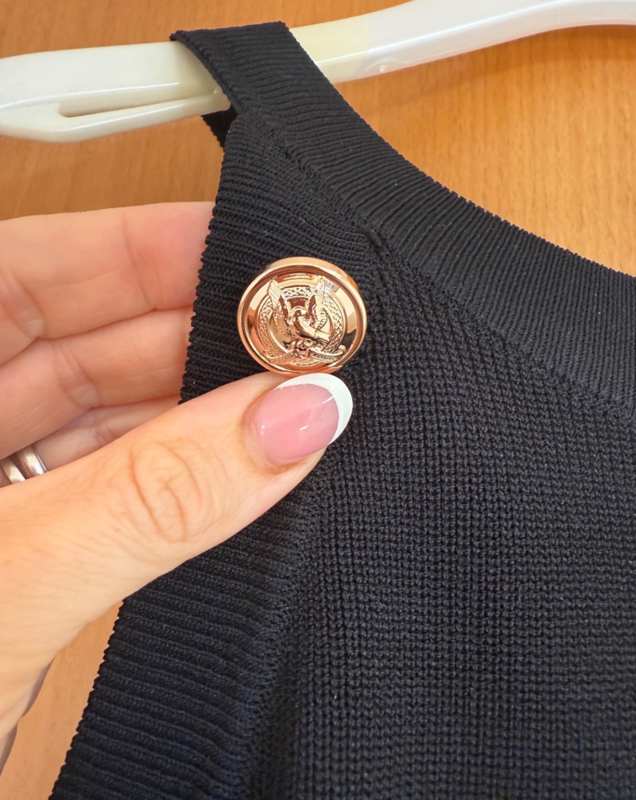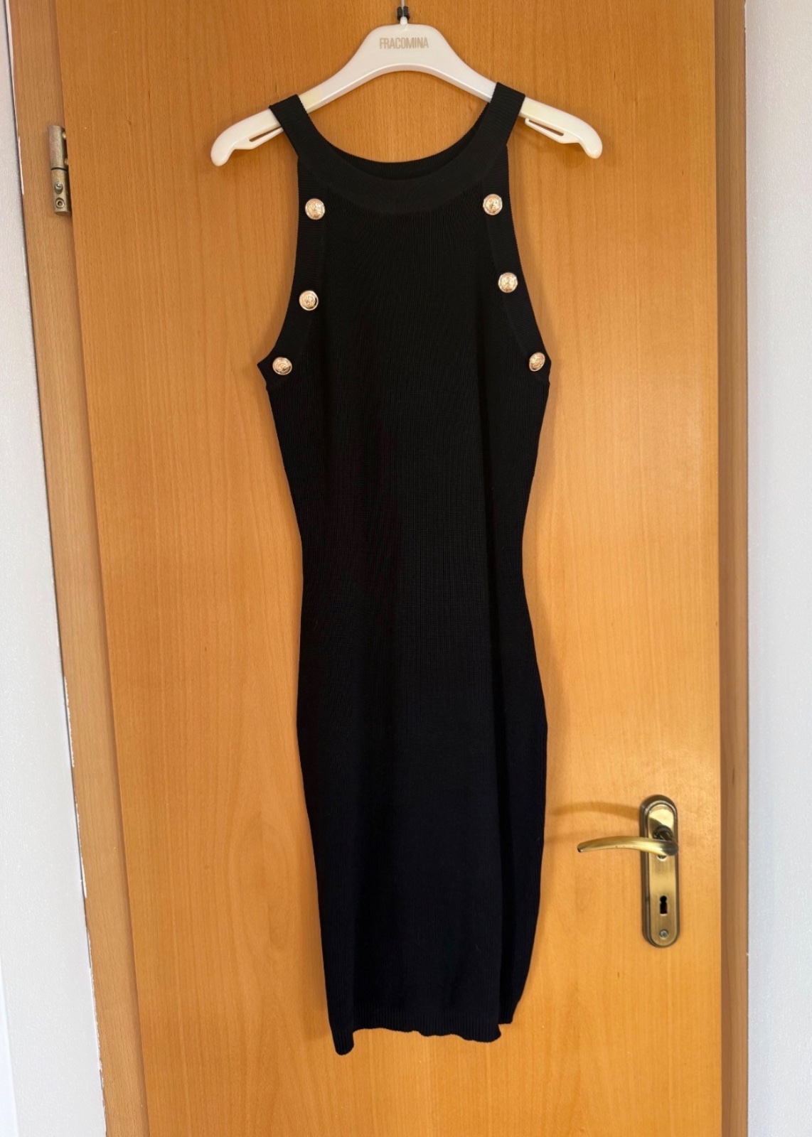 Čierne šaty z príjemného elastického úpletu značky Fracomina. Sú jednoduchého strihu zdobené zlatými ozdobnými gombíkmi.