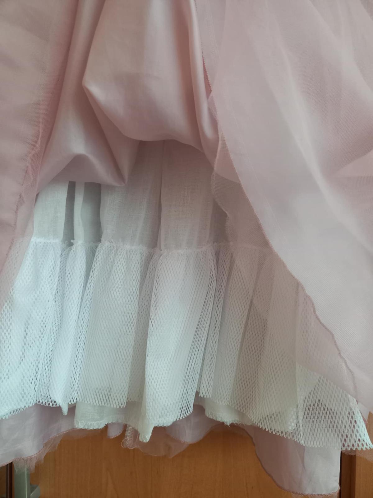 sukňa 2x tylová(spodná dlhšia, horná kratšia - oblúkovito šitá- vpredu kratšia, vzadu dlhšia, zakončená bielymi kvietkami), potom riadna sukňa a spodná spodnička s volánom