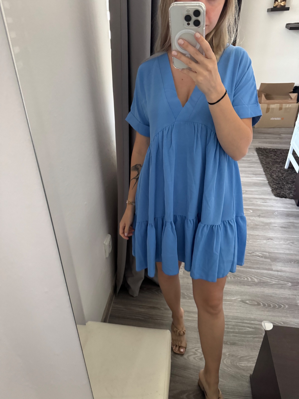 Tmavomodro bezove pasikave saty Hrubsi material Kratky rukav 2 vrecka Top stav Velkost S Dlzka 81-82 cm Sirka 42-52( elasticke) Obvod ruky 30cm
