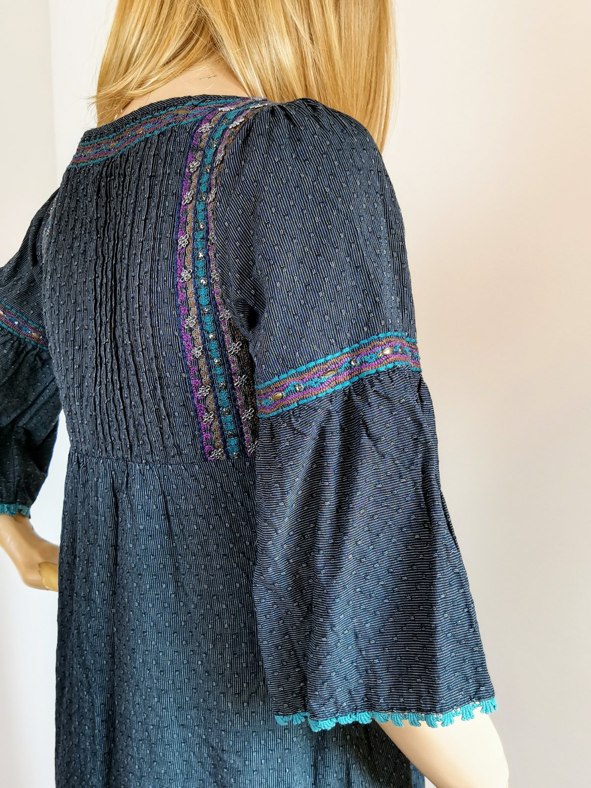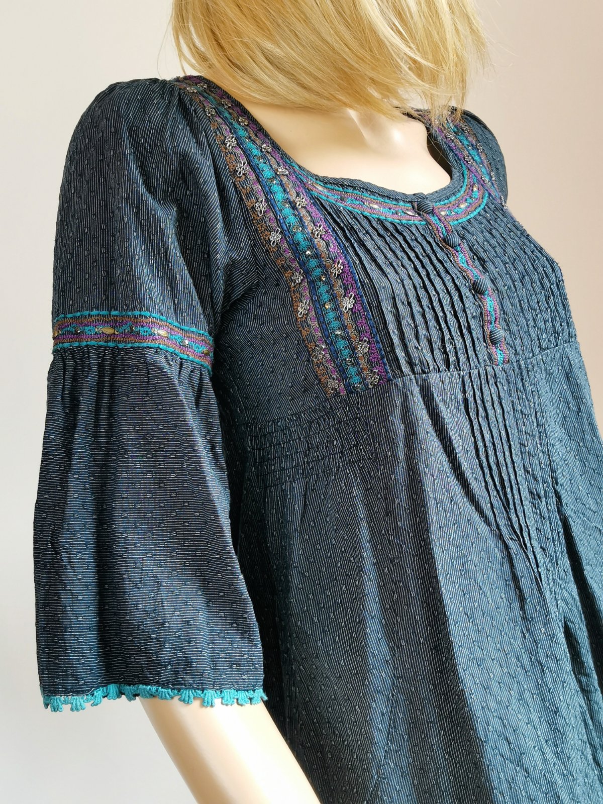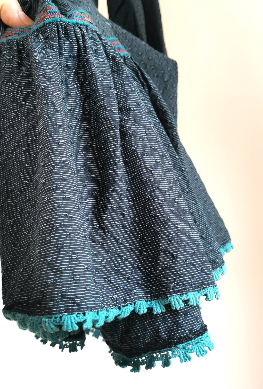 Štýlom tak trochu etno, vyšívané, zdobené korálkami a po okrajoch jemnou tyrkysovou čipkou.