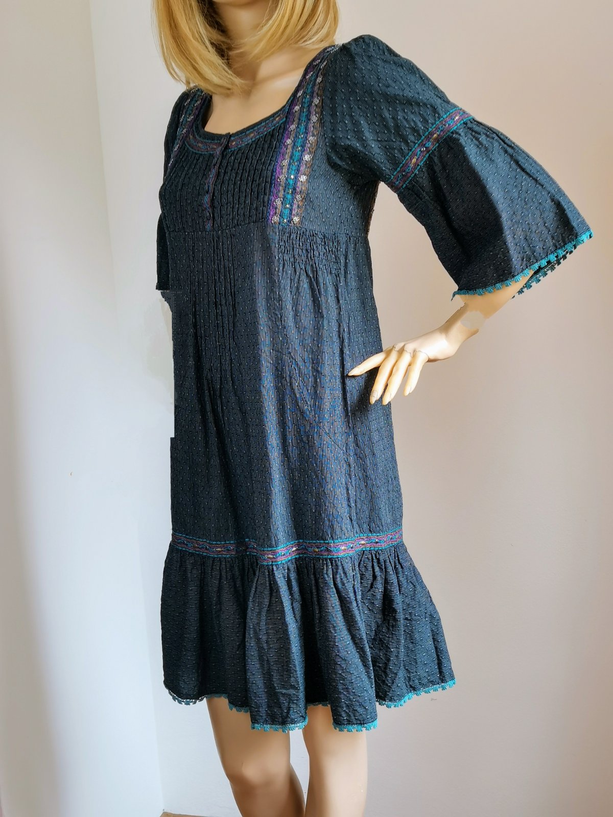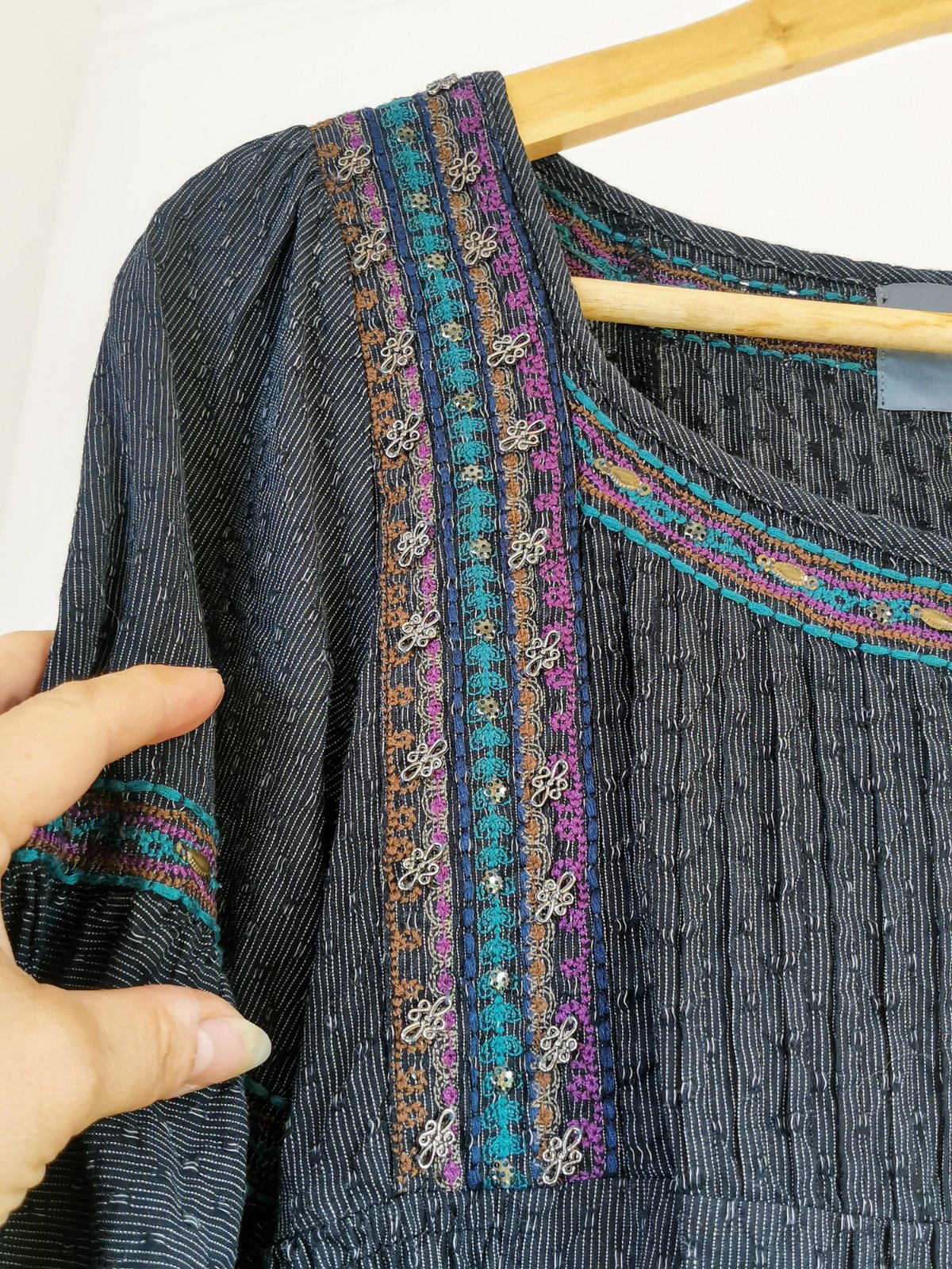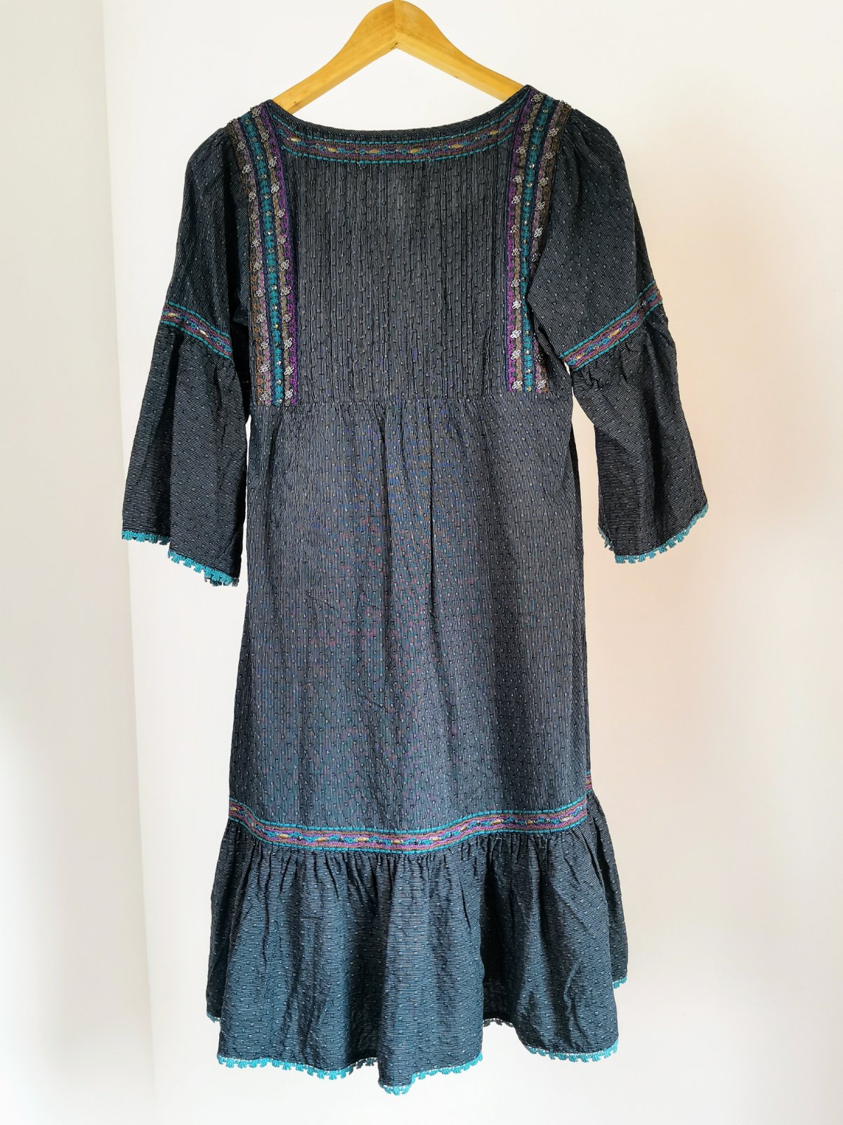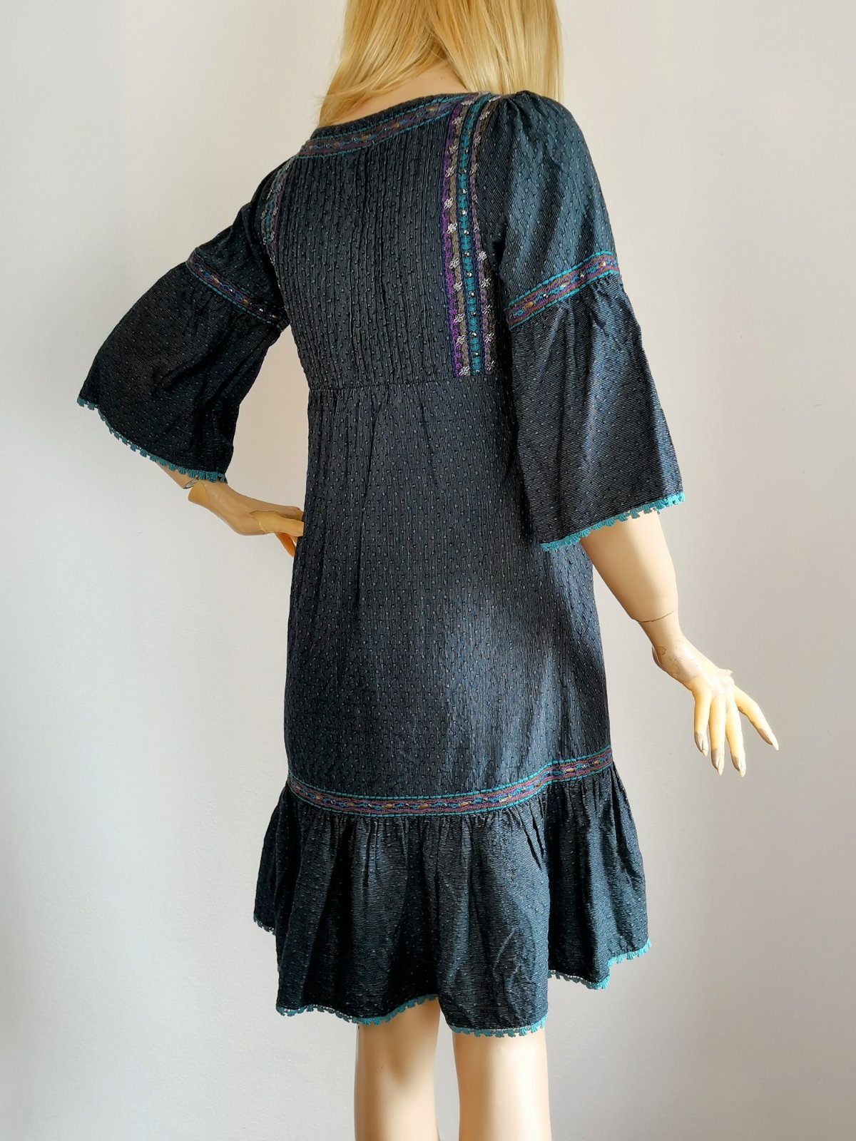 Štýlom tak trochu etno, vyšívané, zdobené korálkami a po okrajoch jemnou tyrkysovou čipkou.