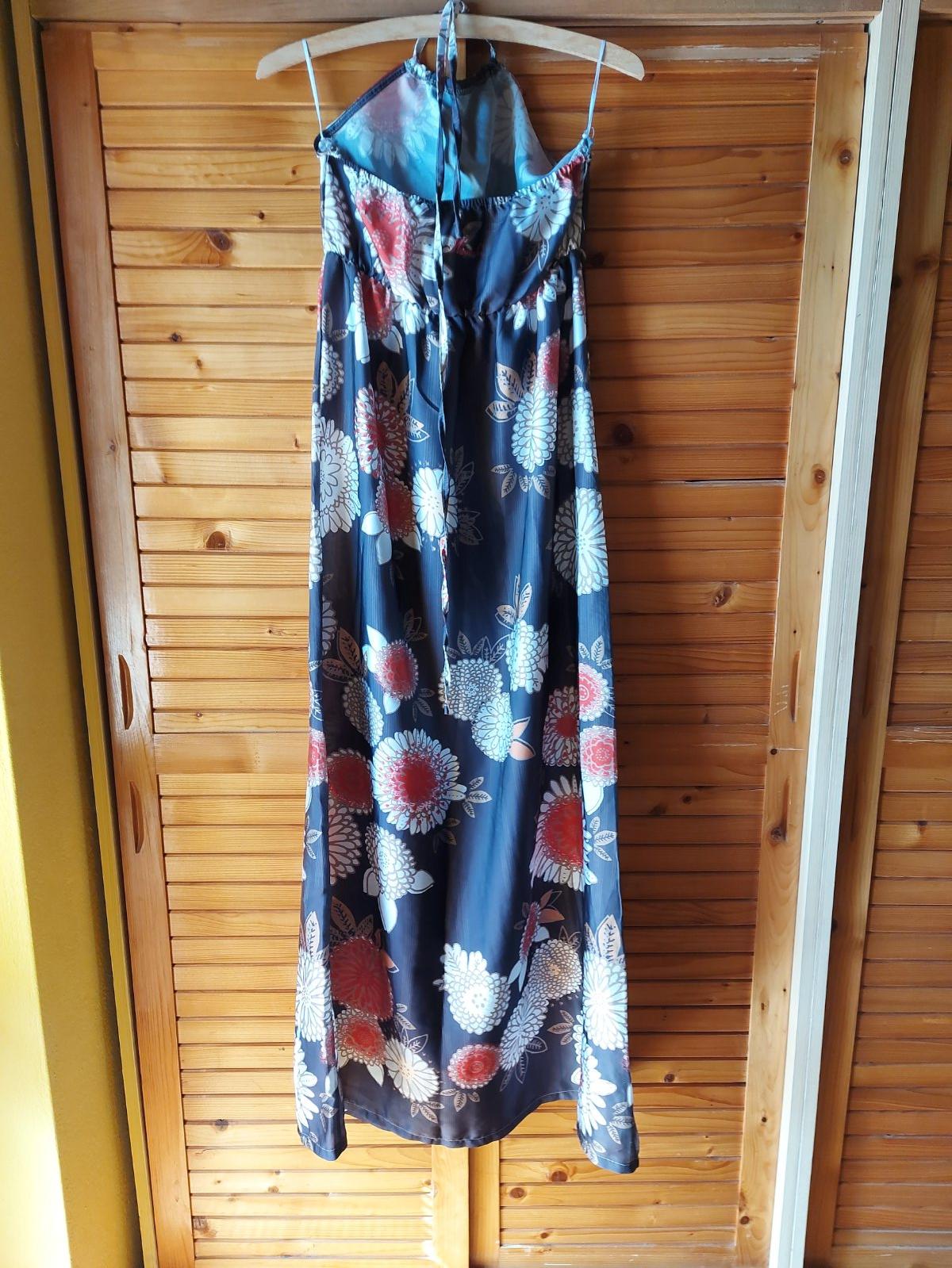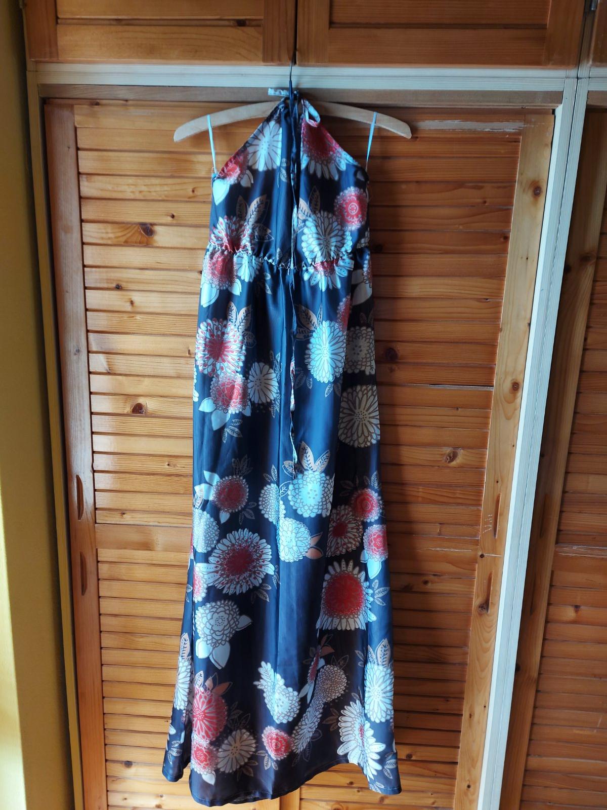 Dlhé letné jemné šaty, väčšie S, M, š. pod pazuchami v kľude - 37, celková dĺžka - 123,5, zaväzovanie okolo krku, nie sú elastické, 100 % polyester