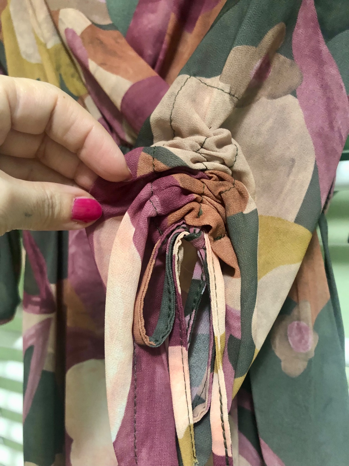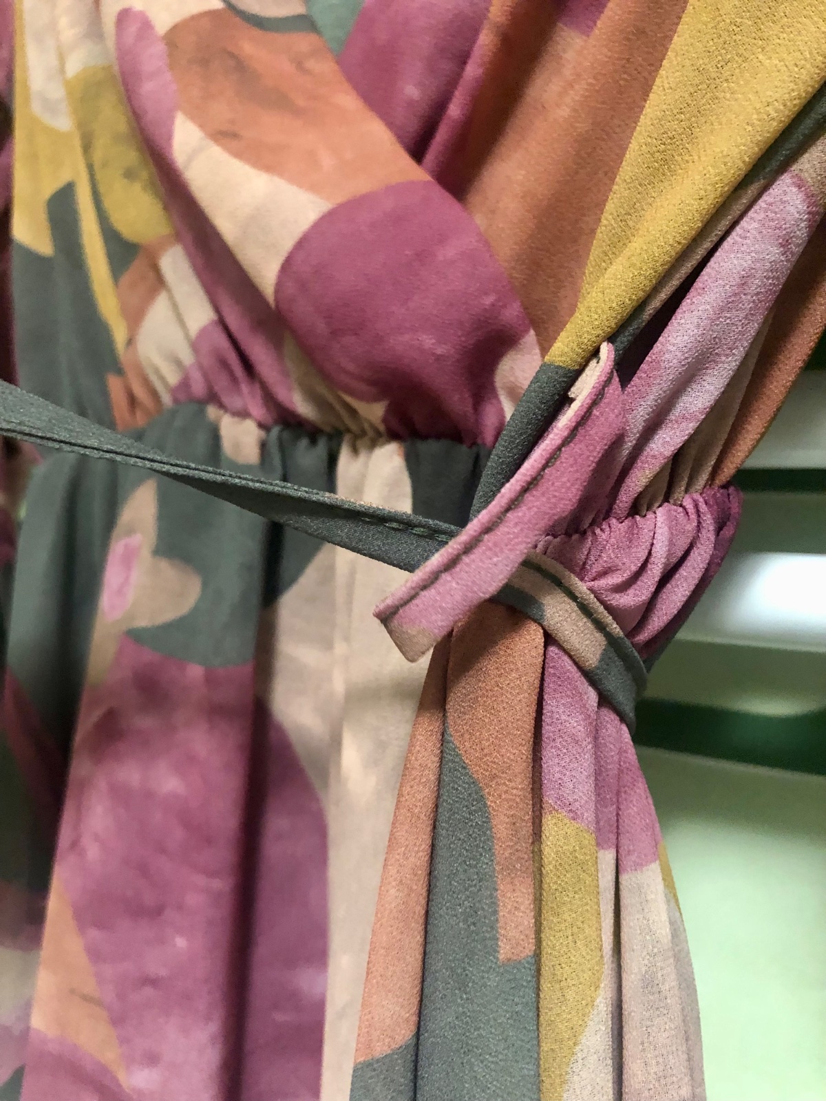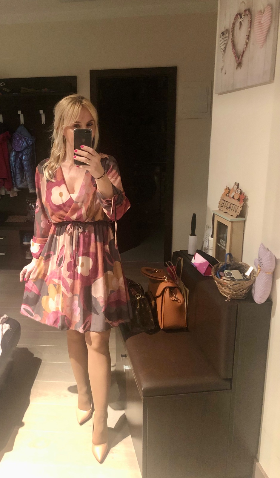Krásne elegantné šaty, kvetové, výrazné farby, v páse na opasok, podšité (viď foto). Rukávy pekne riešené ukončenie, sú 3/4-vé.