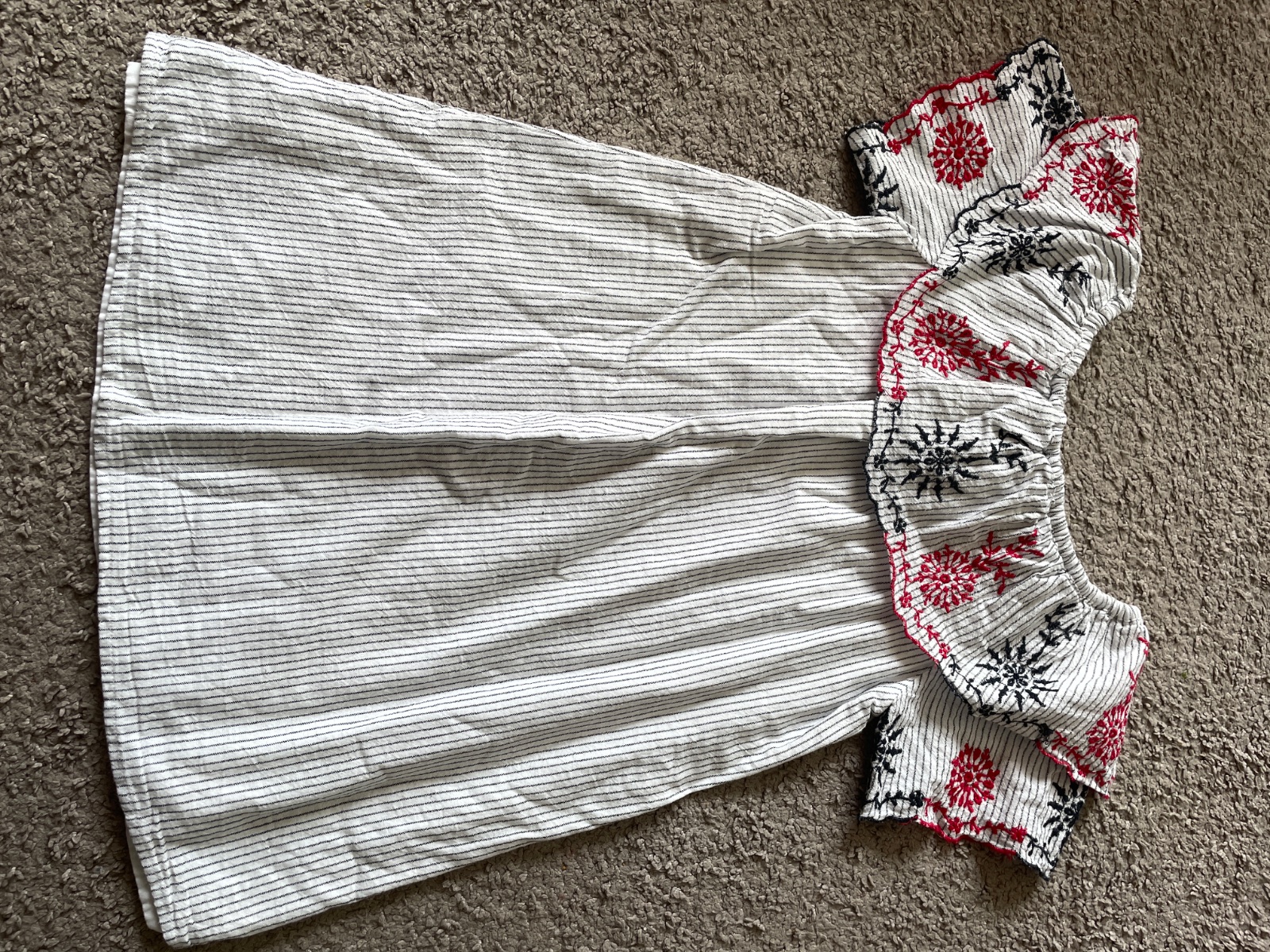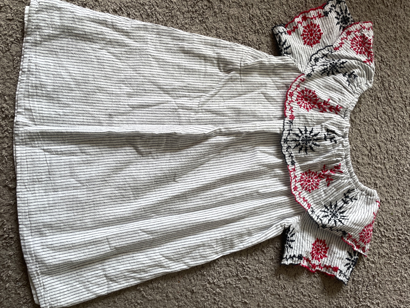 Výborný stav. Zapínanie na pleci na tri gombíky, výšivka kvetu, z ľahkej letnej látky. 100% viskóza. Dĺžka 65 cm, šírka pod pazuchami 37 cm.