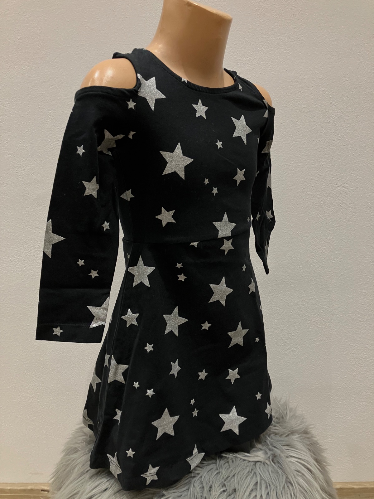 Dievčenské tenké šaty s otvorenými ramenami značky Lola Liza, dlhý rukáv, okrúhly výstrih, áčkový strih, riasenie v páse, s prestrihmi na ramenách, jemne elastické, jednofarebné čierne so striebornými lesklými hviezdičkami, materiál:95%bavlna,5%elastan.