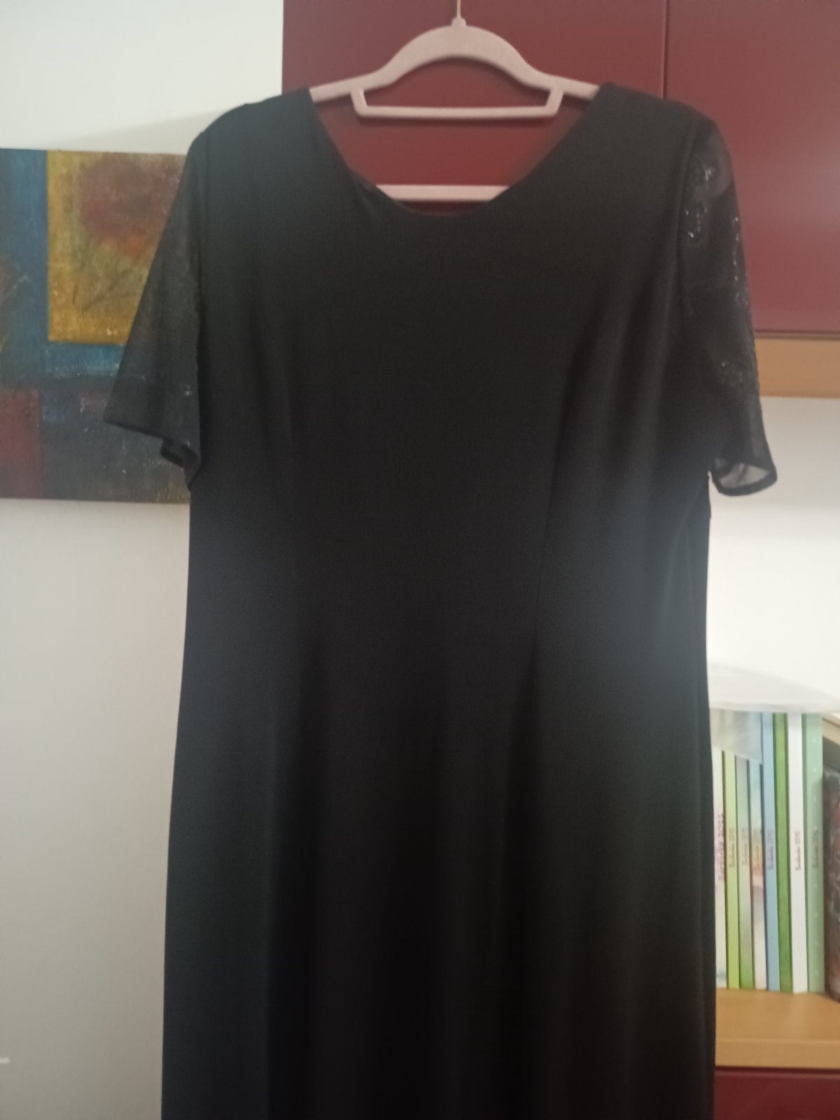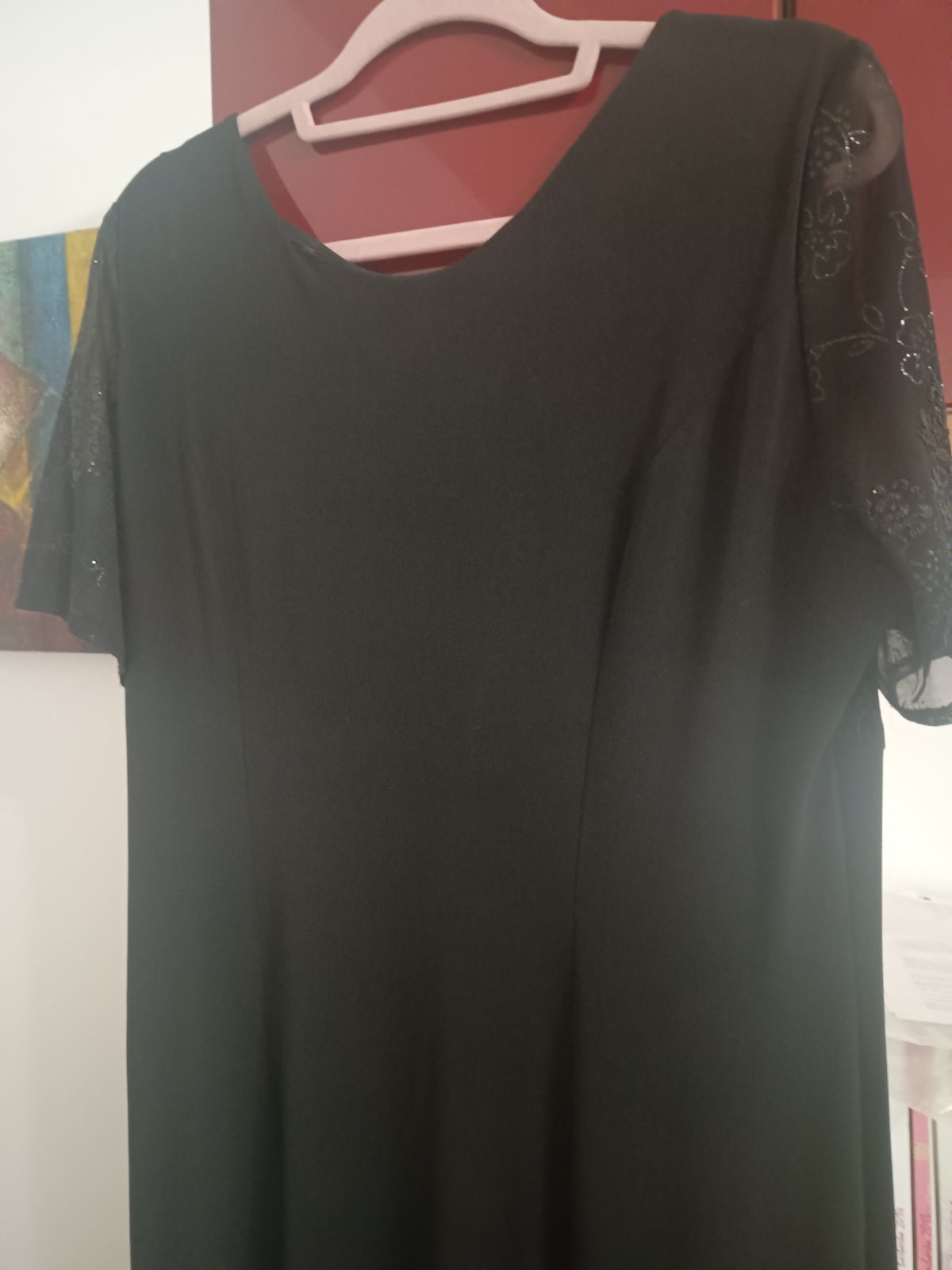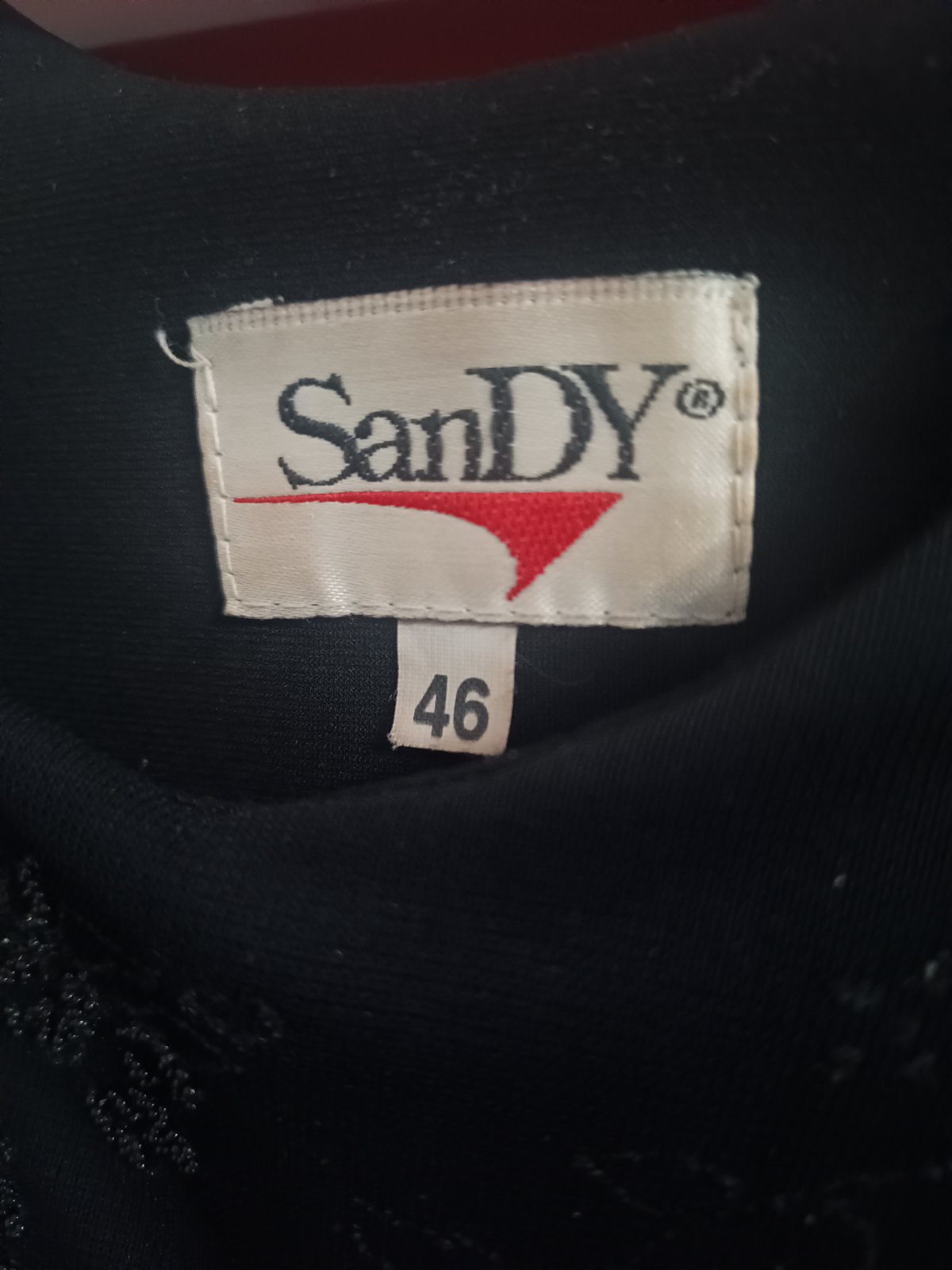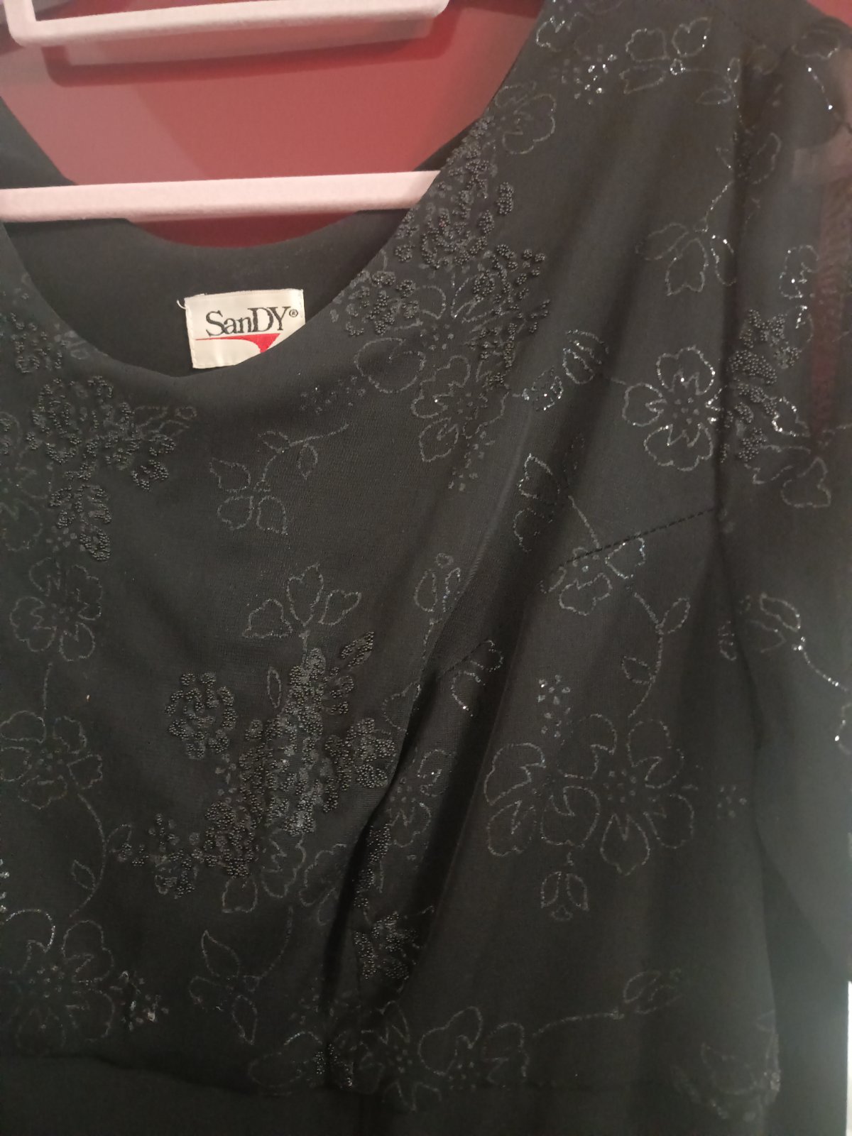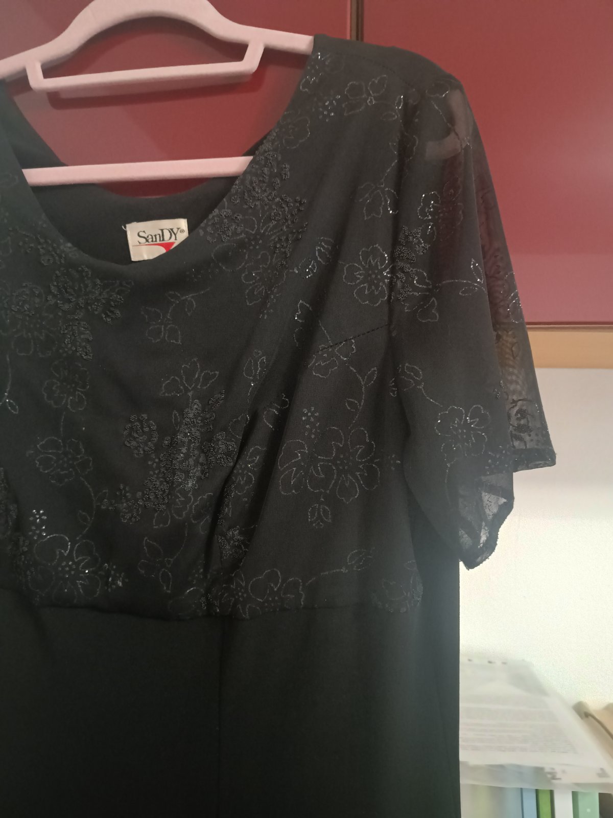 Spoločenské šaty veľ. na štítku 46, zn. SanDY v podpazuší 50 cm*2 a natiahne sa, štítok s materiálom chýba ale obsahuje elastan, splývavý materiál, dĺžka 135 cm