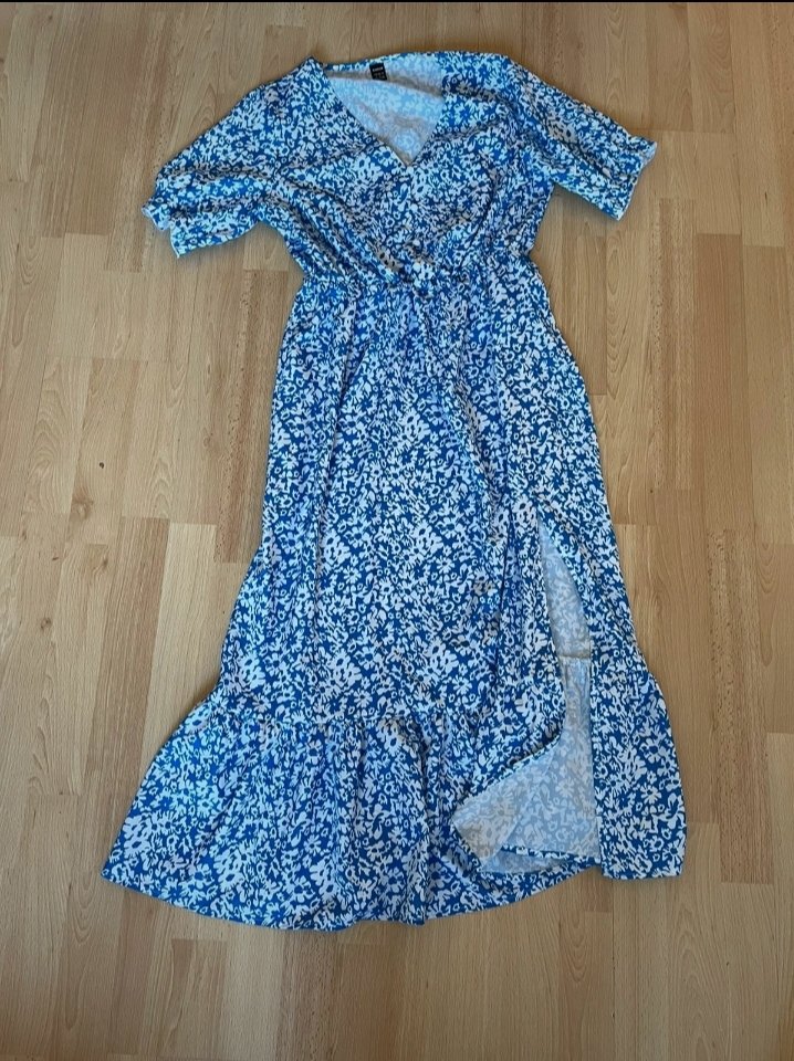Perfektné šaty z polyesteru, viskózy a elastanu, podšité elastickou tričkovinou. Dĺžka - cca 122 cm, šírka pod pazuchami - 2x 50 cm v kľude, cez gumičku - 2x 32/42 cm, boky - 2x 60 cm. UNI veľkosť,...