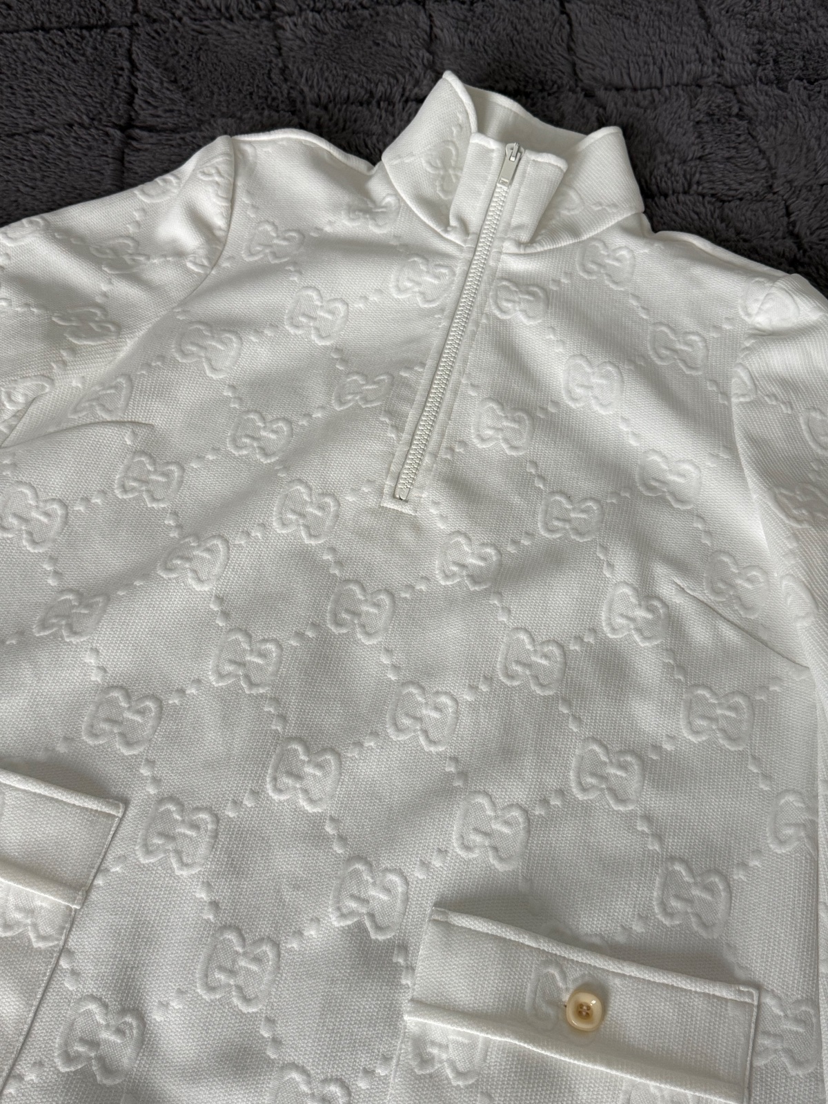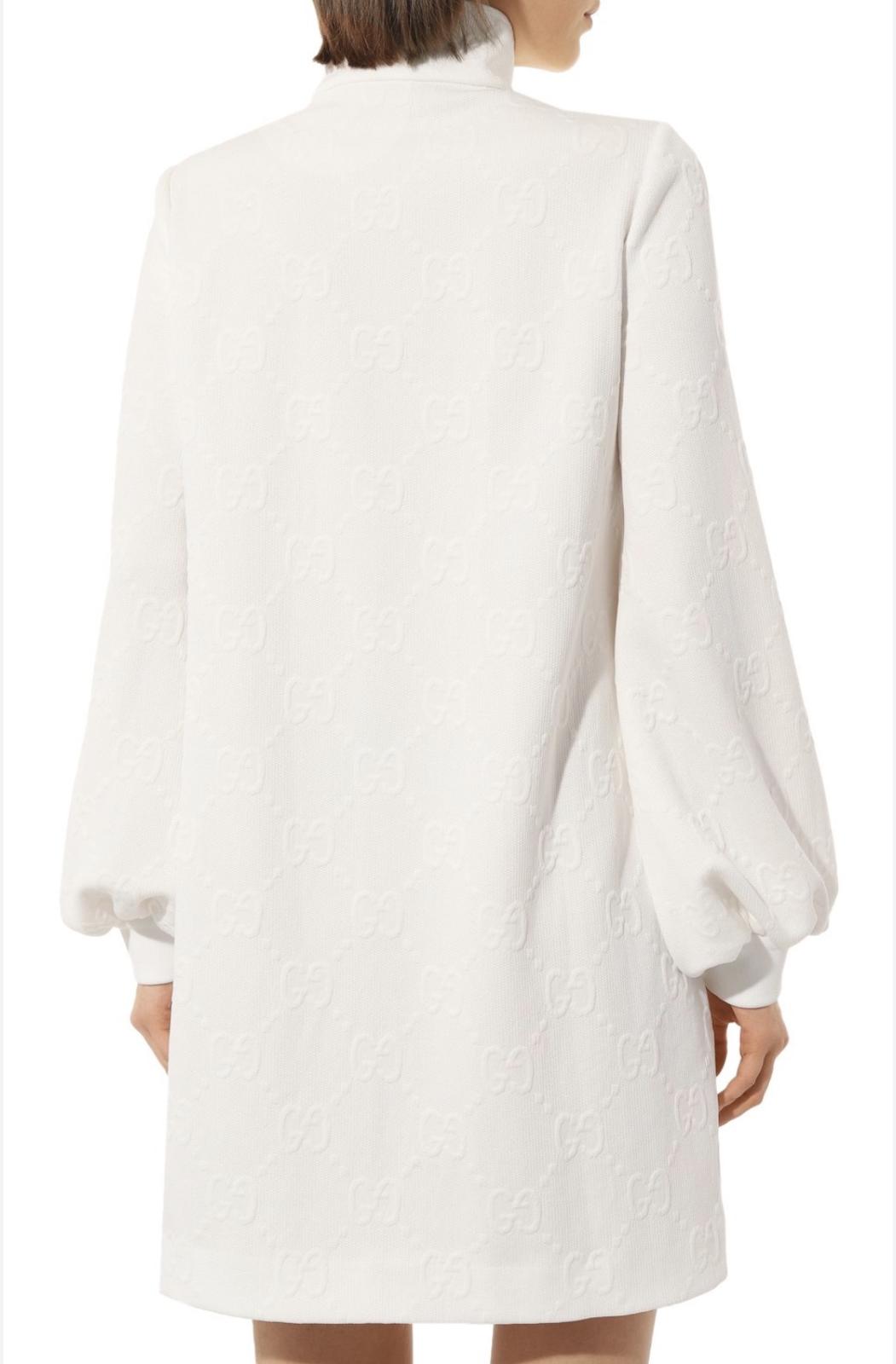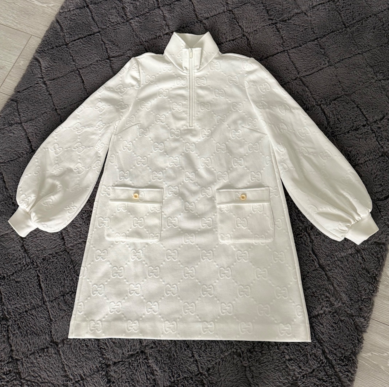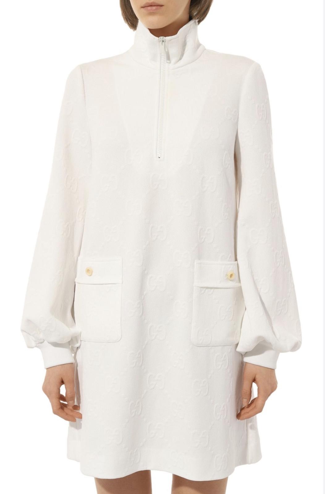 Luxusné biele mini šaty značky Gucci Jacquard s celoplošným vzorom monogramu GG Supreme. Voľnejší strih s balónovými rukávmi ukončenými manžetami. Vpredu sa nachádza krátky zips a dve našité vrecká zdobené gombíkmi. Velkosť S. Super nosený stav, bez poškodenia.