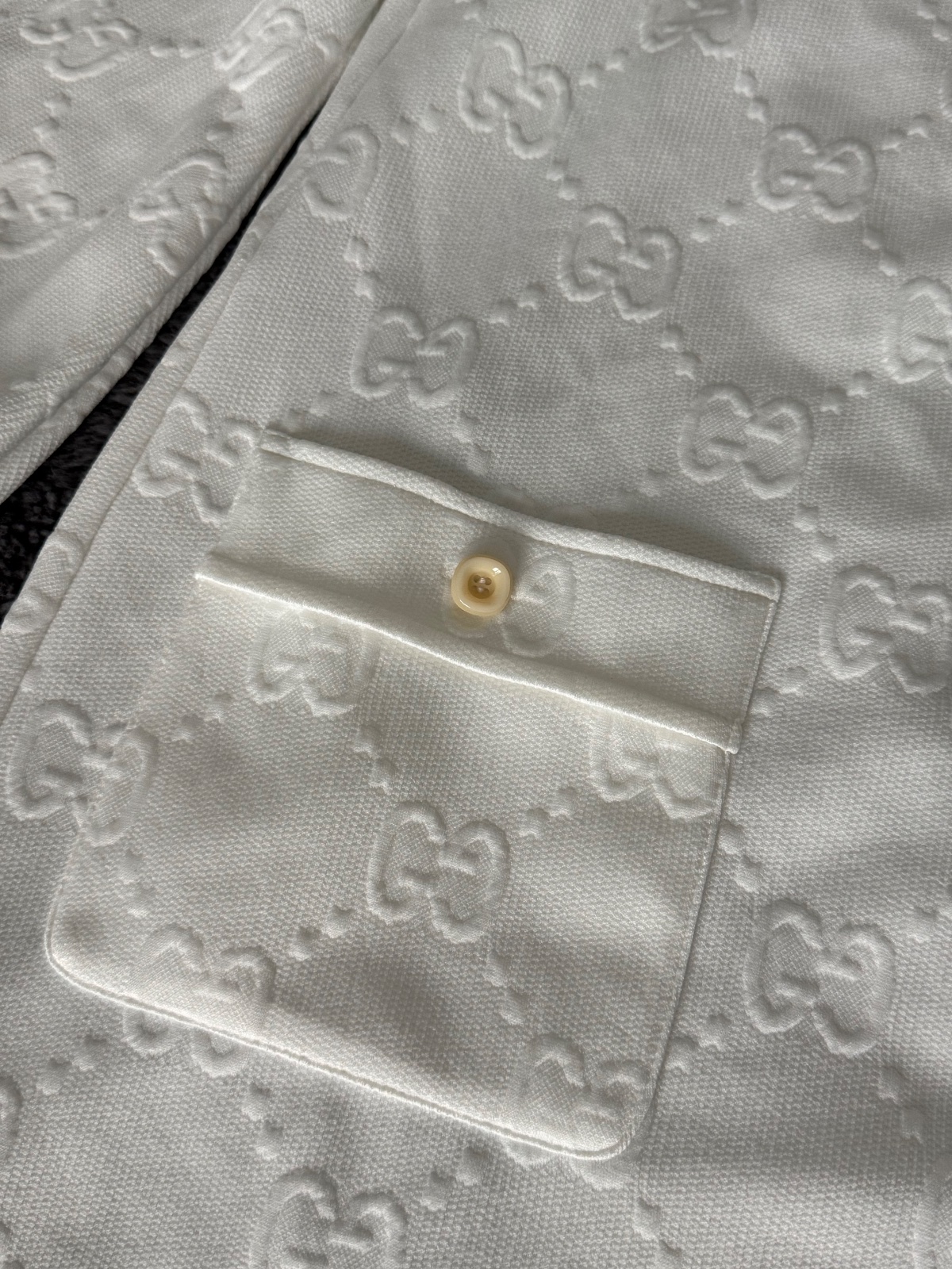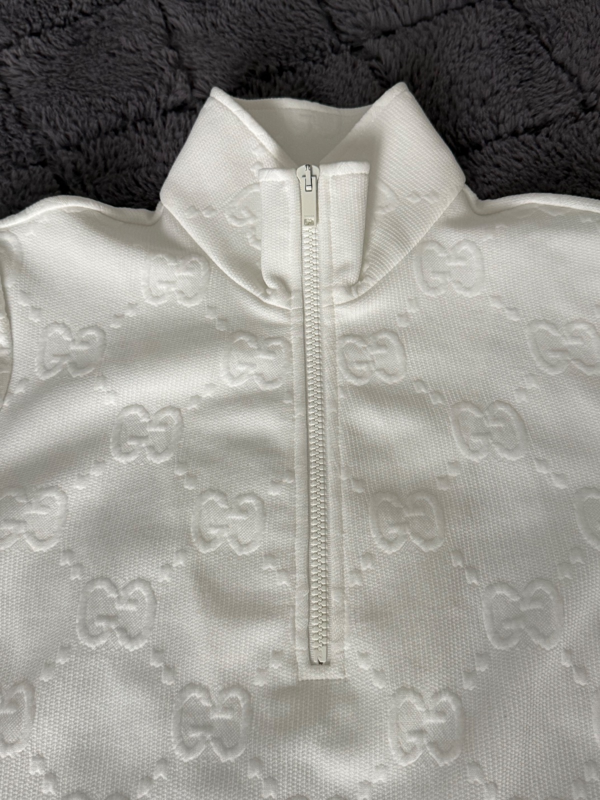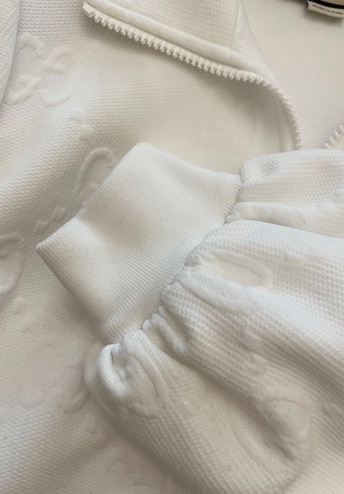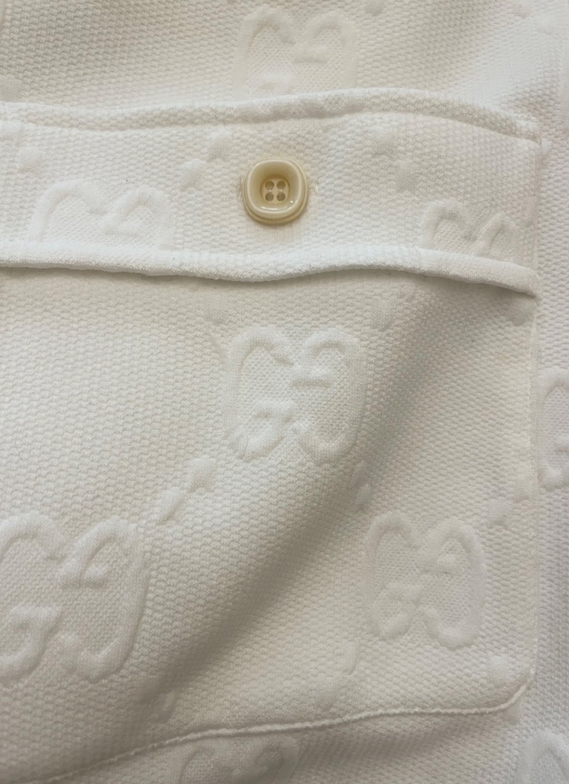 Luxusné biele mini šaty značky Gucci Jacquard s celoplošným vzorom monogramu GG Supreme. Voľnejší strih s balónovými rukávmi ukončenými manžetami. Vpredu sa nachádza krátky zips a dve našité vrecká zdobené gombíkmi. Velkosť S. Super nosený stav, bez poškodenia.