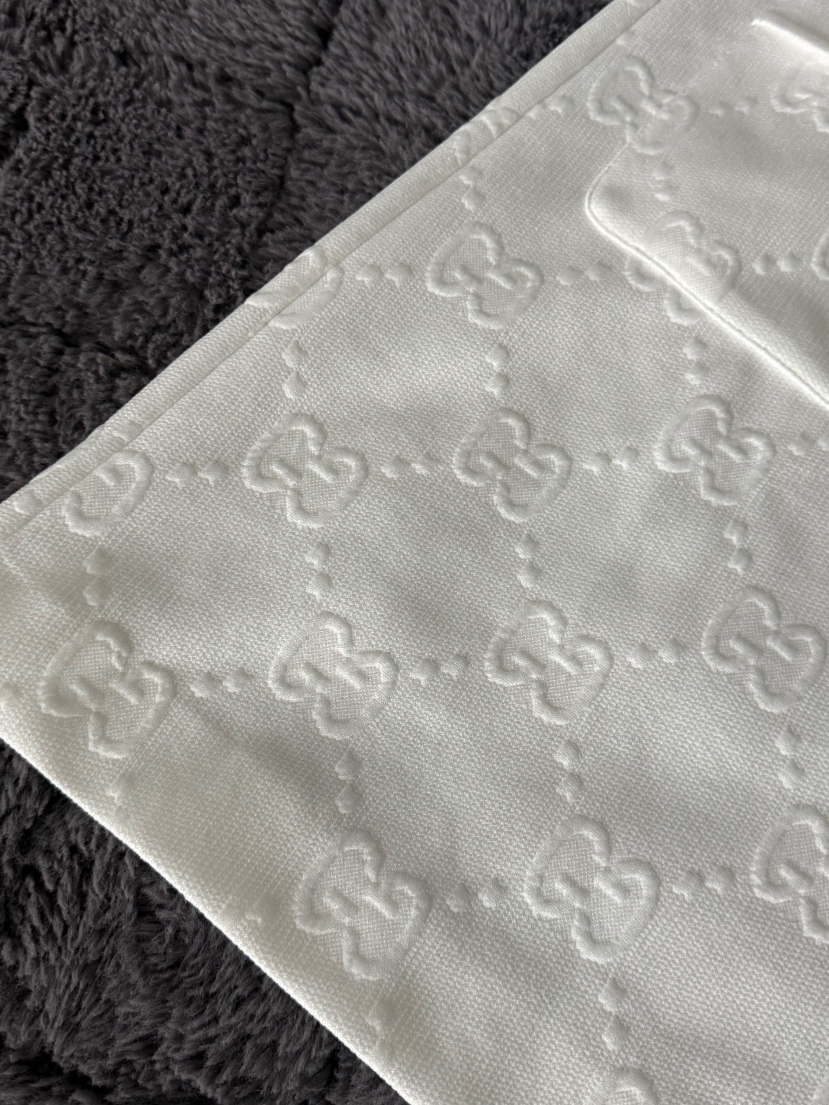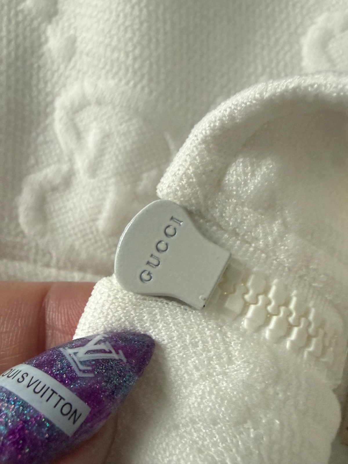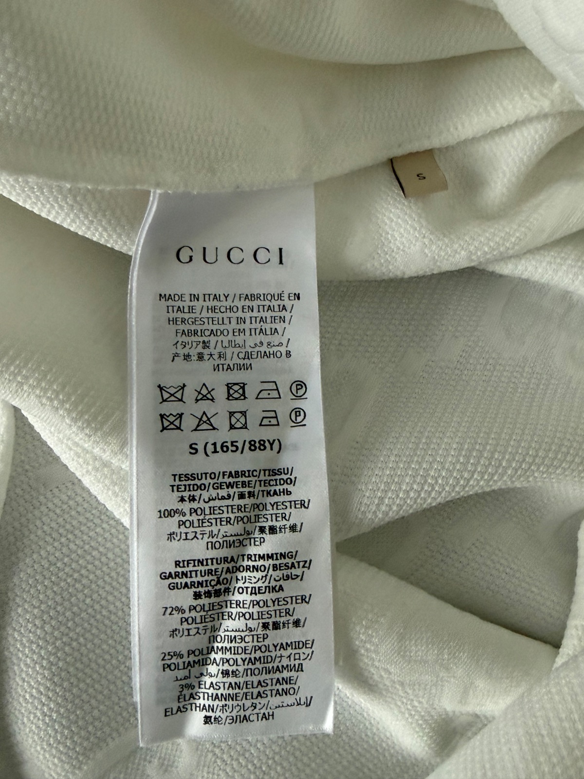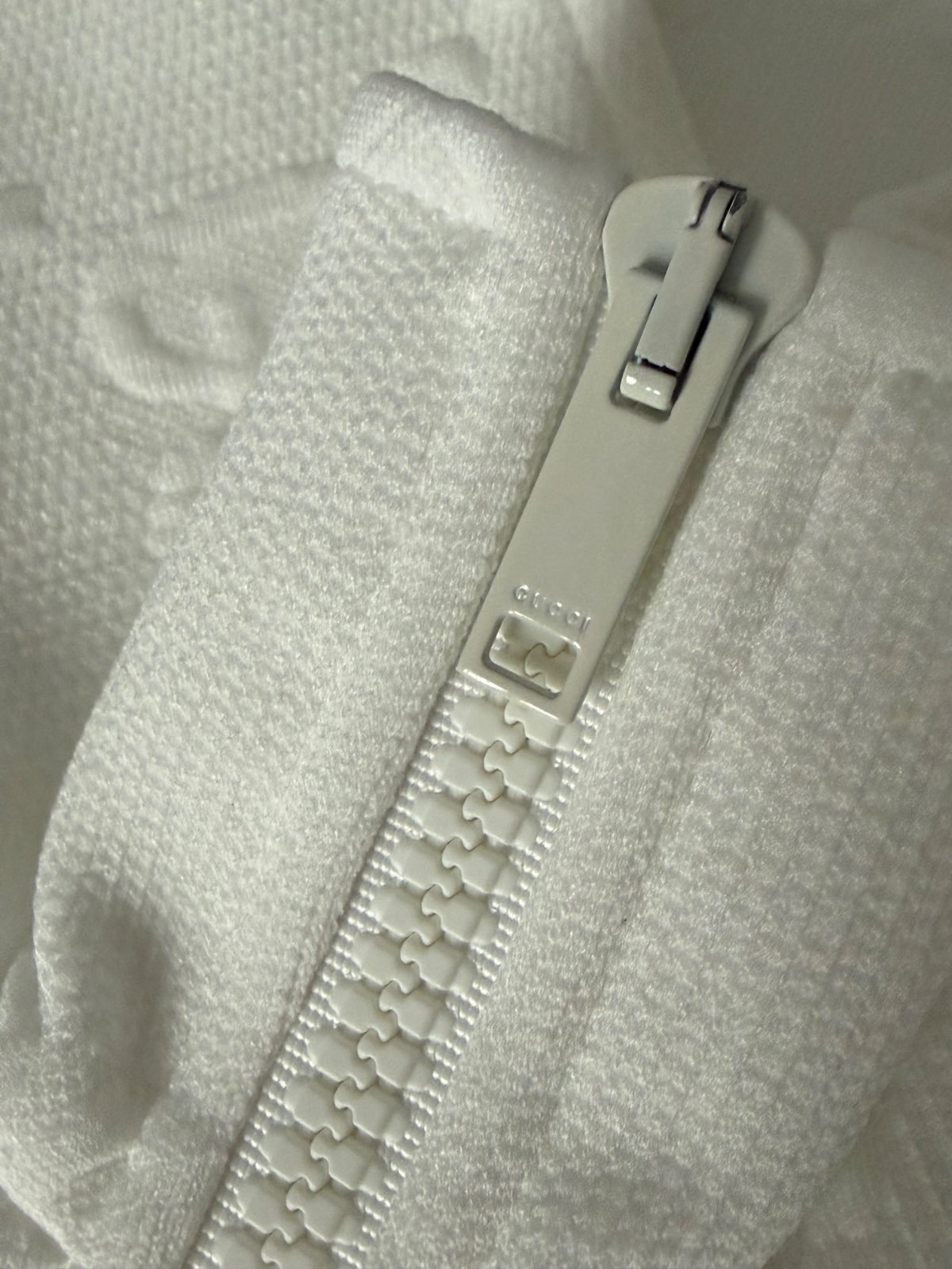 Luxusné biele mini šaty značky Gucci Jacquard s celoplošným vzorom monogramu GG Supreme. Voľnejší strih s balónovými rukávmi ukončenými manžetami. Vpredu sa nachádza krátky zips a dve našité vrecká zdobené gombíkmi. Velkosť S. Super nosený stav, bez poškodenia.