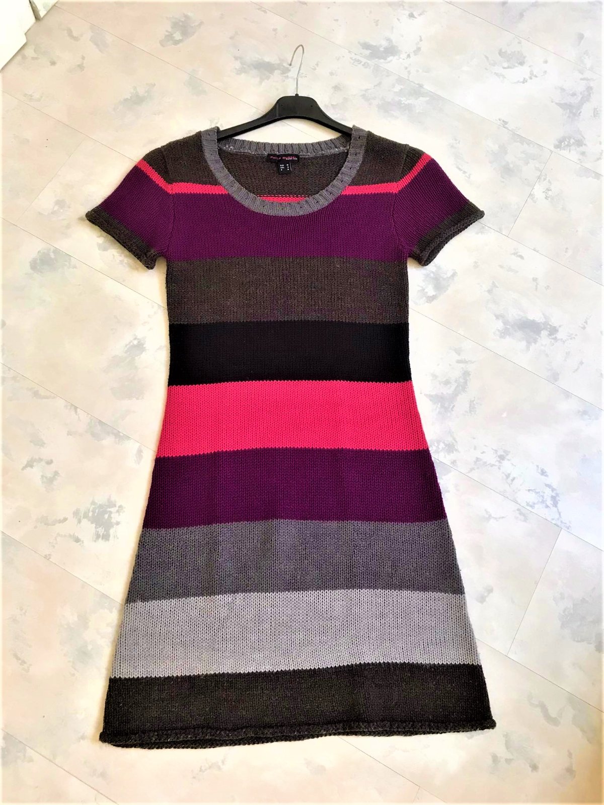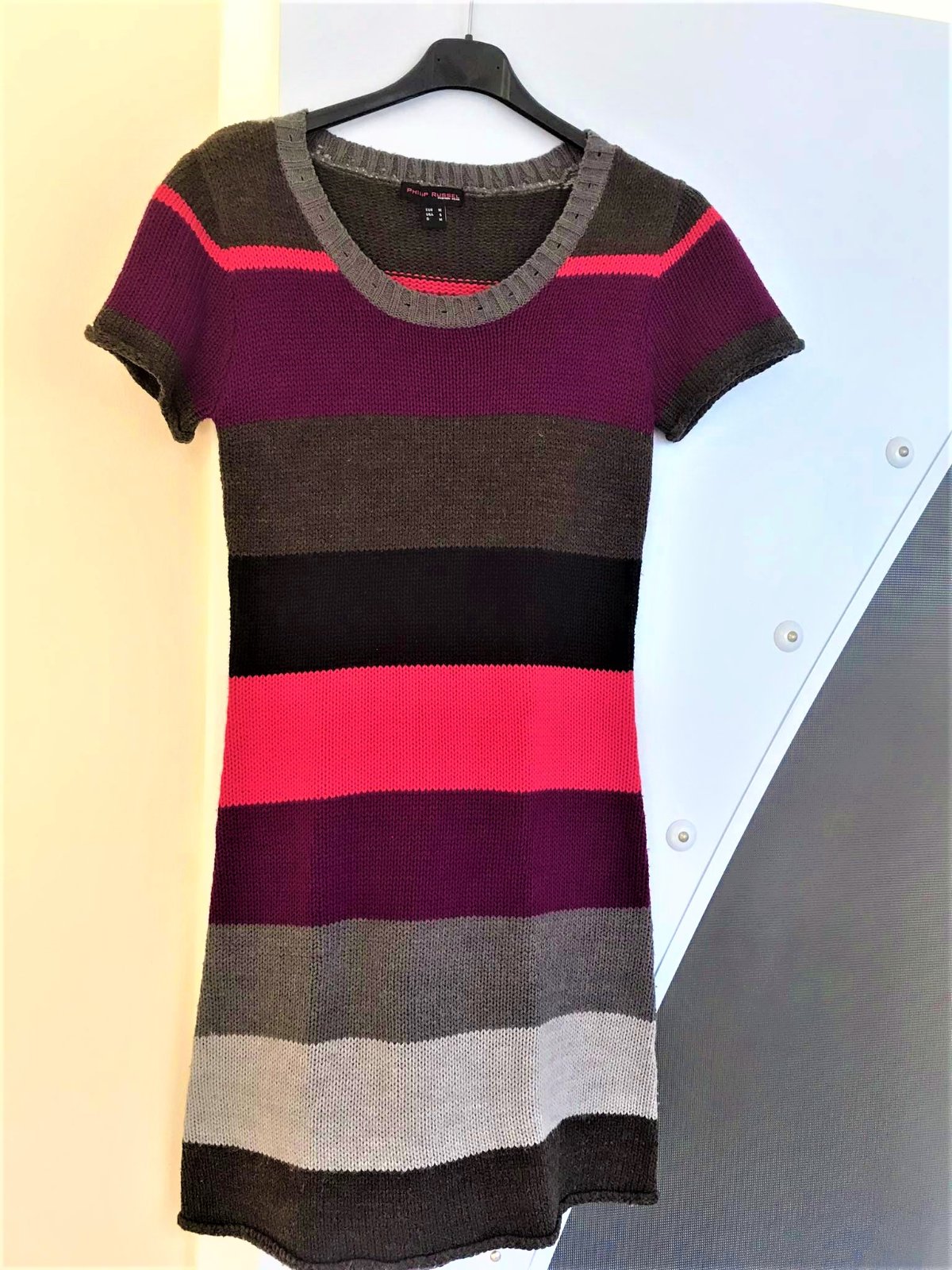krásne farebné pletené minišaty,pekne vytvarované na postavu, super k legínam,alebo hrubým pančuškám,pod to roláčik/košeľu/tričko,šírka meraná pod pazuchou = 43 x 2 cm,šírka meraná na spodku = 55 x 2 cm, dlžka celkom = 94 cm, dlžka meraná na boku od pazuchy smerom dolu = 75 cm,je to pletenina,pekne sa poddajú