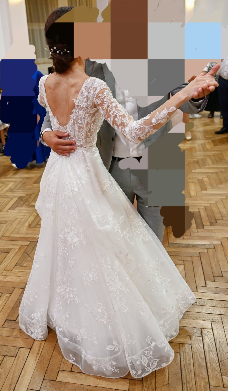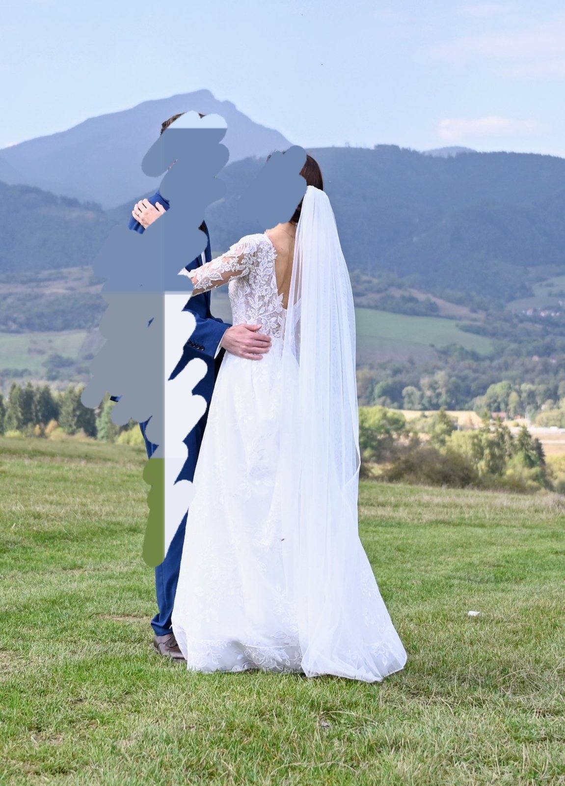 svadobné šaty pre štíhlu nevestu, na výšku cca 168cm (+4,5cm opätok), v páse sa dajú trošku povoliť, vlečka sa dá spustiť (mala som vypnutú, tak nemám foto) kupované v salóne, som prvá majiteľka, čistené v čistiarni, predám spolu s malou kruhovou spodničkou a jednoduchým závojom (na foto), možné vyskúšať DK/RK, v príp. záujmu premeriam alebo pošlem ďalšie foto