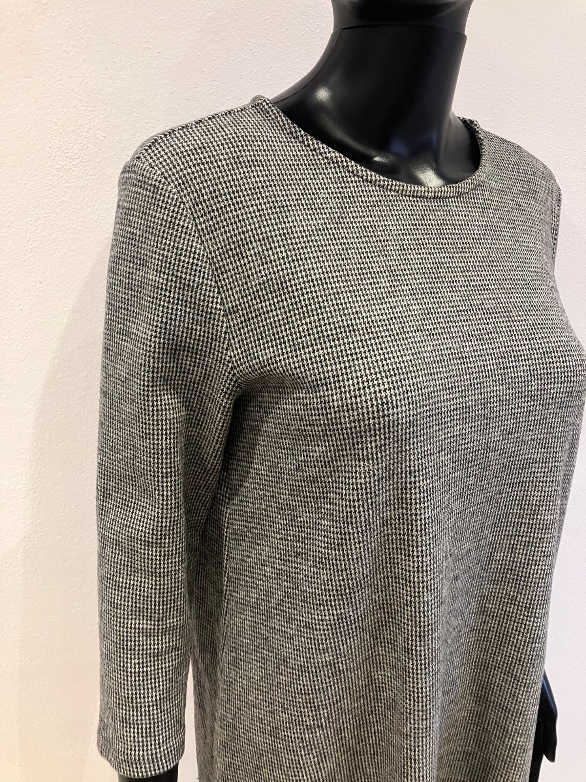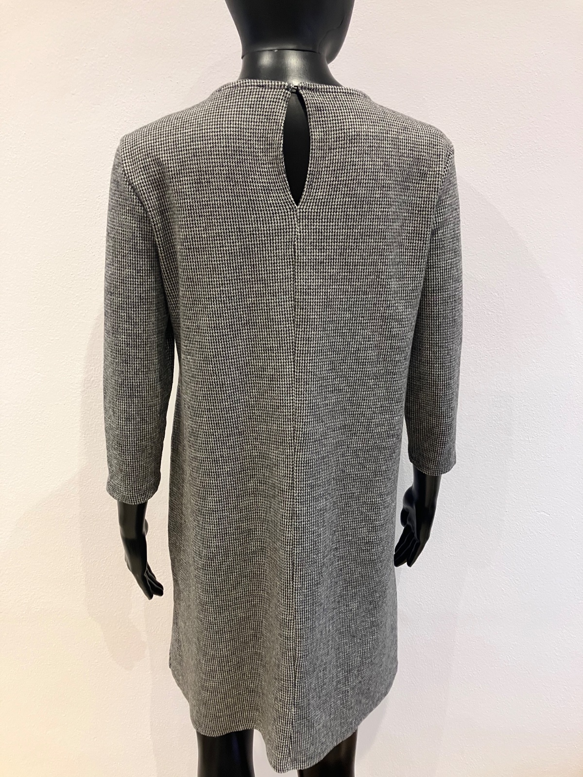 Dámske šaty s trojštvrťovým rukávom, čiernobiele, vzorované, elastické, zapínanie vzadu na jeden gombík.