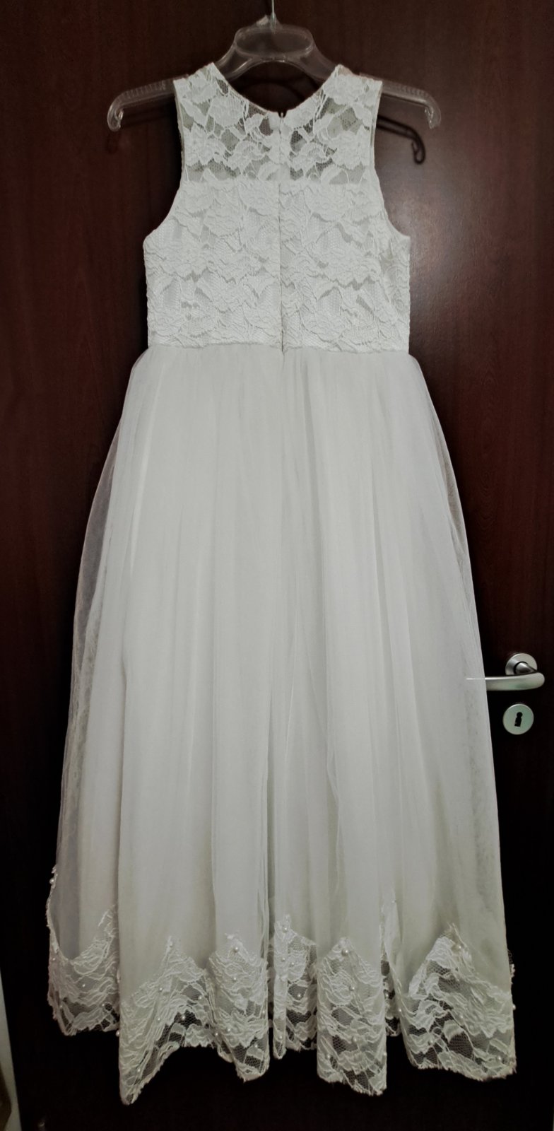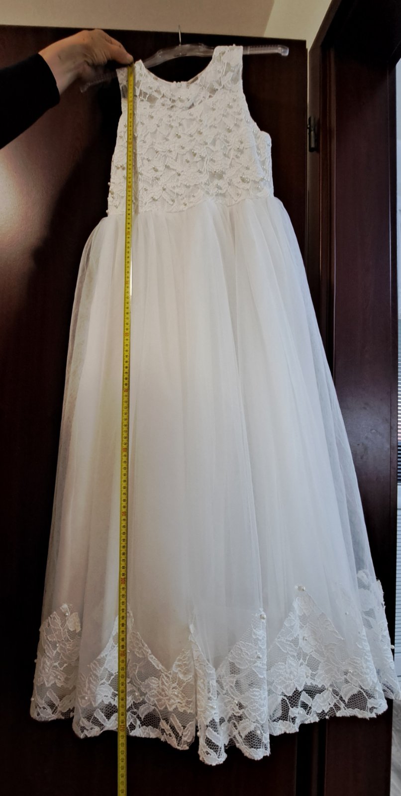 Krasne saty na 1. sväte prijimanie. Zapinanie vzadu na zips plus masla okolo pasu. Na vysacke je cislo 150 ale dcerka nosila v tej dobe bezne saty c.128 a boli jej dobre, dlhe "az po zem", niekto u...