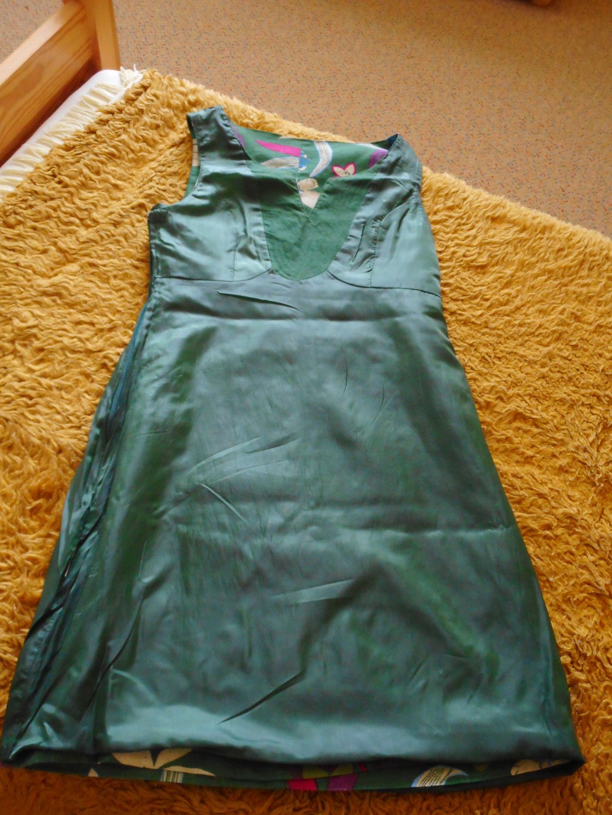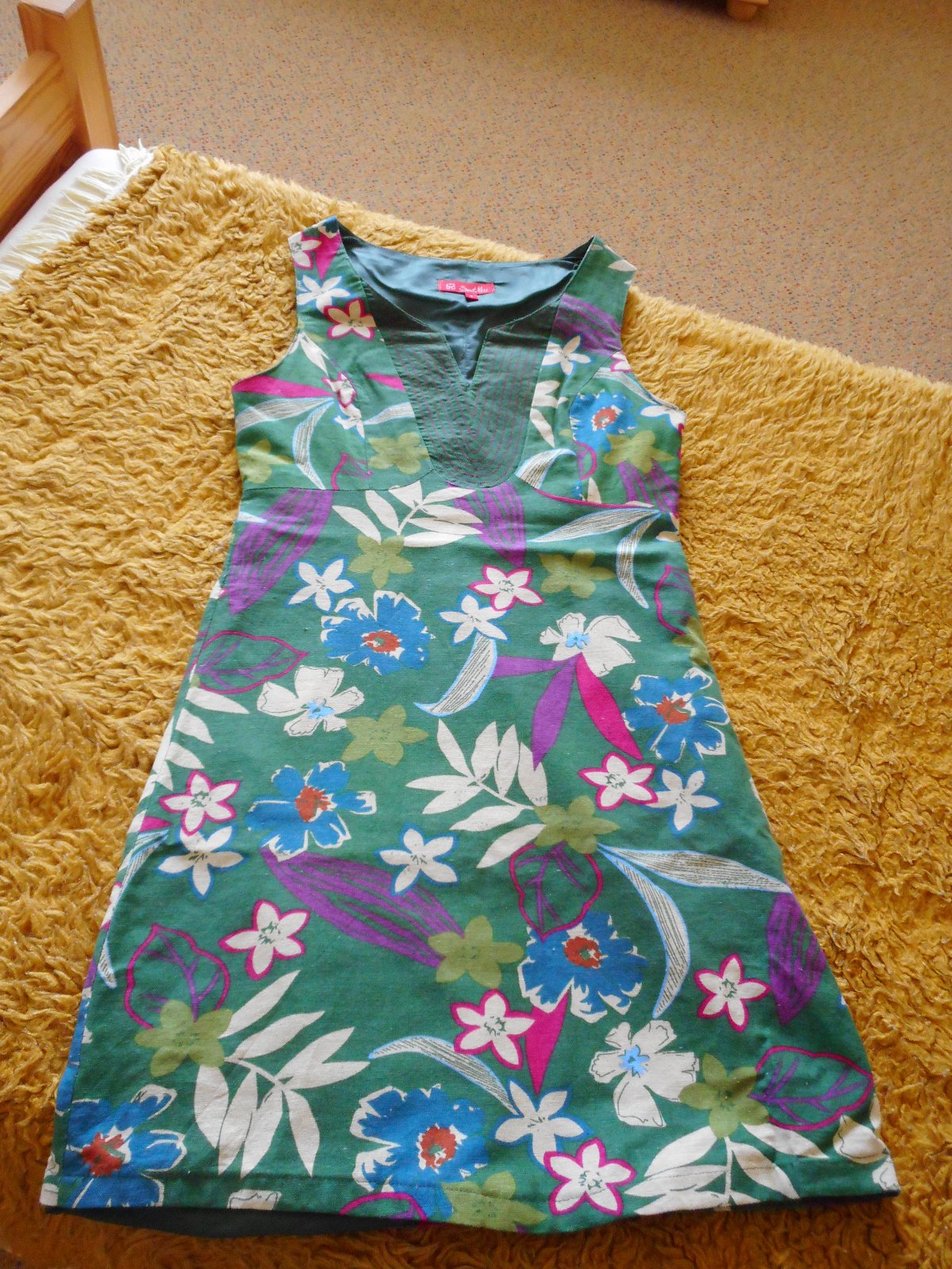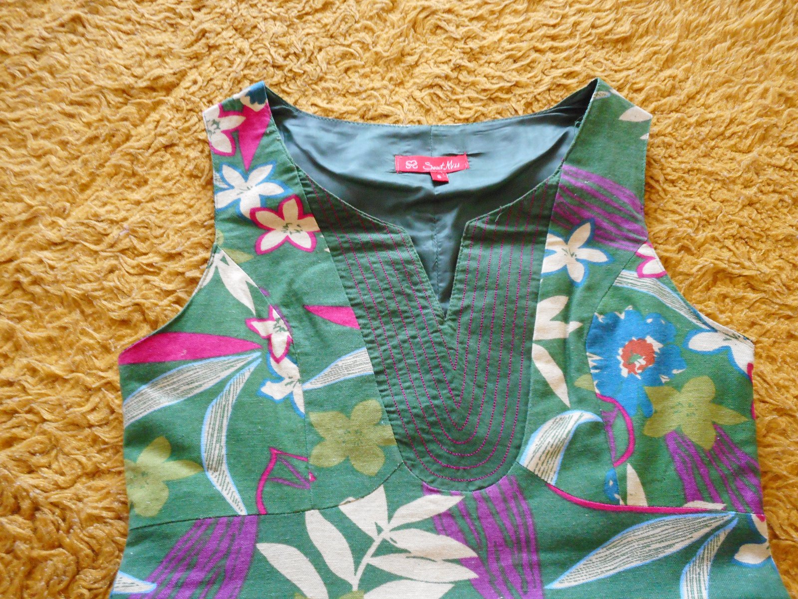 predám používané, nepoškodené letné bavlnené dámske letné šaty mierne do tvaru písmena A, podšité, zn. Sweet Miss, veľkosť S bez rukávov s výstrihom do tvaru písmena V, zelenej farby ako podklad s potlačou kvetov, tvarované cez prsia, zapínanie na boku na krytý zips, celková dĺžka šiat je 86cm, šírka pod pazuchami je 42cm