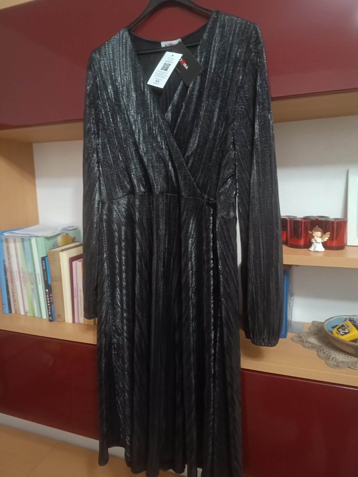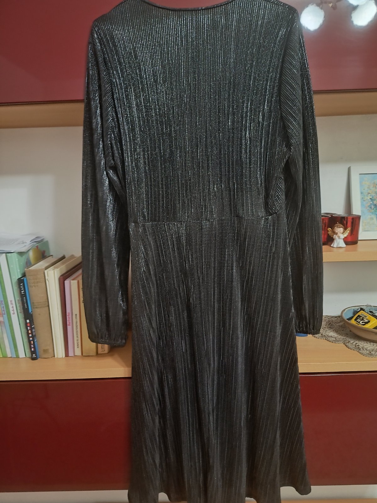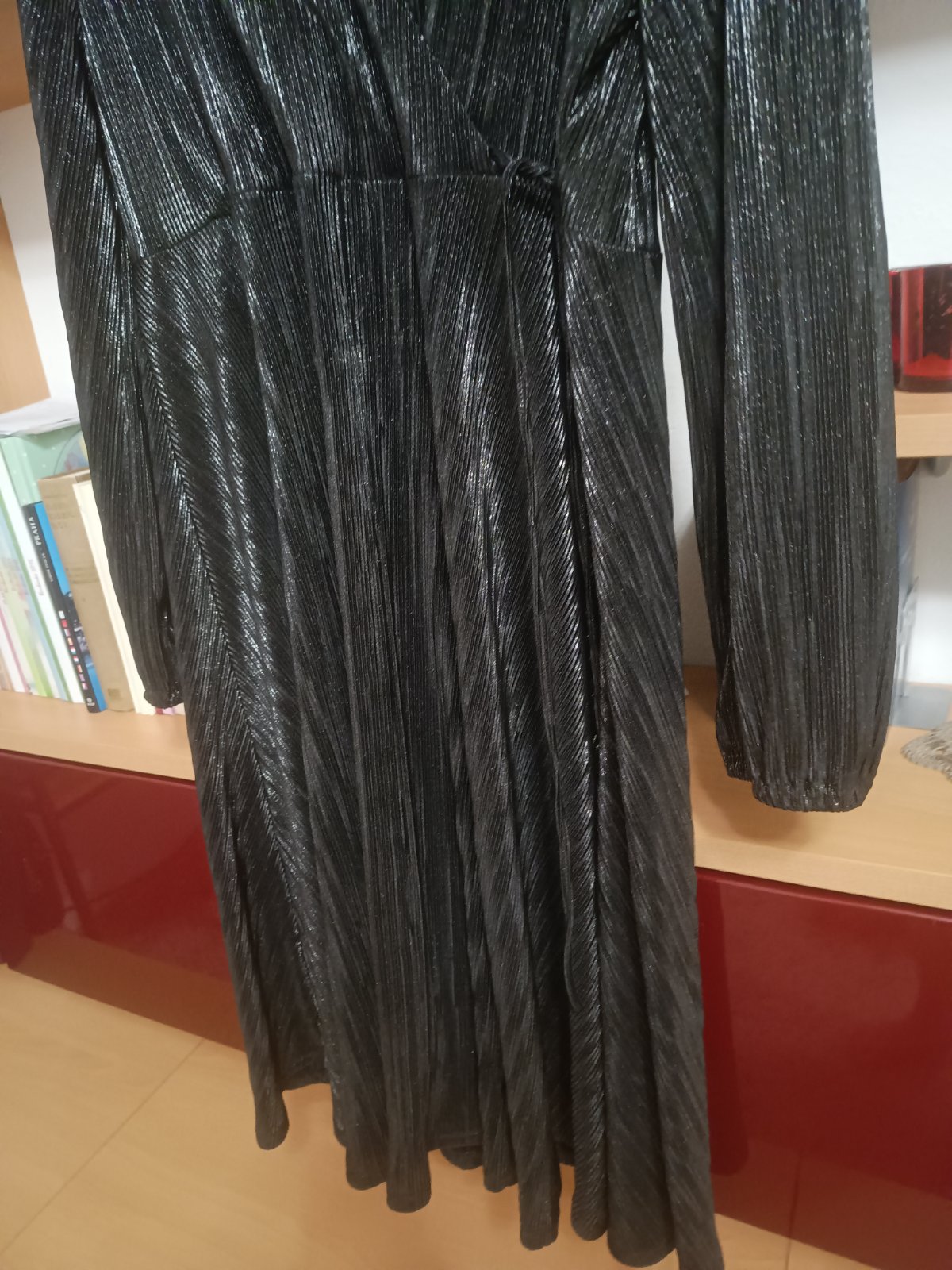 Spoločenské šaty veľ.48, nenosené, šírka v podpazuší 58 cmx2, boky 66 cmx2, dĺžka 115 cm, dĺžka rukáva 61 cm, rukáv je ukončený gumičkou, lesklá ľahká látka