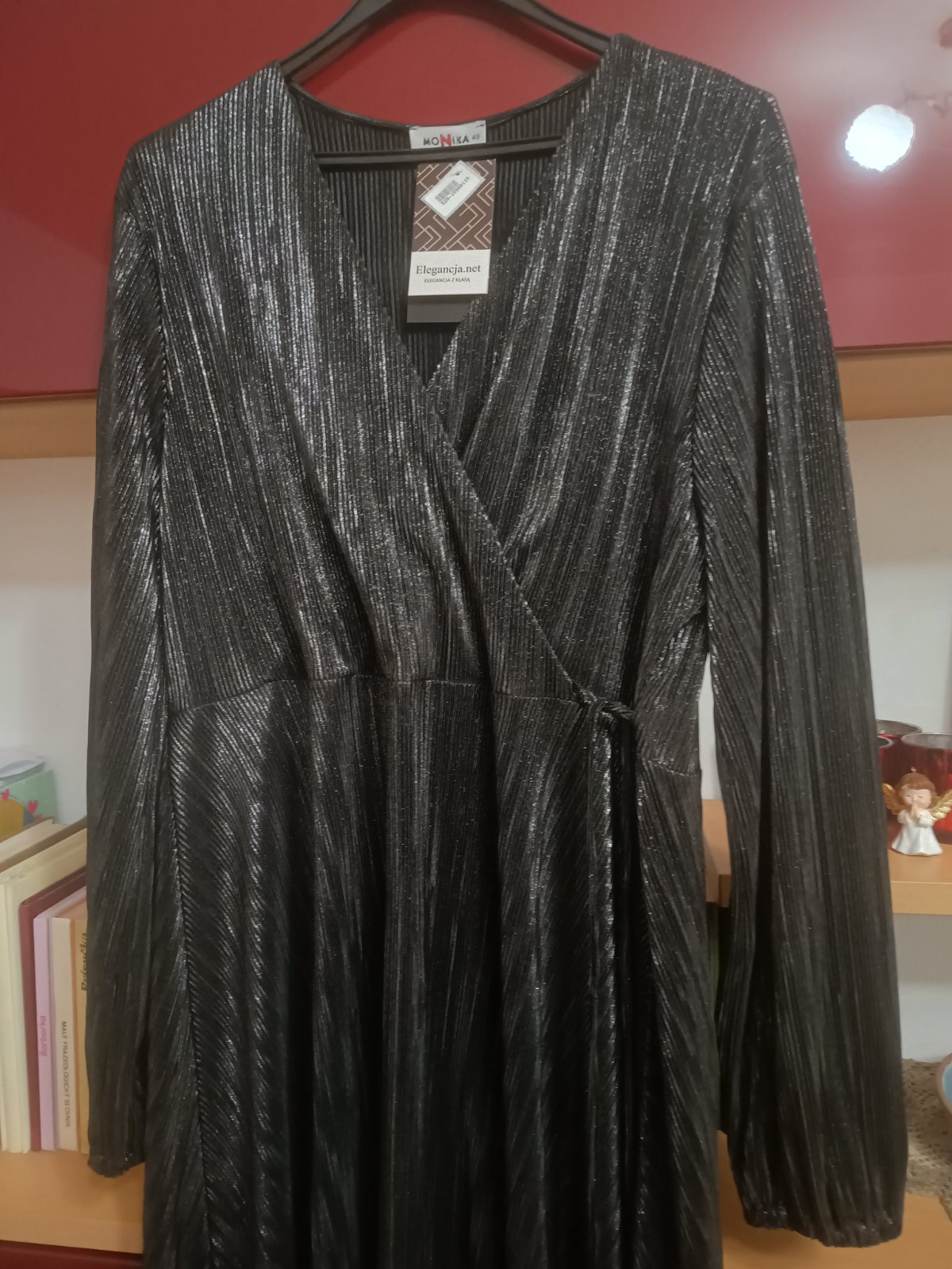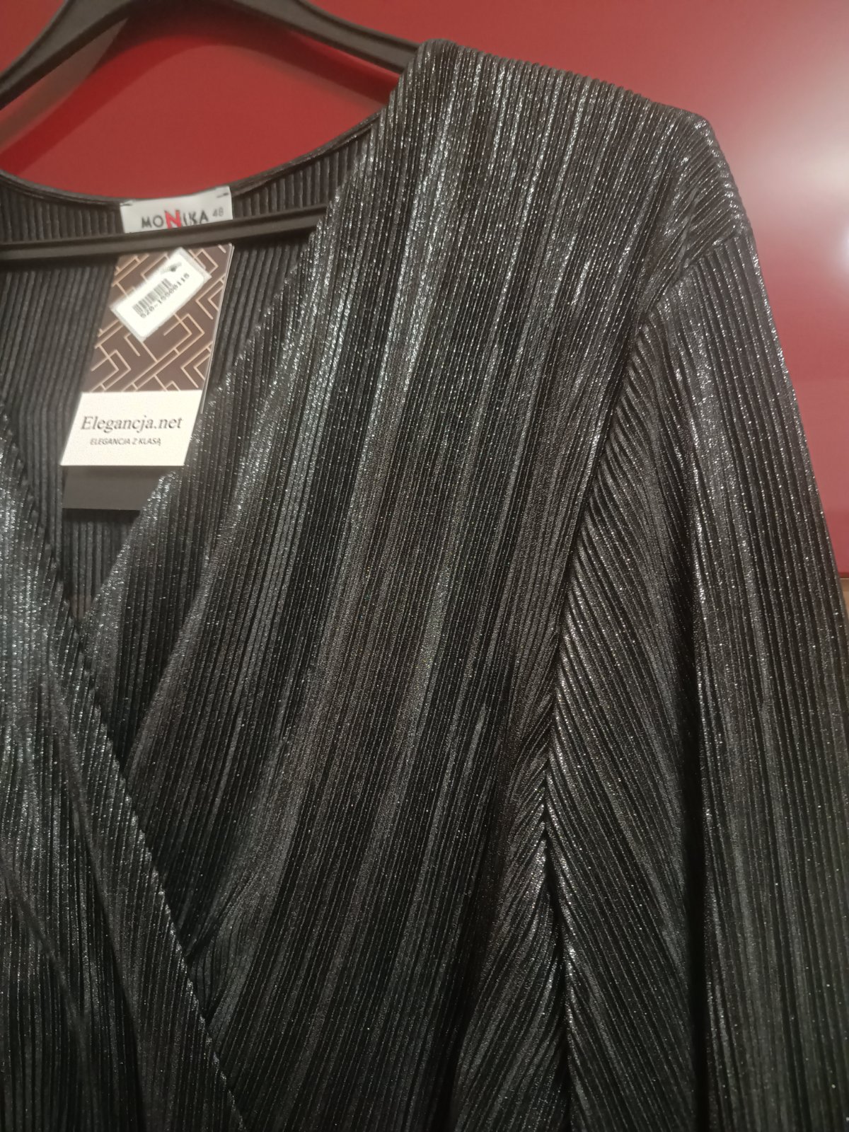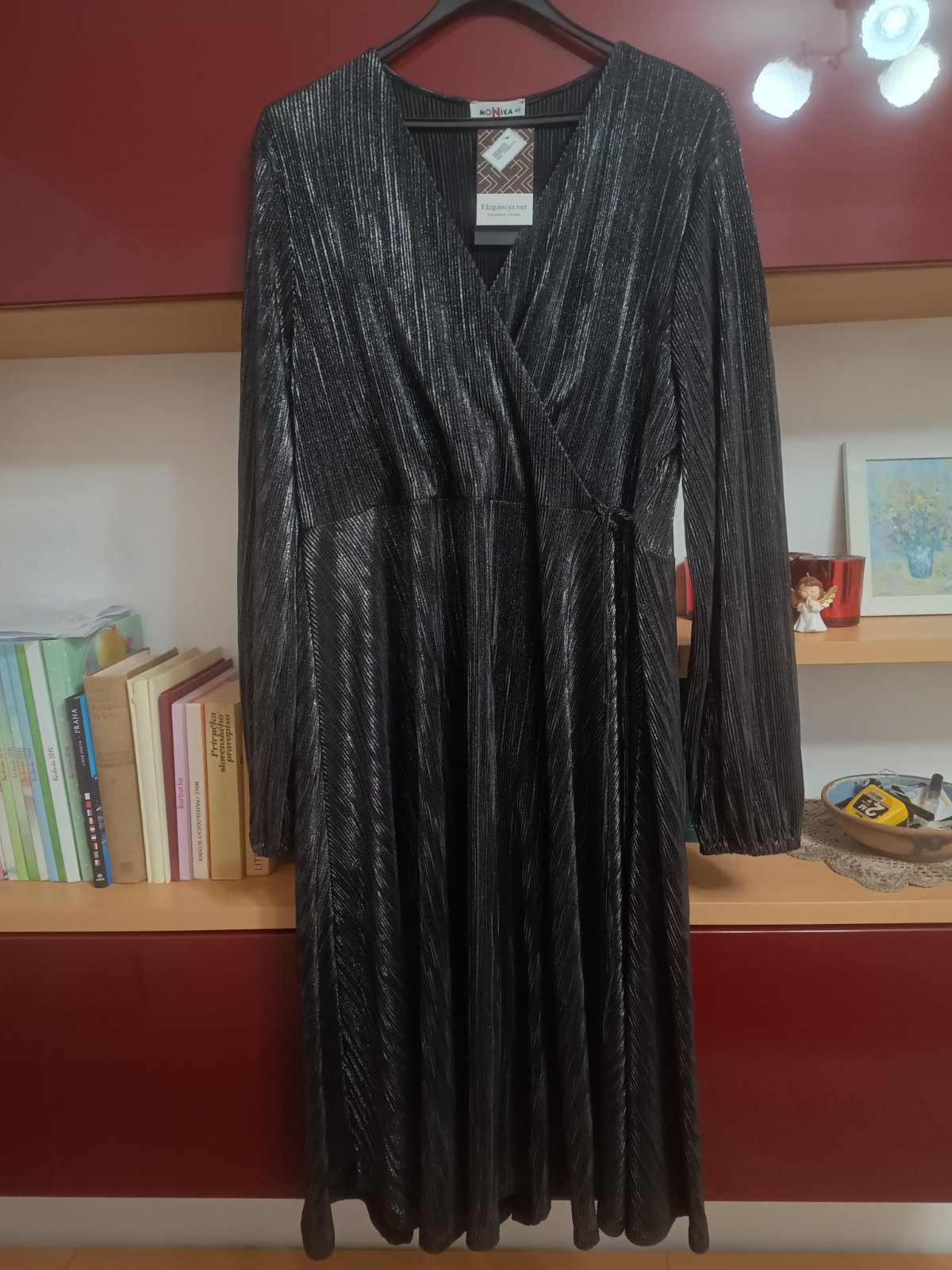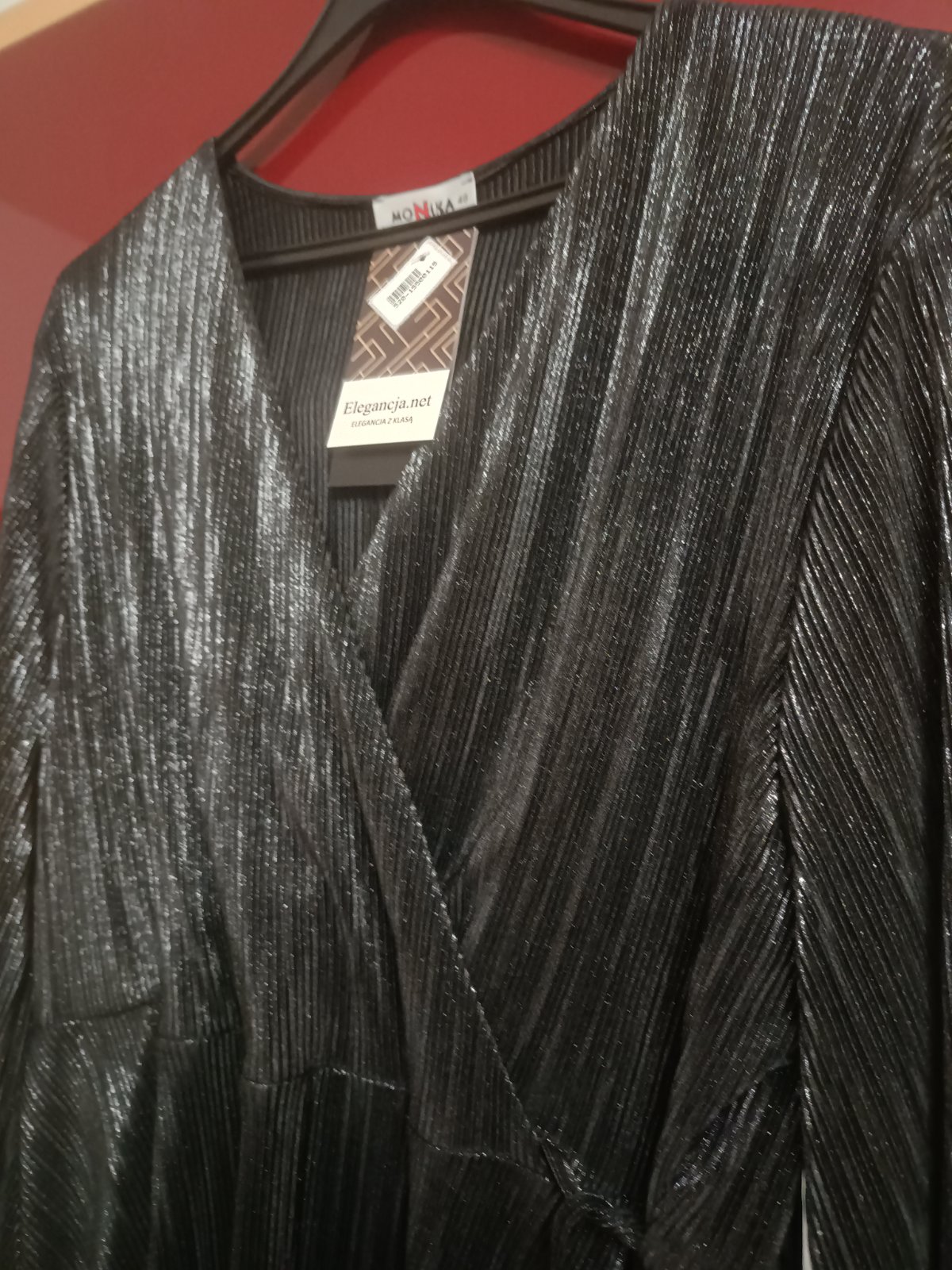 Spoločenské šaty veľ.48, nenosené, šírka v podpazuší 58 cmx2, boky 66 cmx2, dĺžka 115 cm, dĺžka rukáva 61 cm, rukáv je ukončený gumičkou, lesklá ľahká látka