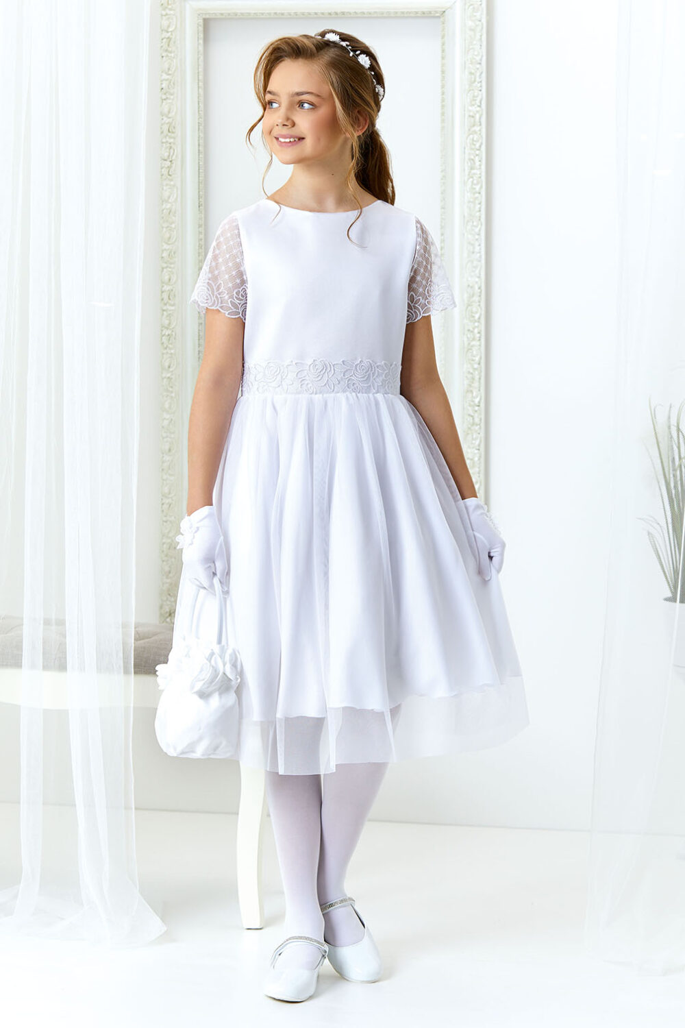 V páse je vpredu čipka a vzadu tylová vlečka.
