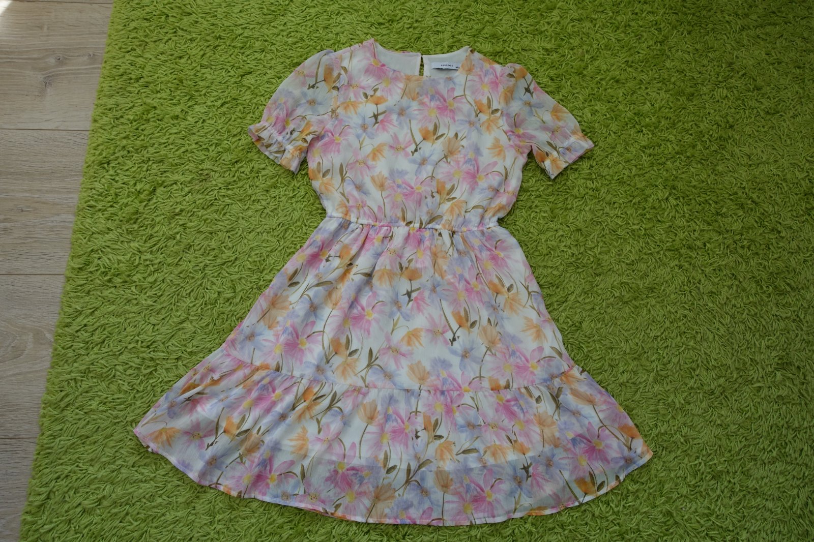 Predám krásne ľahké kvietočkavé šatočky so spodničkou značky Reserved. Mali sme ich 1-2x, ale sú top stav. Celková dĺžka od pliecka po spodok je 83 cm (dĺžka po koniec spodničky je 75 cm). Šírka meraná popod pazuškami je 40 cm. V páse je gumička. Šírka pásu v kľude je 30 cm, ale natiahne sa natiahne aj do 40 cm. Vzadu pri krku sa rozopínajú na gombičku.