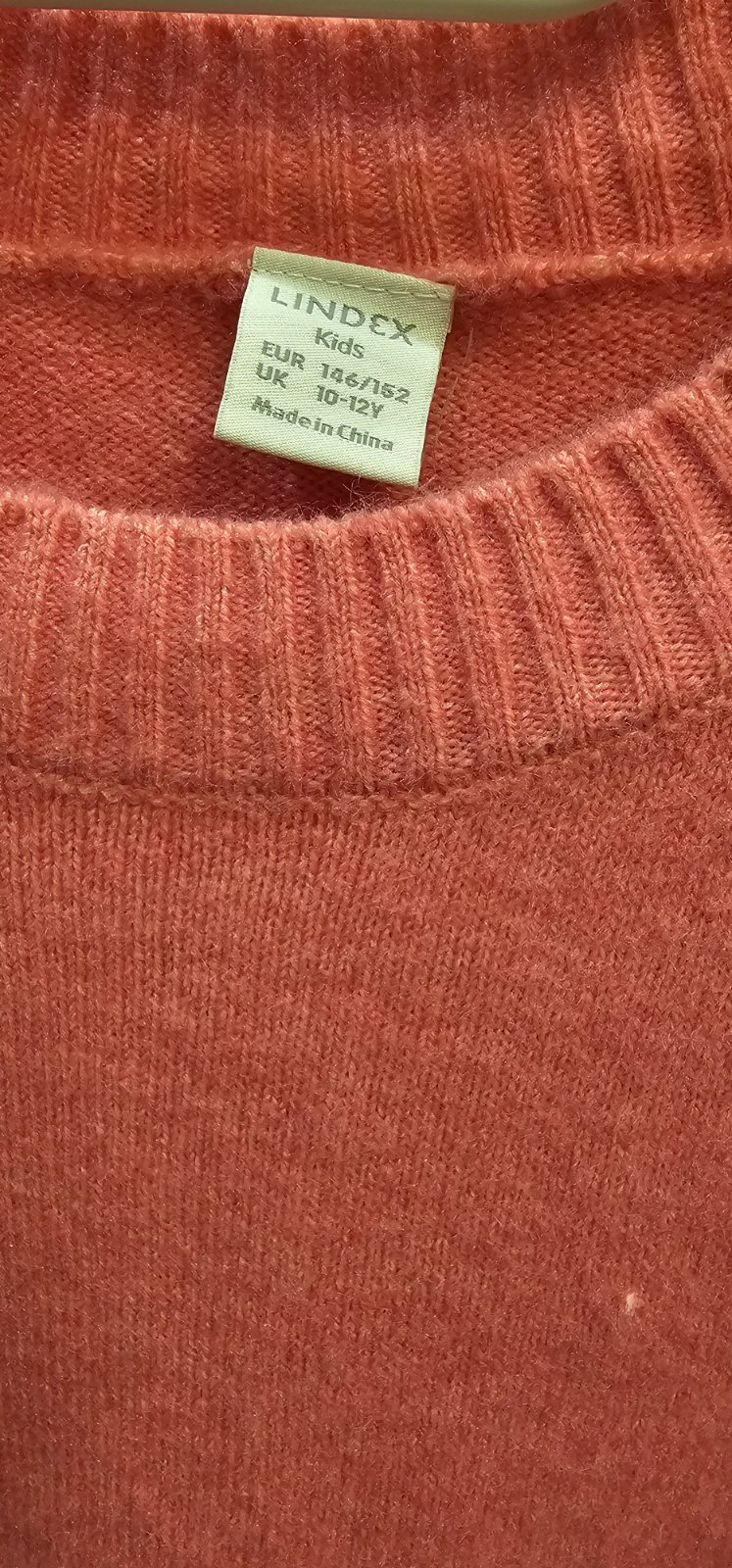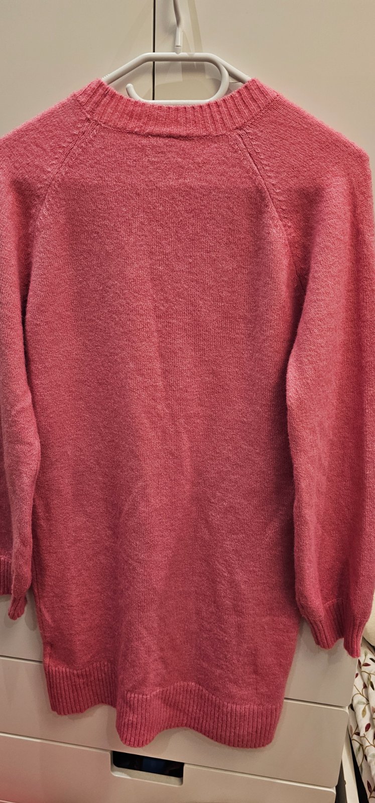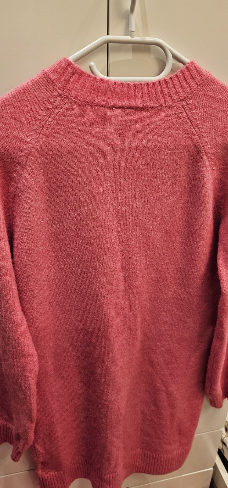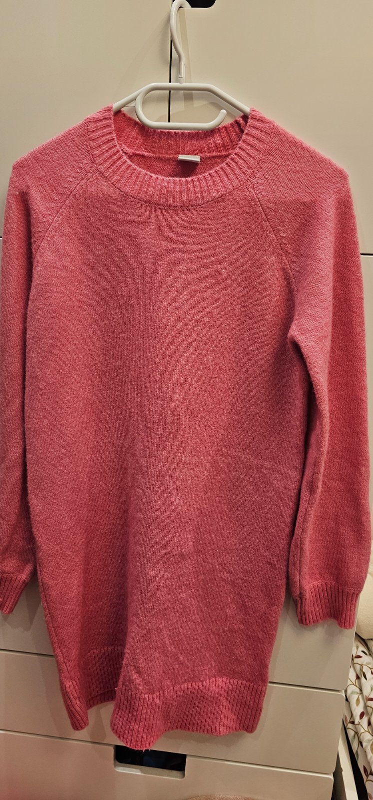 Tenšie pletené šaty voľného strihu. Na rukávoch a na spodnom okraji širší patent. Na štítku veľkosť 146/152, ale určite väčšie. Premerajte.