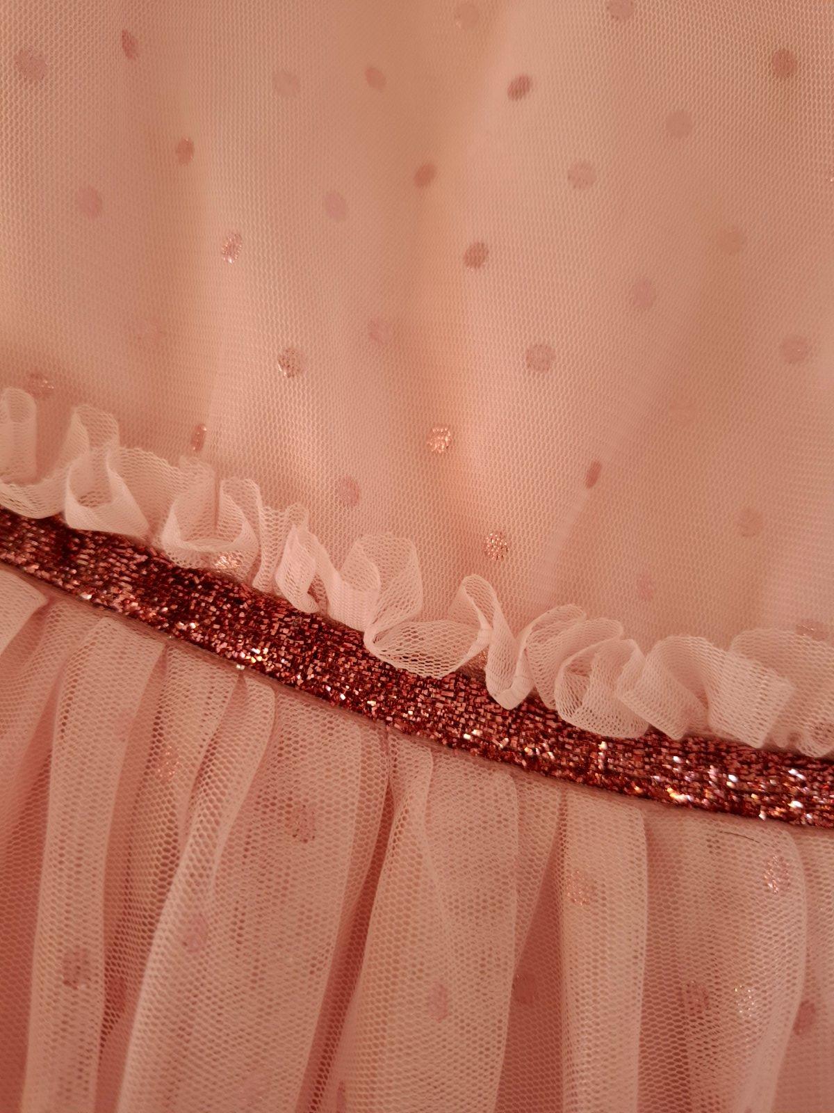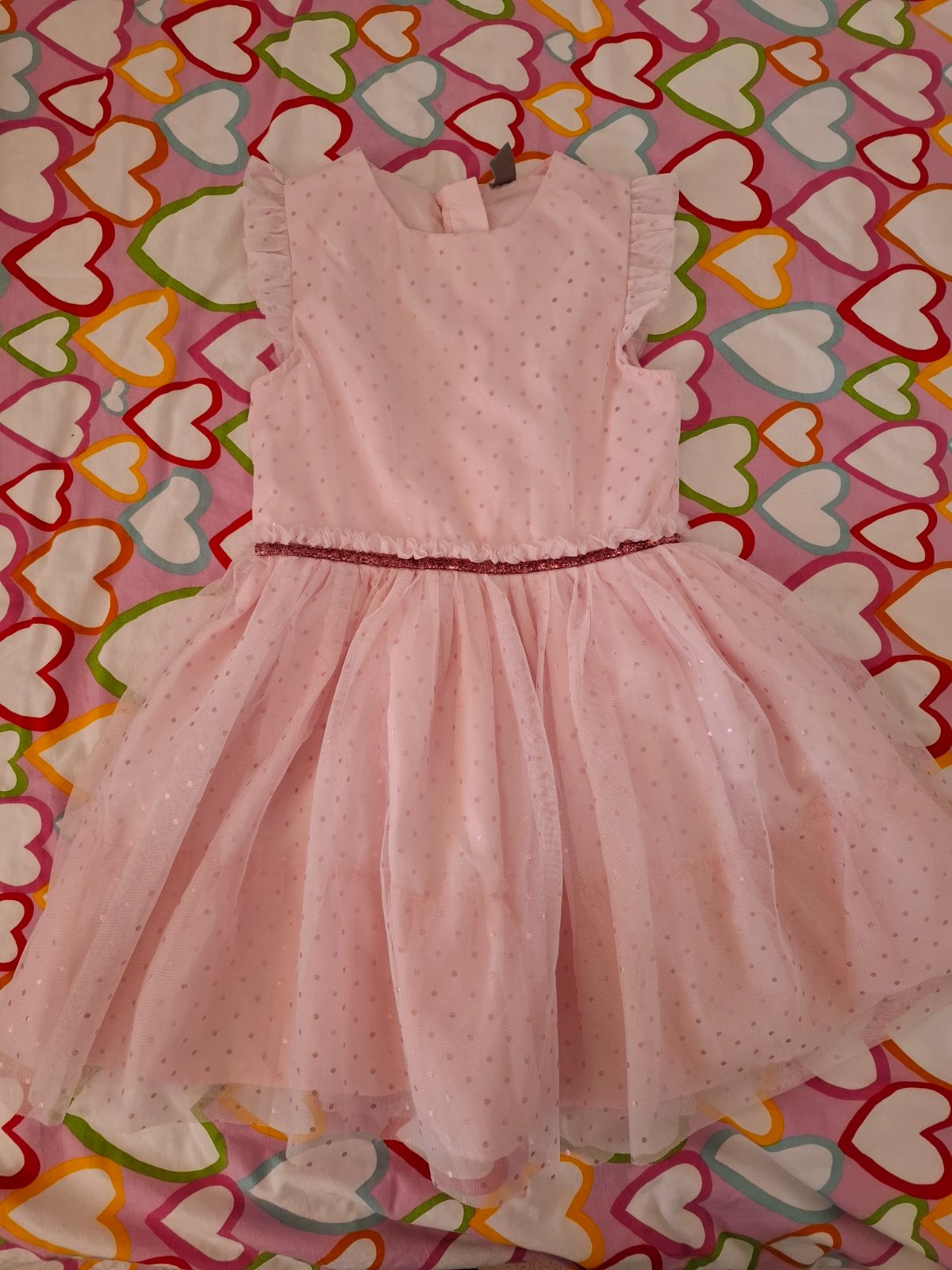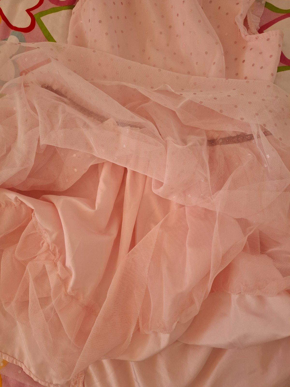 Krásne slávnostné a nielen to šatôčky pre malú slečnu. Podšité zvnútra saténom a zvonku jemná sieťovinka s lesklými bodkami. Veĺmi efektné. Dĺzka 77cm,šírka 33x2cm a otvor rukávu 17cm. Sukňa začína po 30cm od krku.