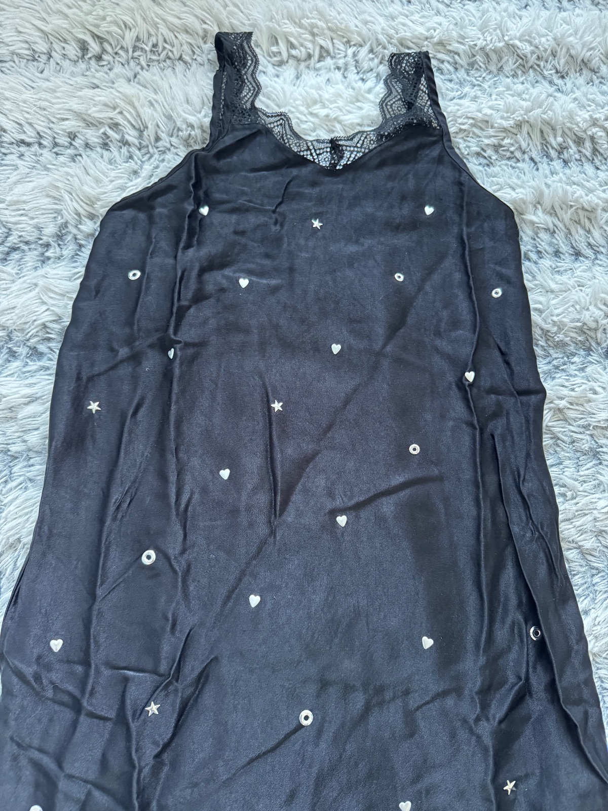 Šaty bez poškodenia, ľahké, vzdušné, s podšívkou, prešívané zlatou niťou, strih do A. Šírka cez prsia 2x46cm, dĺžka 95cm.