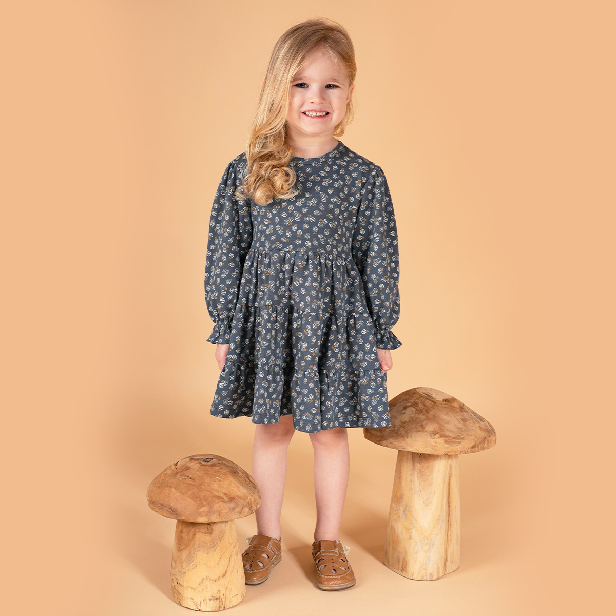 Šaty s dlhým rukávom, rukávy v spodnej časti ukončené gumou, ktorá dodáva riasený efekt. V spodnej časti šiat sú tiež volány.