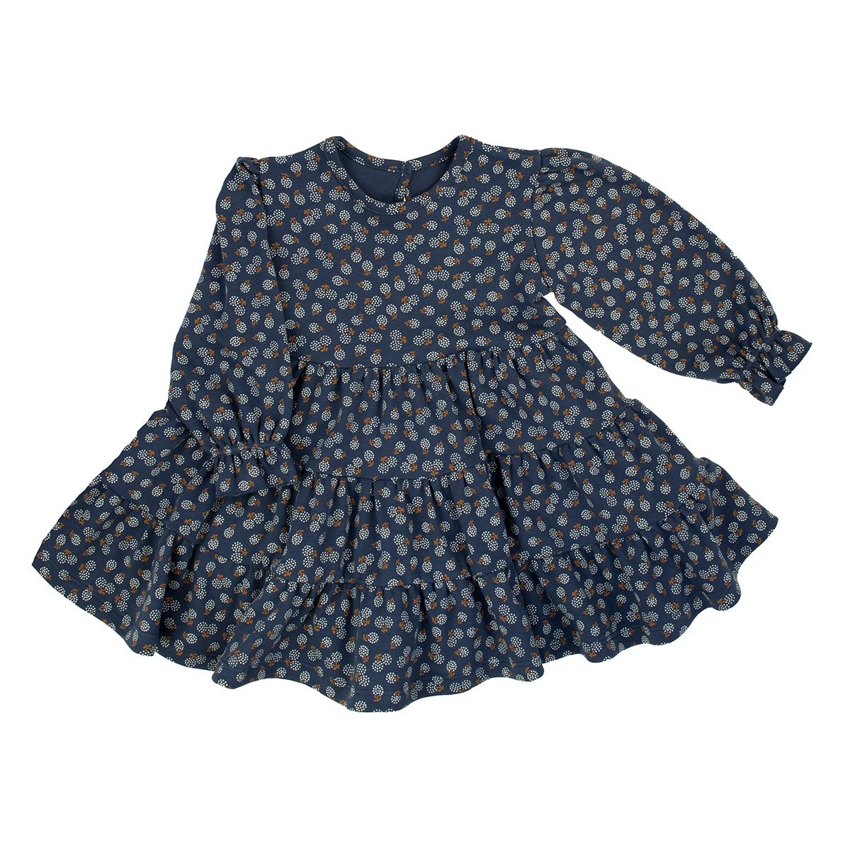 Krásne šaty z tmavomodrej bavlny s kvetinovým vzorom.