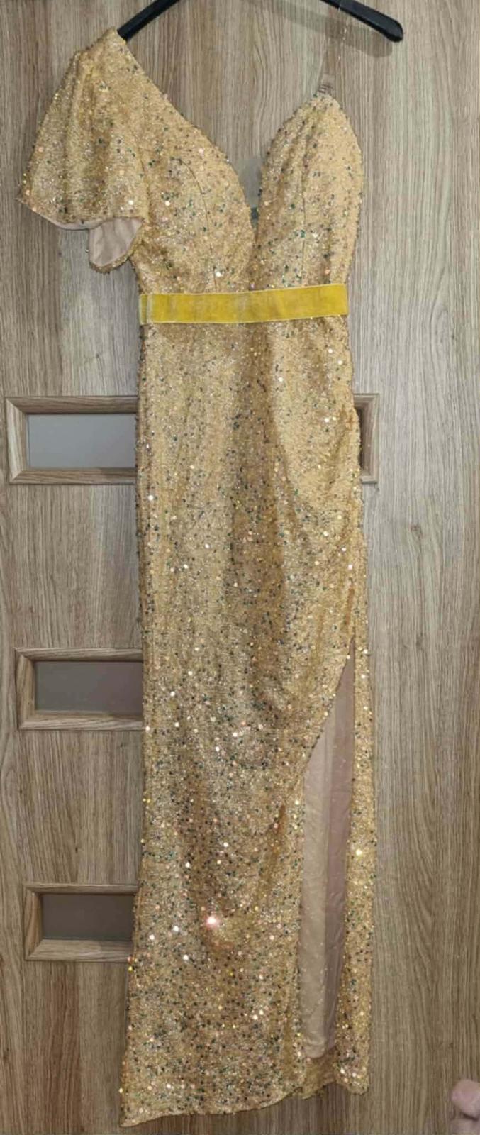 Krasne zlate saty, šité krajčirkou na mieru. Maju jemnu vlečku vzadu. Lahučke ako pierko. Sedia n XS-S. Top stav krasne sa lesknu. Mne su už malé :-(