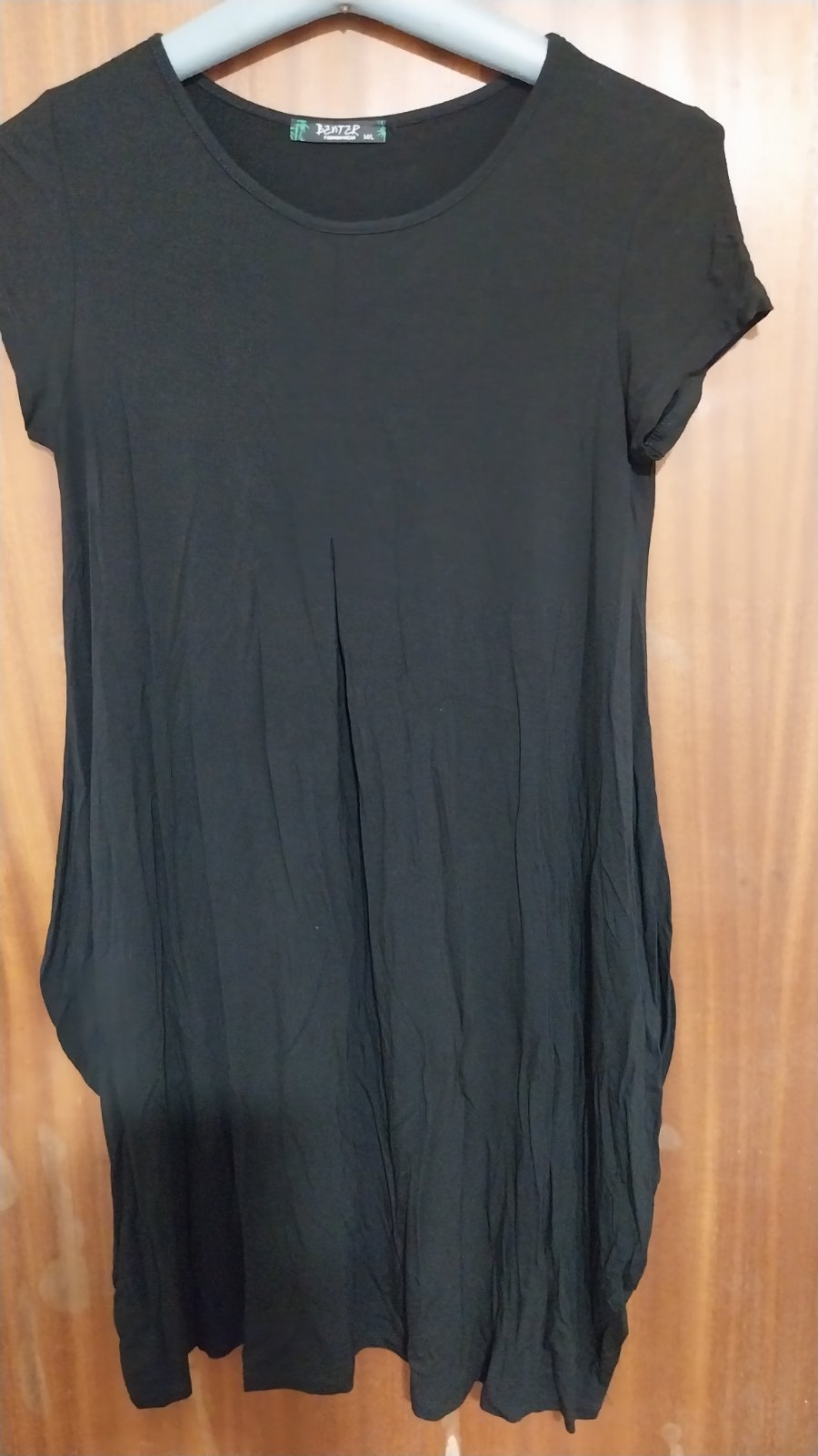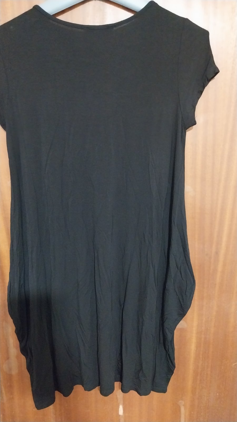 Čierne jednoduché tričkové šaty. Farba je pekná sýty - zle sa to fotí. Ležerný "oddychový" štýl. Vptredu je taká "záložka"