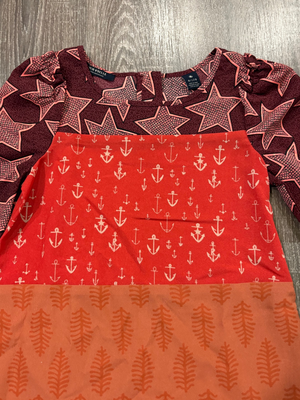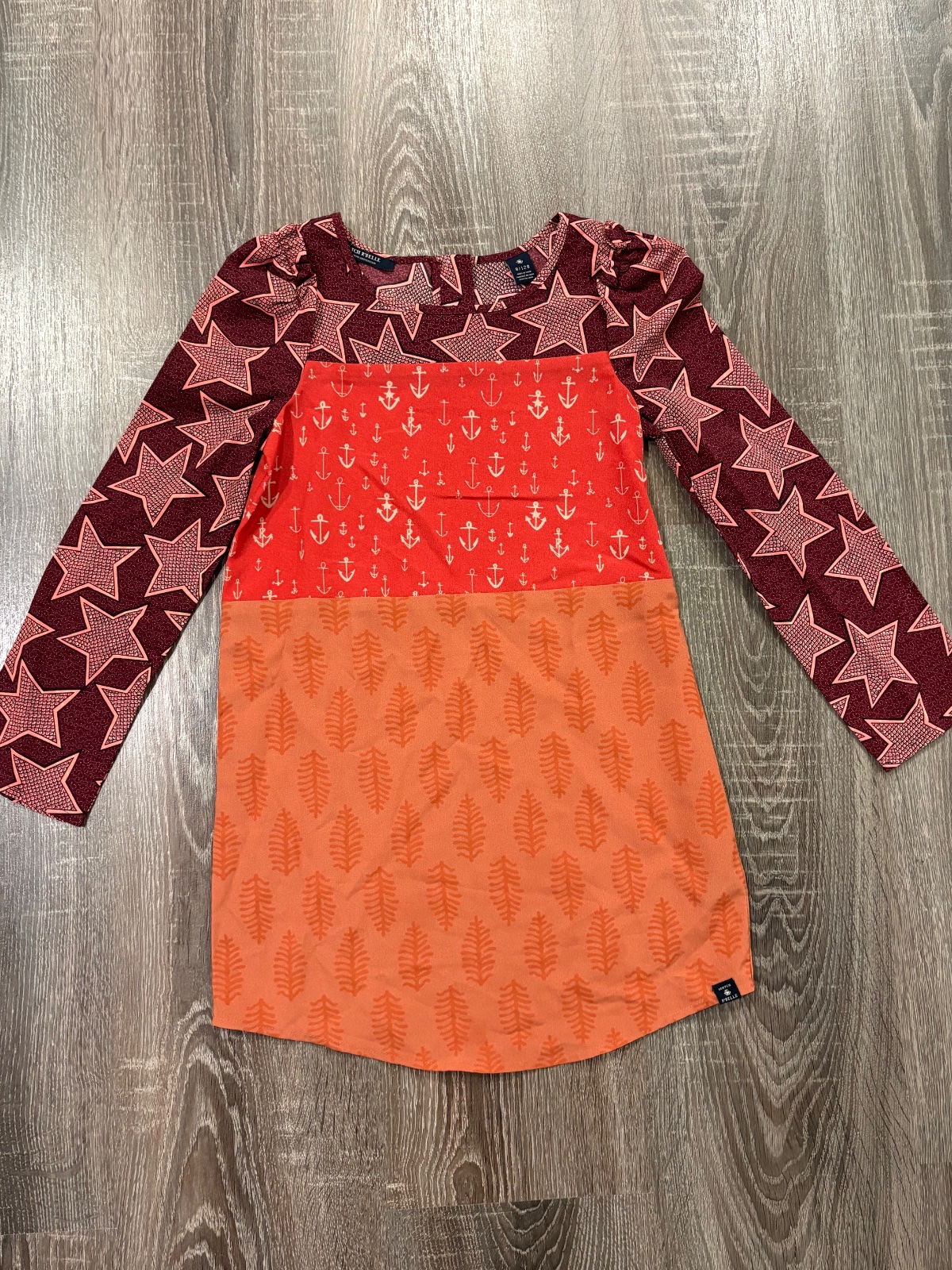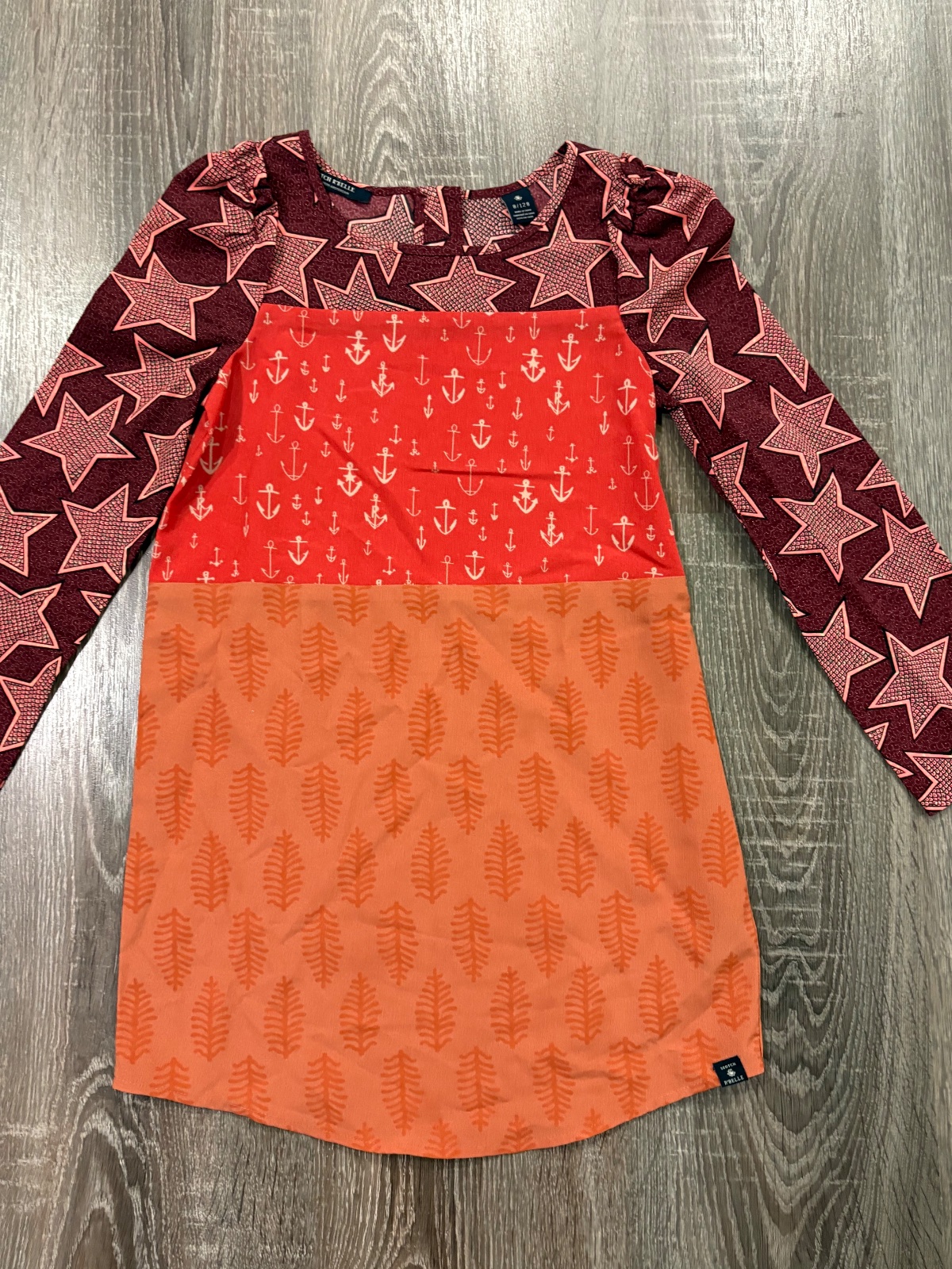 2.Krasne dizajnové šaty značky Scotch R'Belle vo velkosti 128, v 100% stave, zapínanie vzadu na zips, dlžka je 64cm, dlžka rukava od krku je 55cm a širka v podpazuší je cca 36x2cm