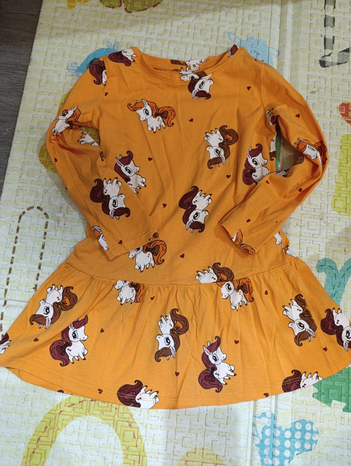 Šaty s dlhým rukávom v dobrom stave, bez poškodení. Fialové a sivé sú Gate, oranžové Takko. Všetko veľkosť 110 a cena spolu 6€.