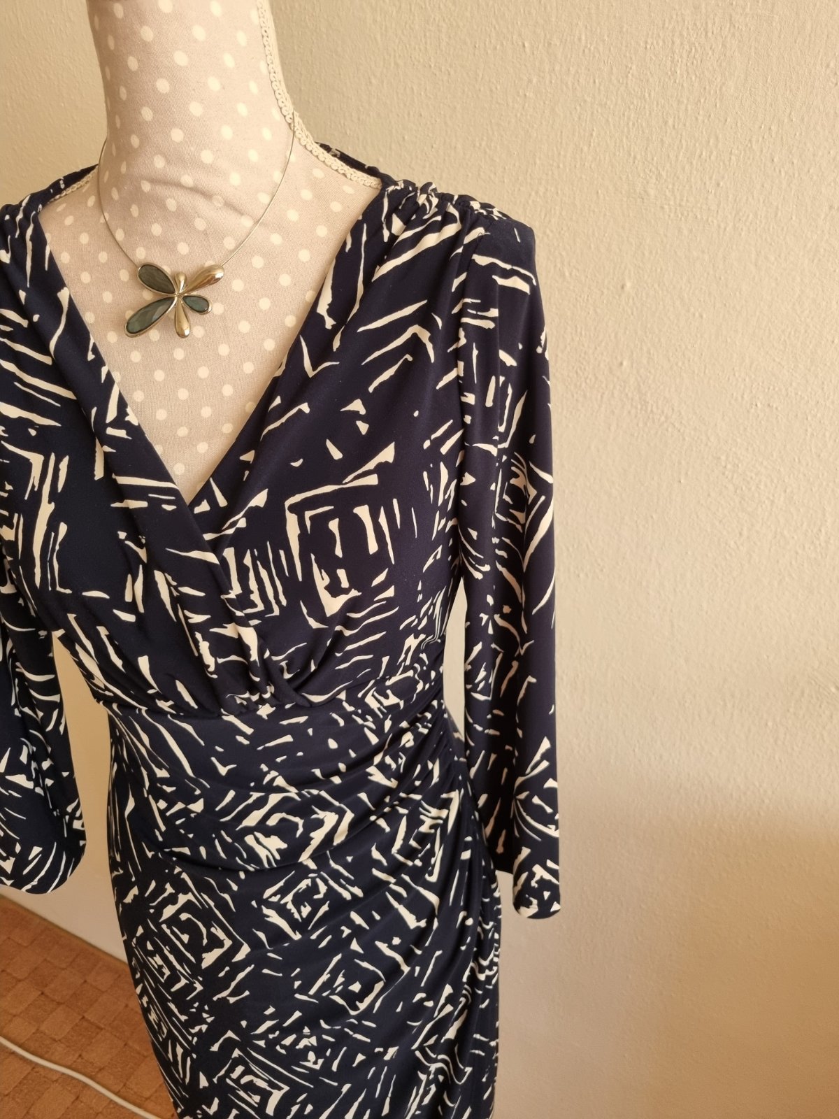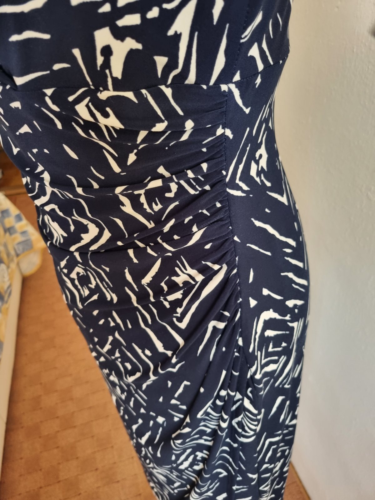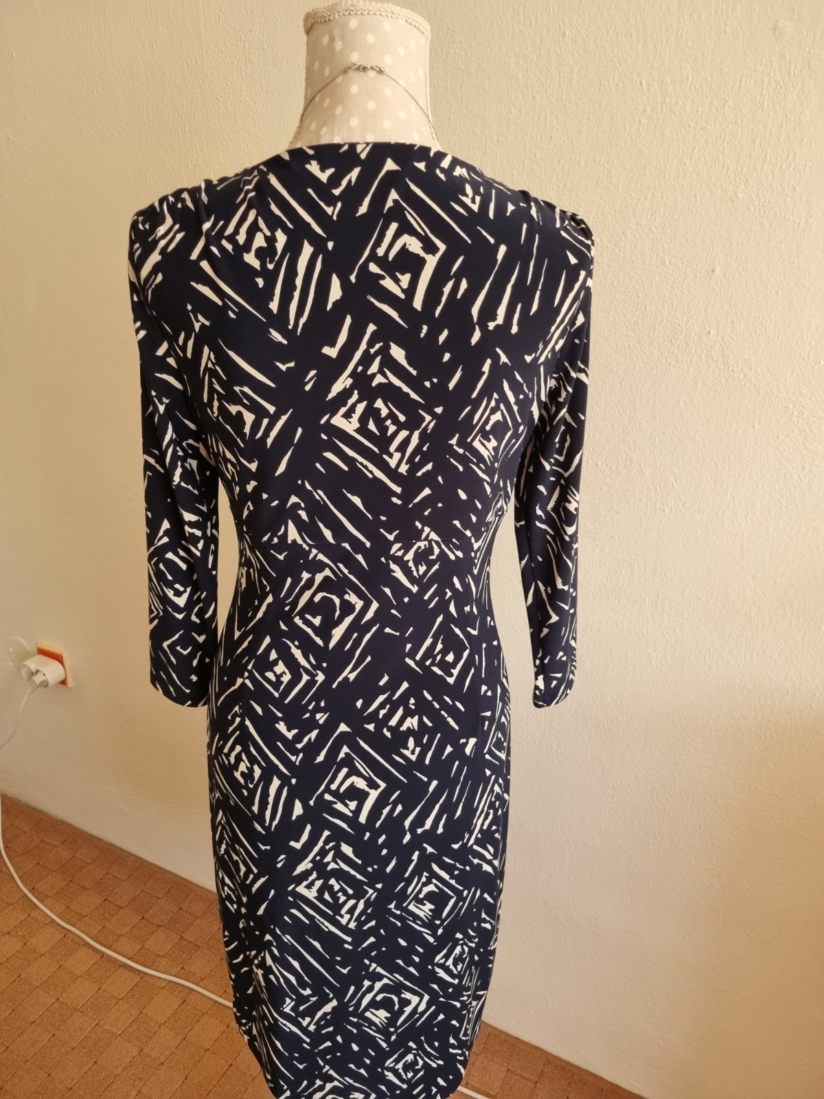 1x oblečené, elastické, 3/4 rukáv, podšité, modrý podklad, biely vzor...bokom , dlžka od ramena 103 cm, prsia 46x2, pás 38x2, boky 47x2, rukáv od krku 56..PC vysoká, už ich neoblečiem posúvam...sú v 100 % stave ako z obchodu